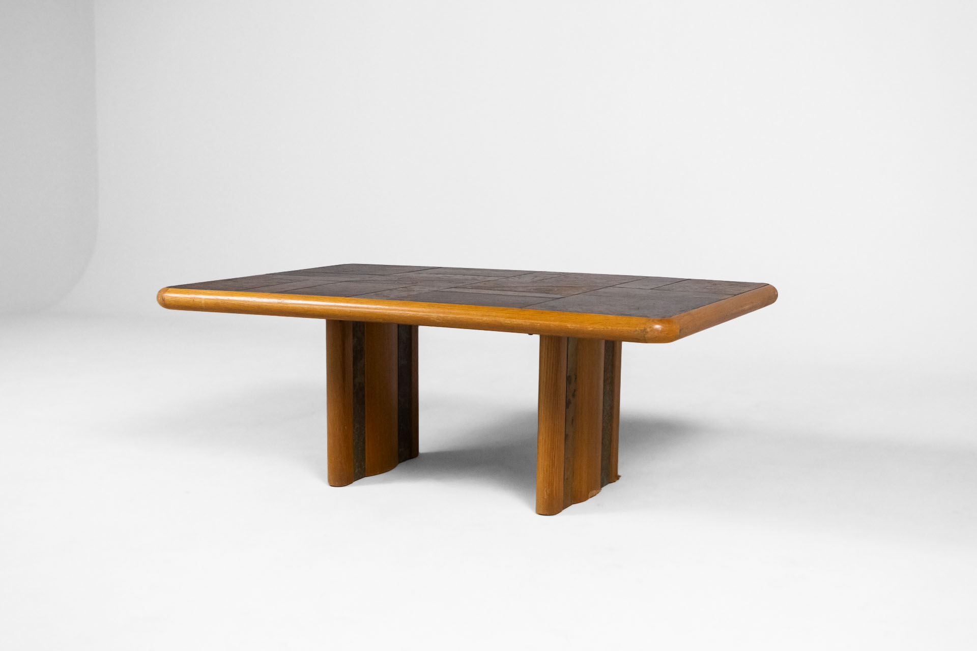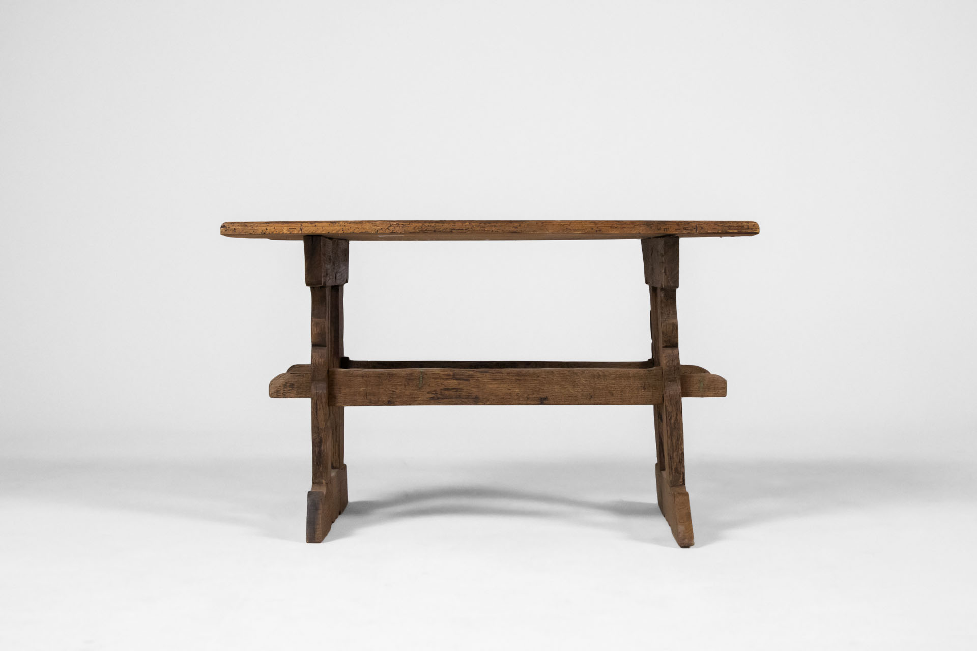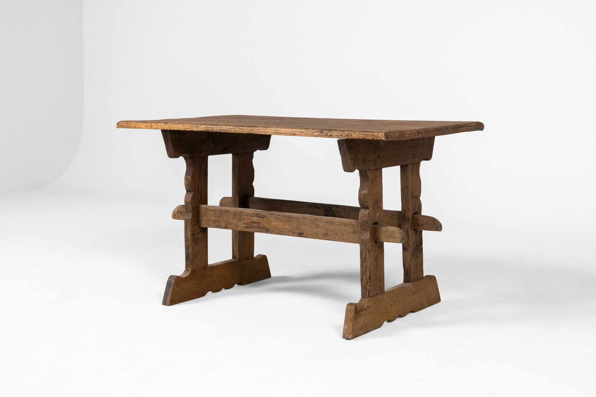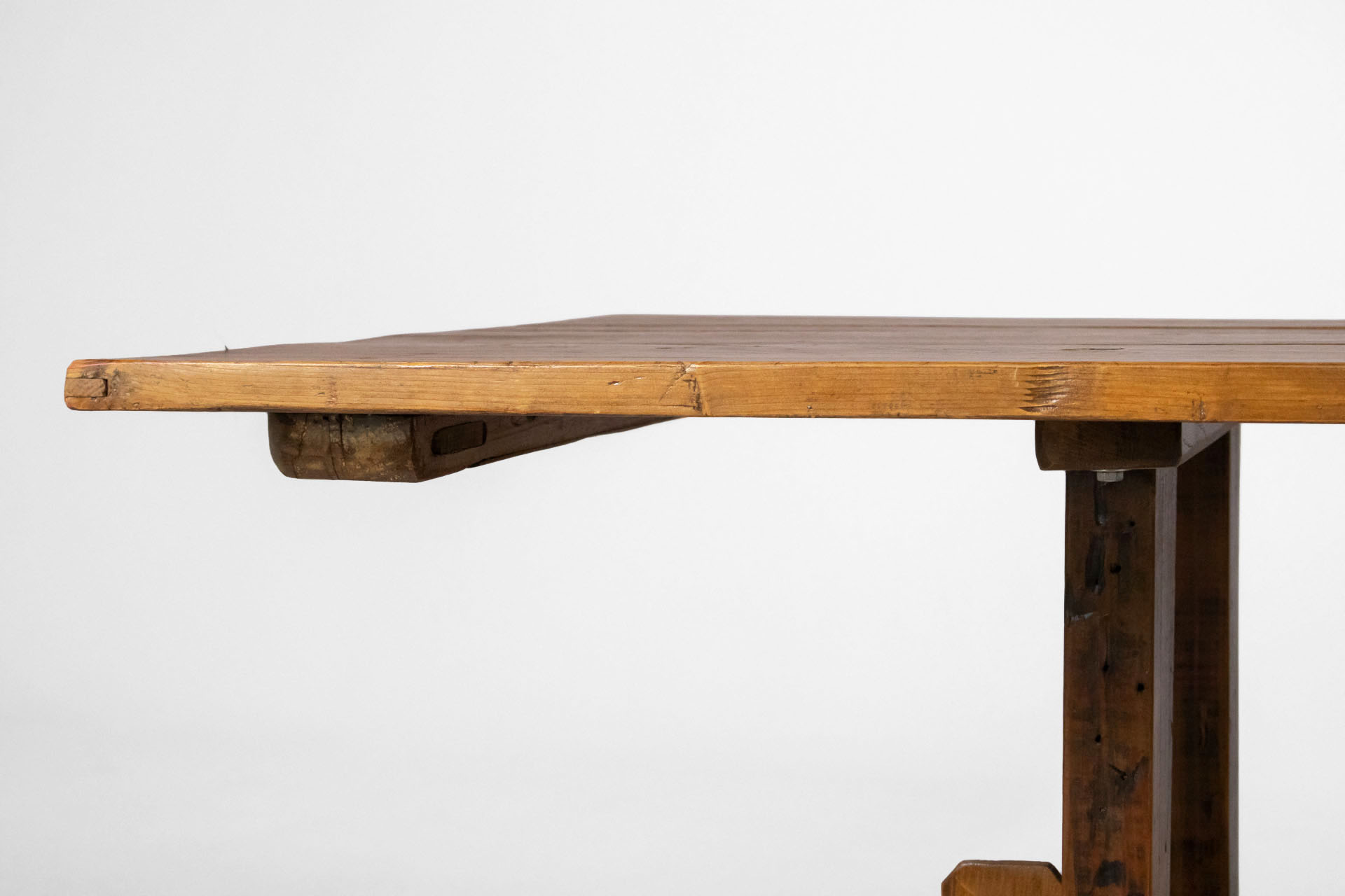 Masszív, rusztikus stílusú faasztal, széles, téglalap alakú asztallappal és erős, geometrikus formájú lábakkal, amely a vidéki otthonok vagy tökéletes kiegészítője lehet