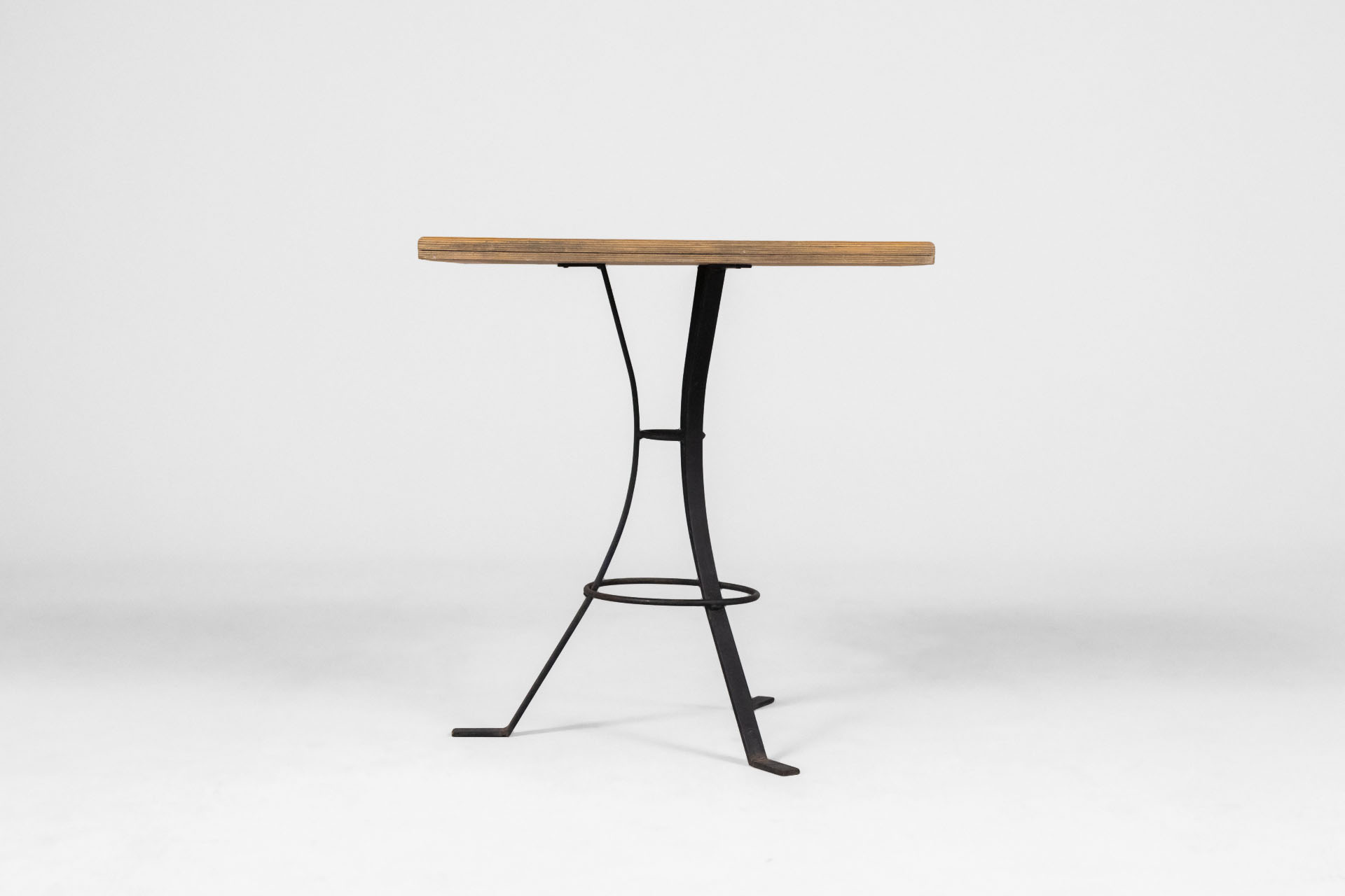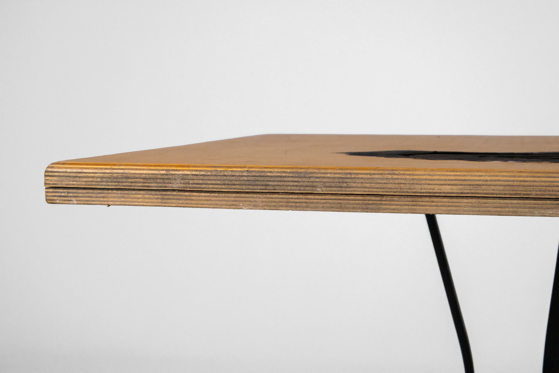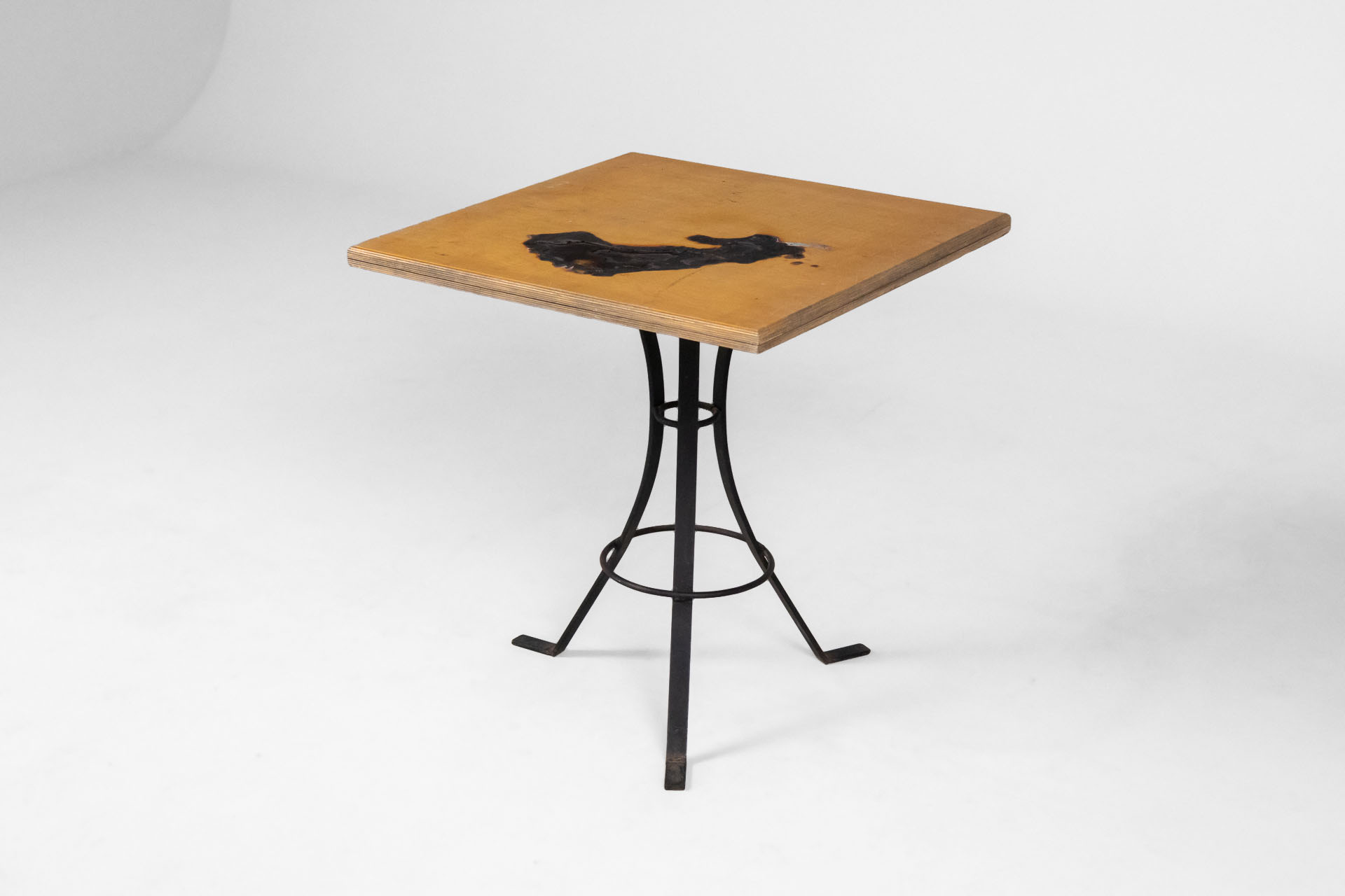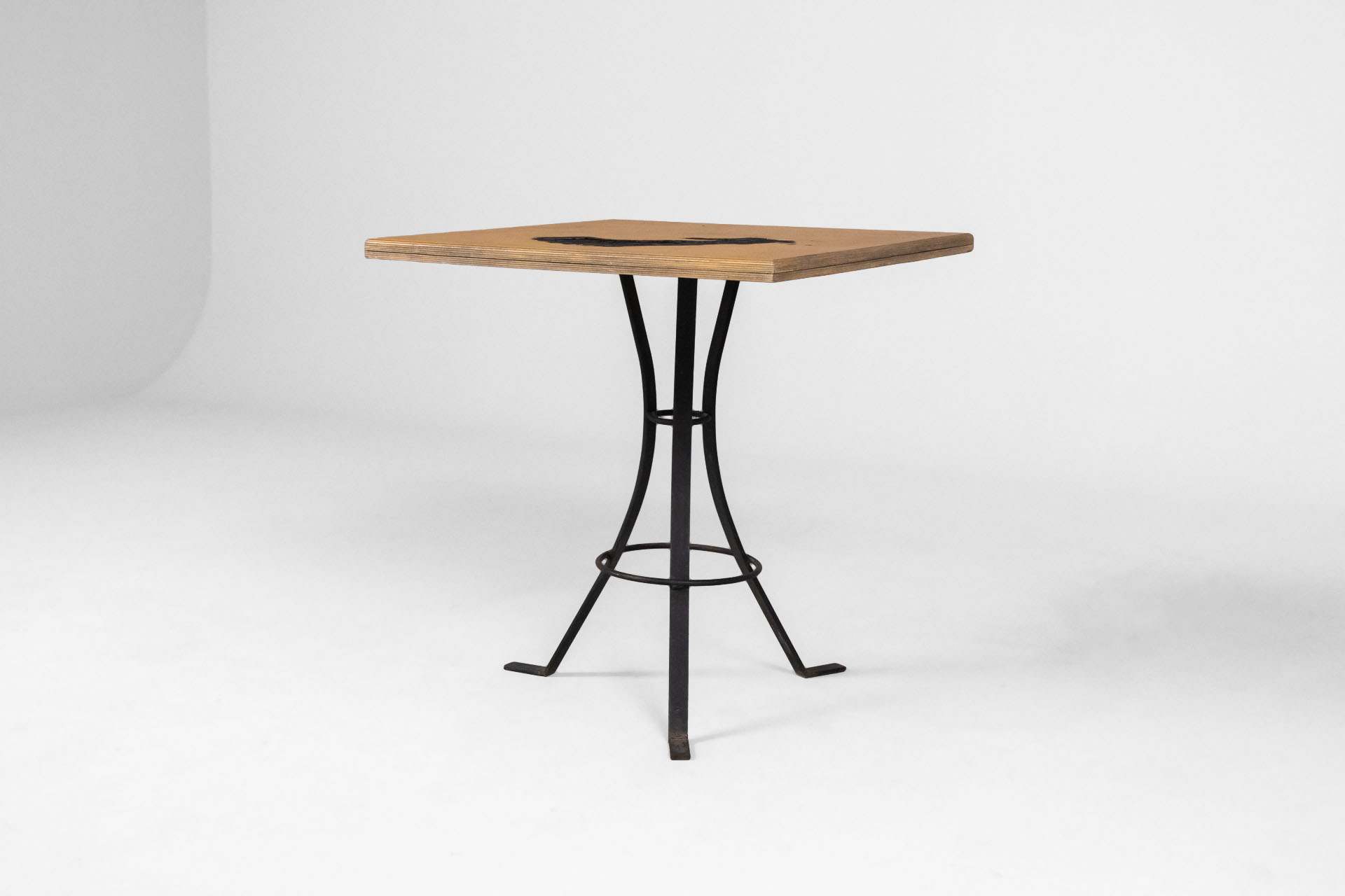 Négyzet alakú asztal, fából készült asztallappal és fekete fém lábakkal