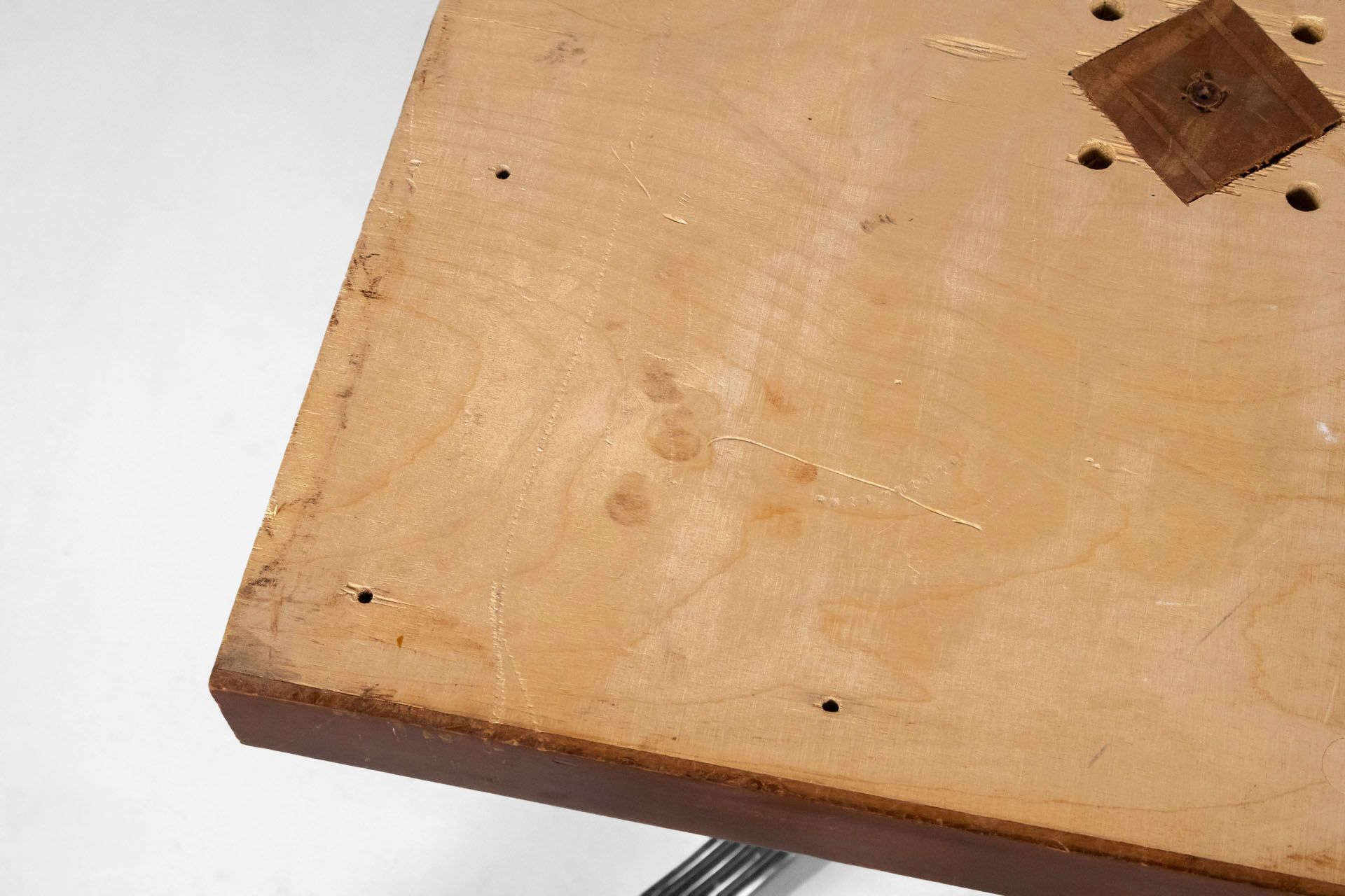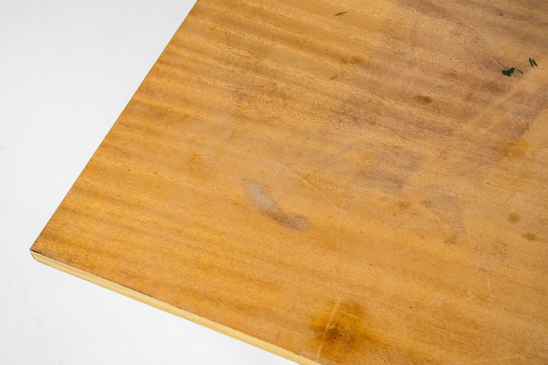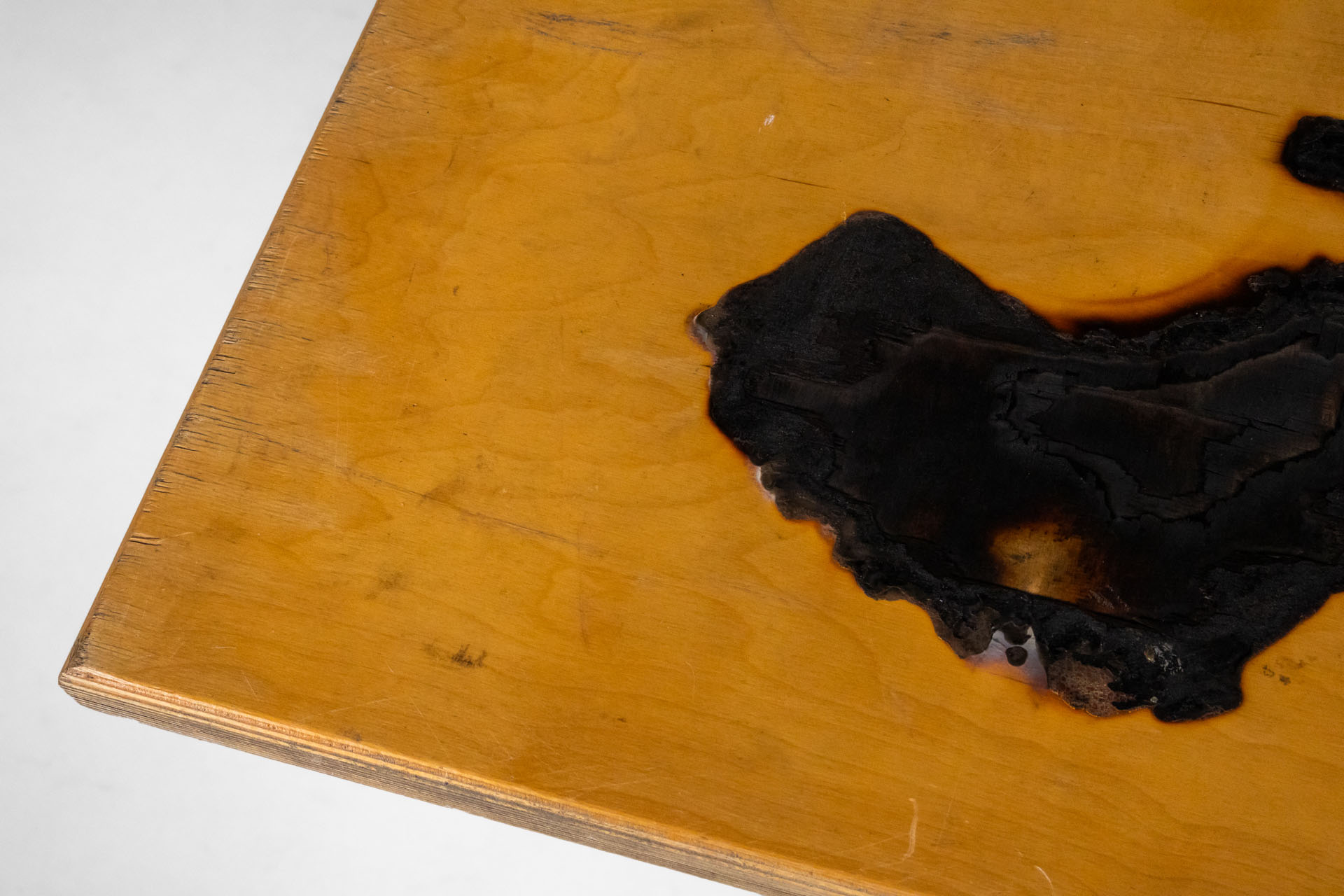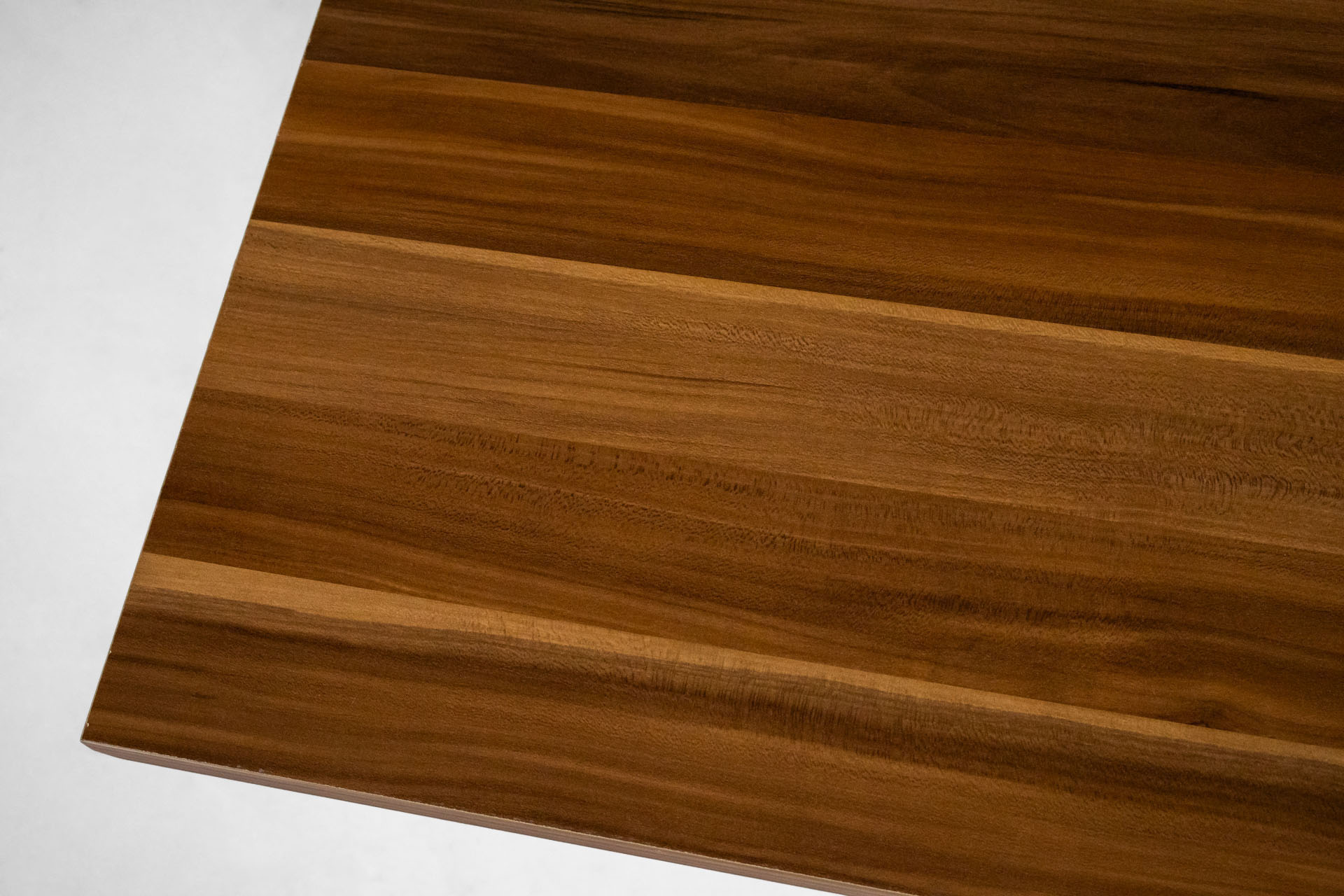 Négyzet alakú asztal, fából készült asztallappal és fekete fém lábakkal