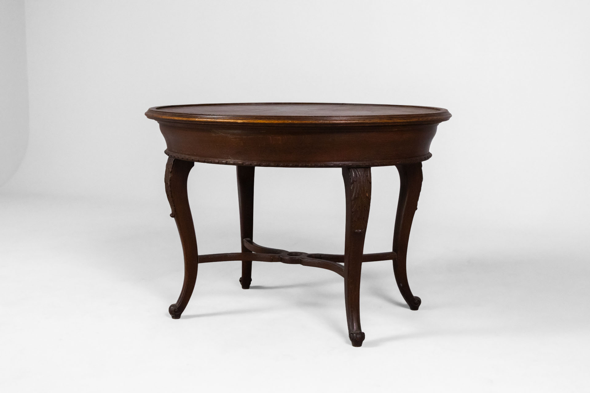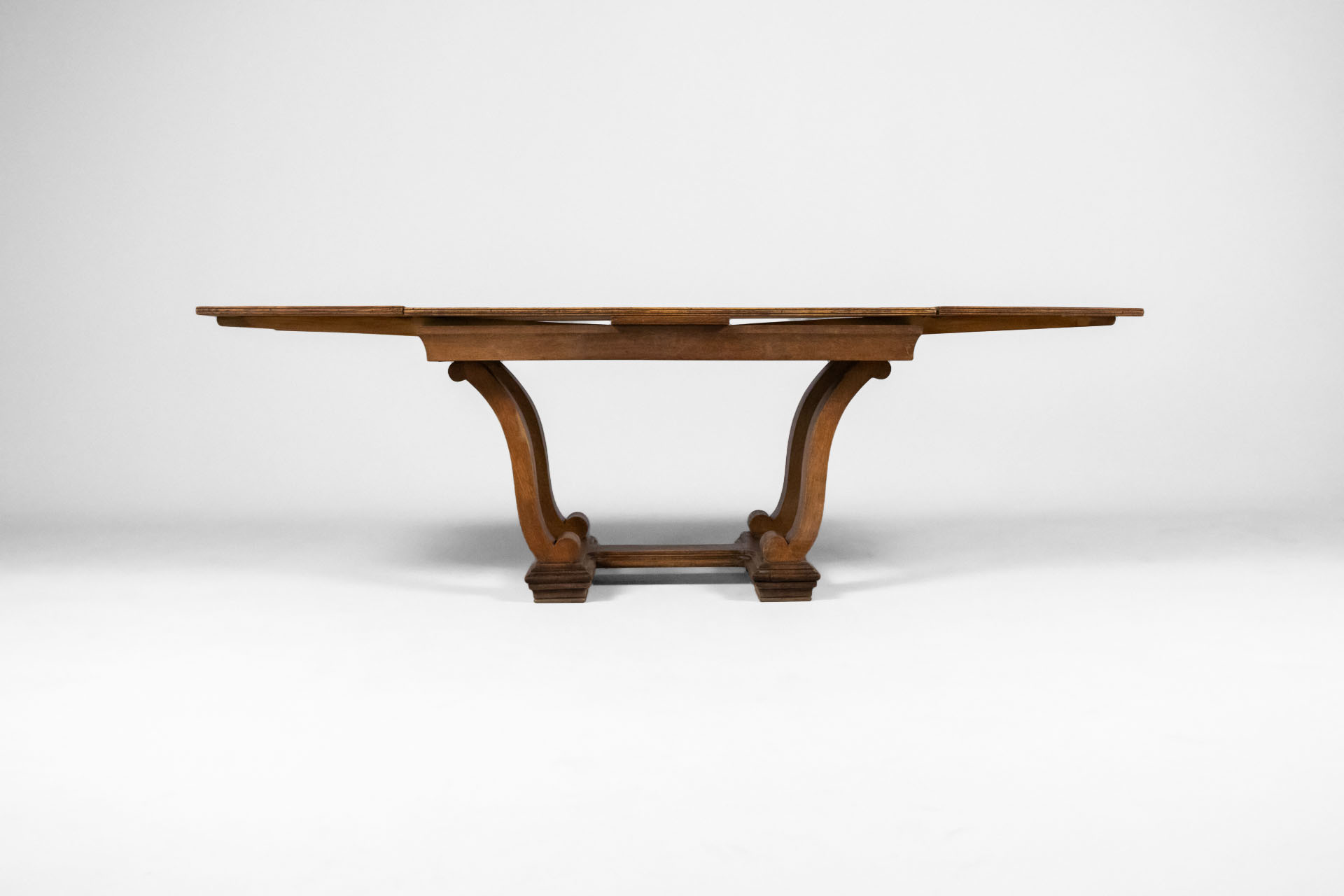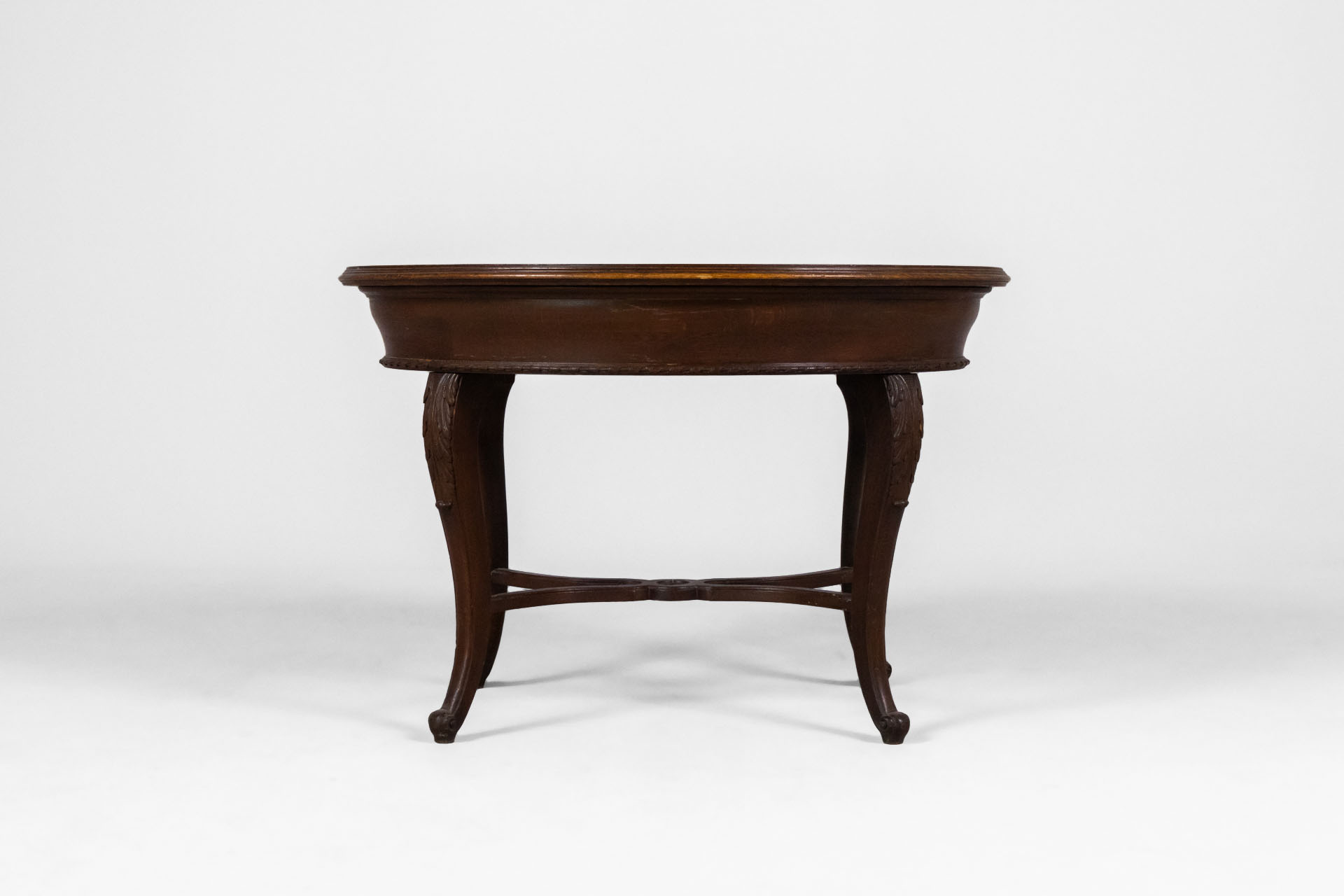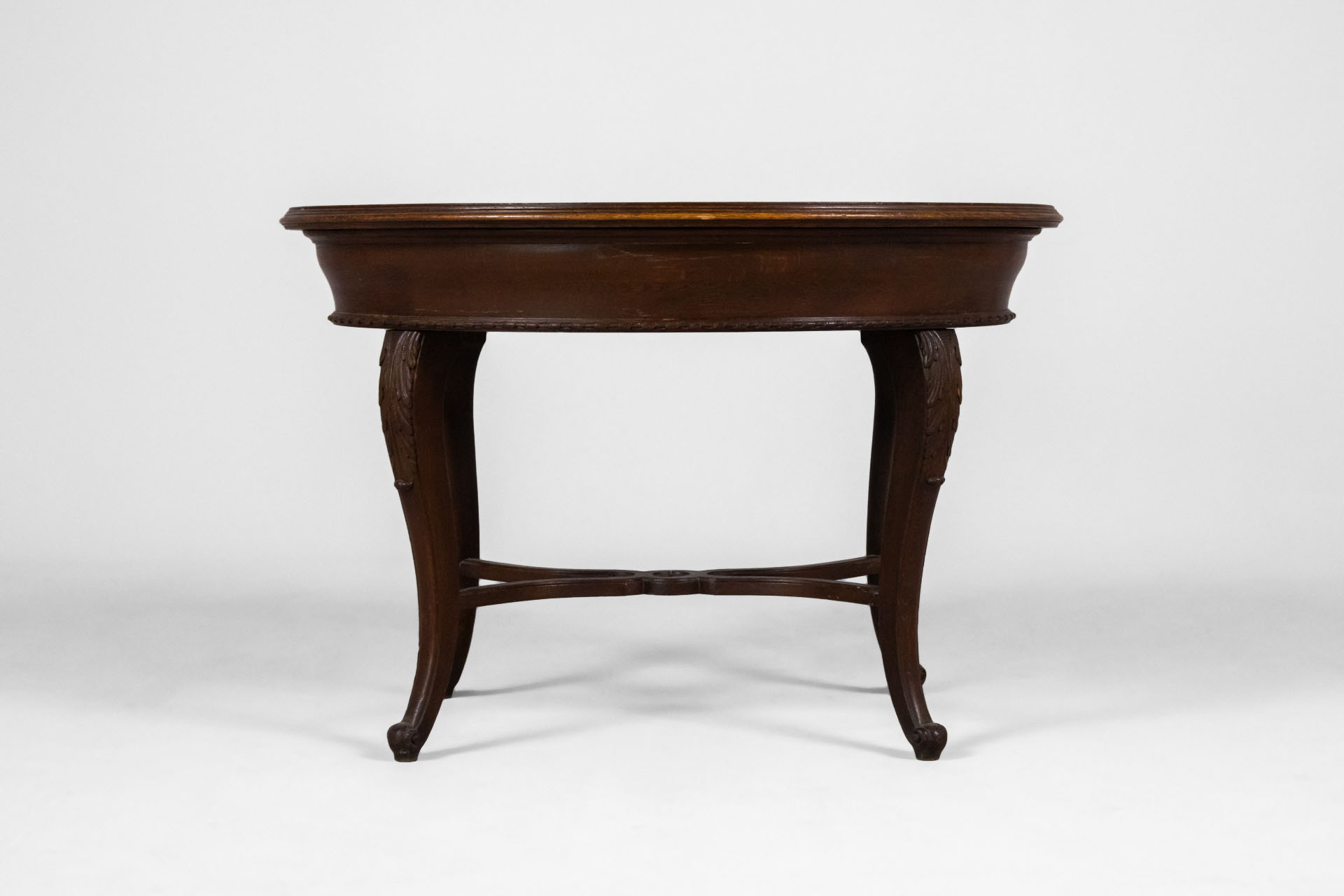 Elegáns asztal faragott lábakkal és díszes középső támasztékkal