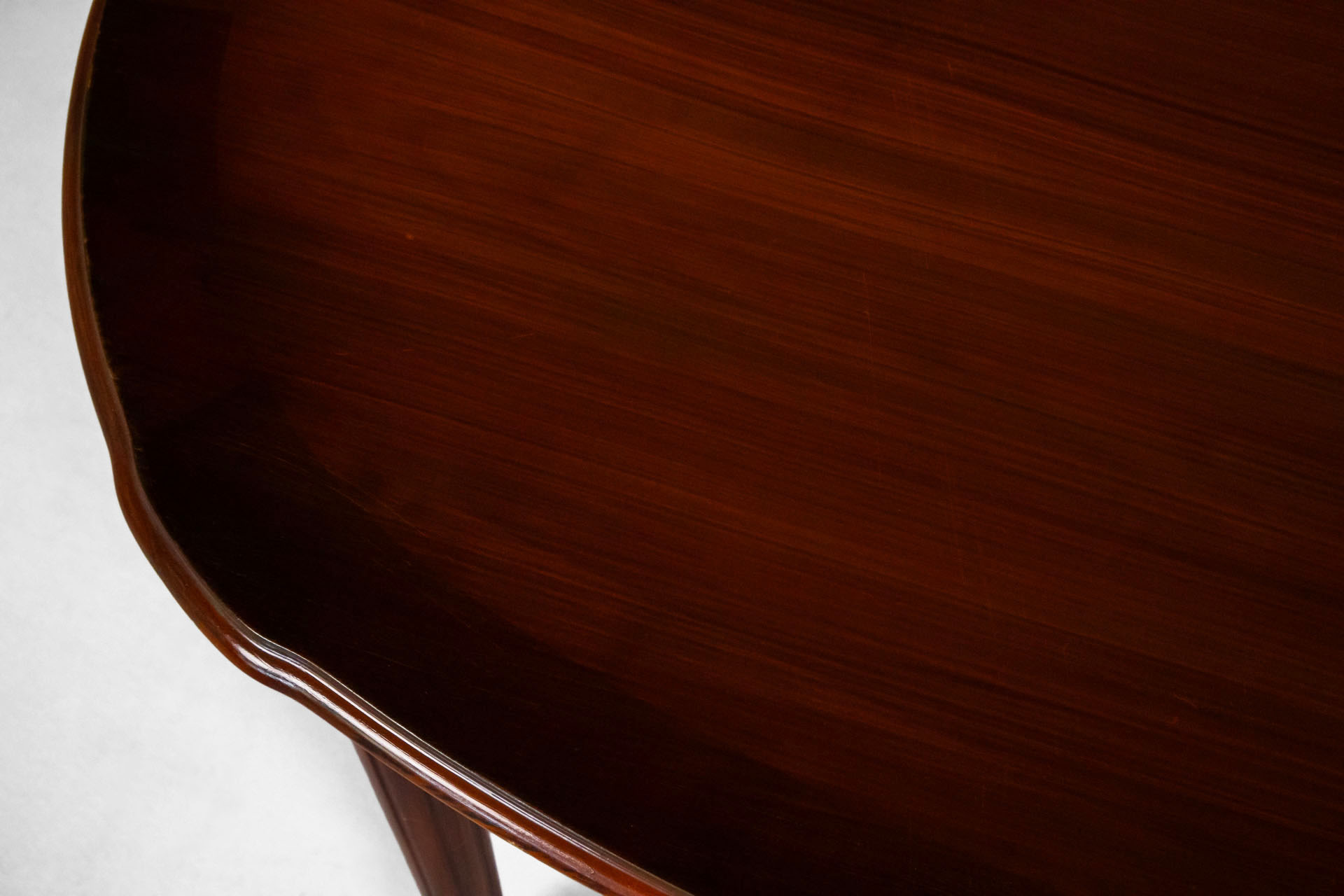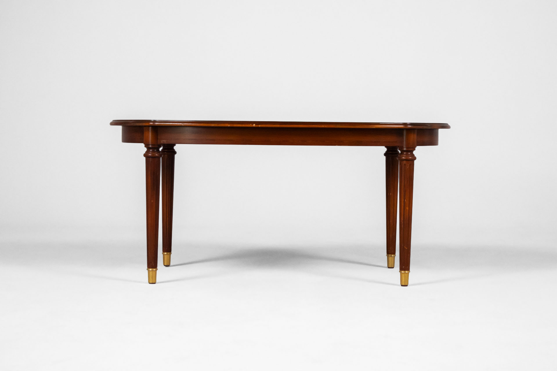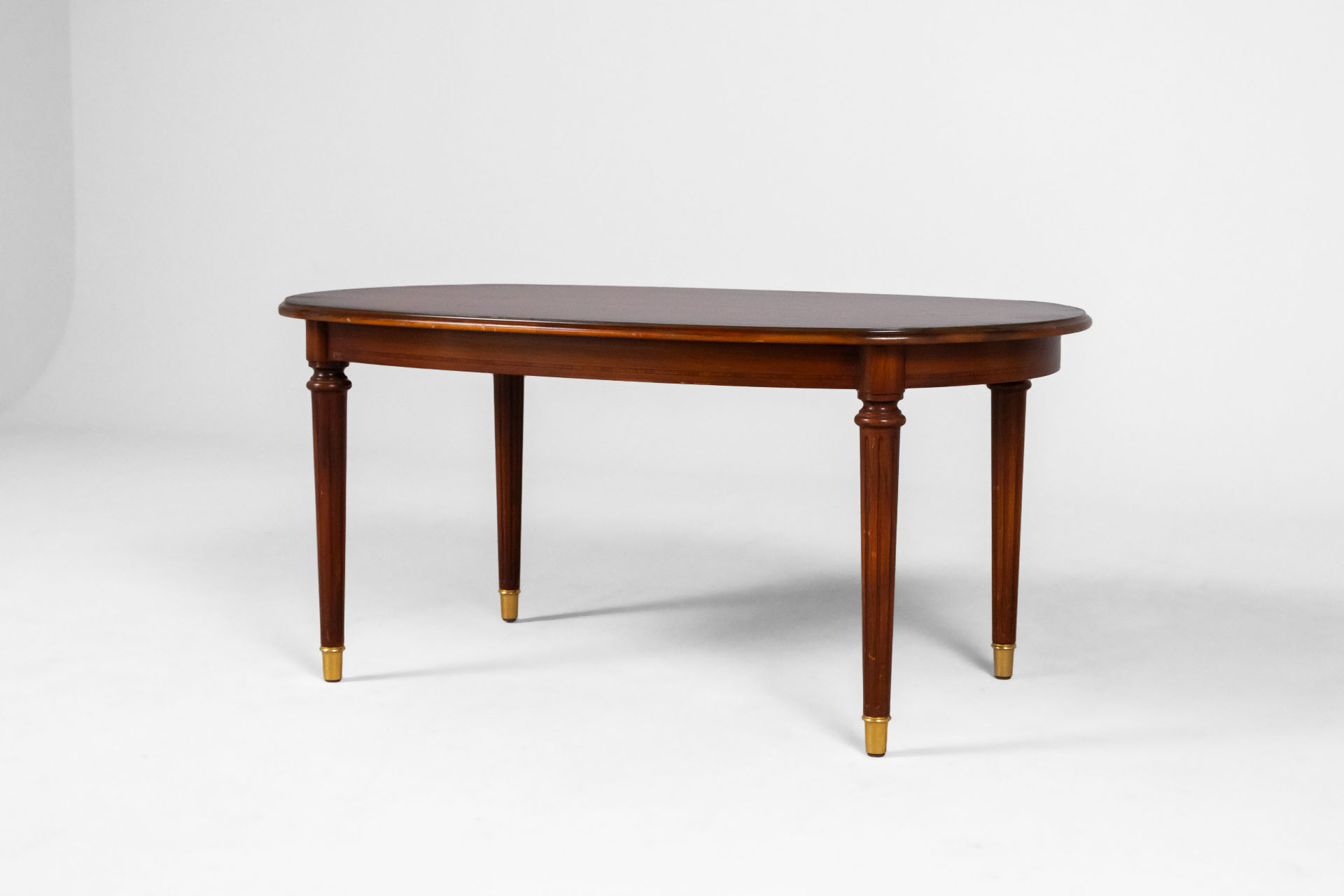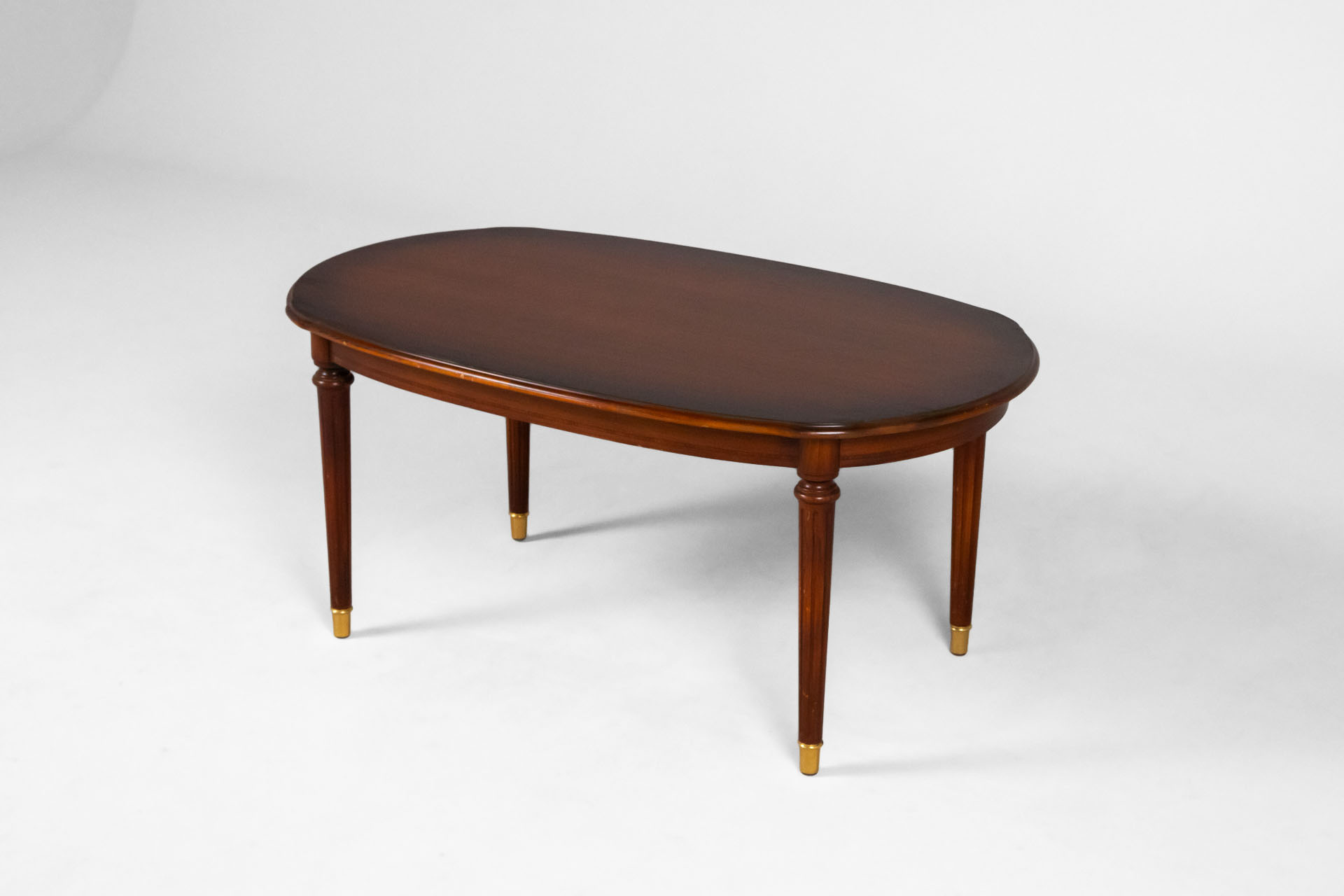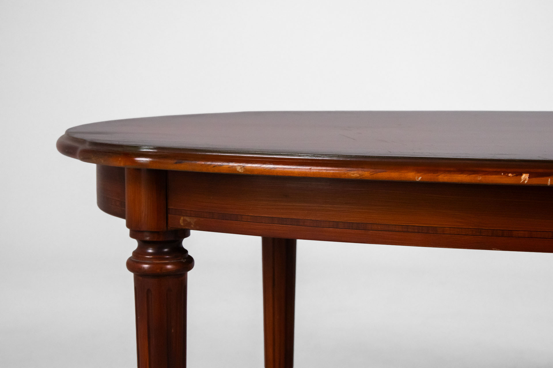 Elegáns, klasszikus stílusú, ovális formájú asztal, masszív központi lábazattal és ívelt lábakkal