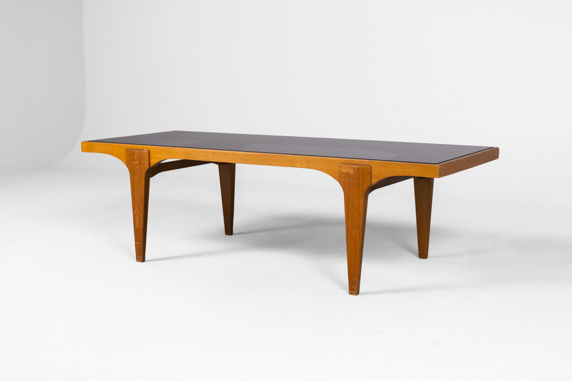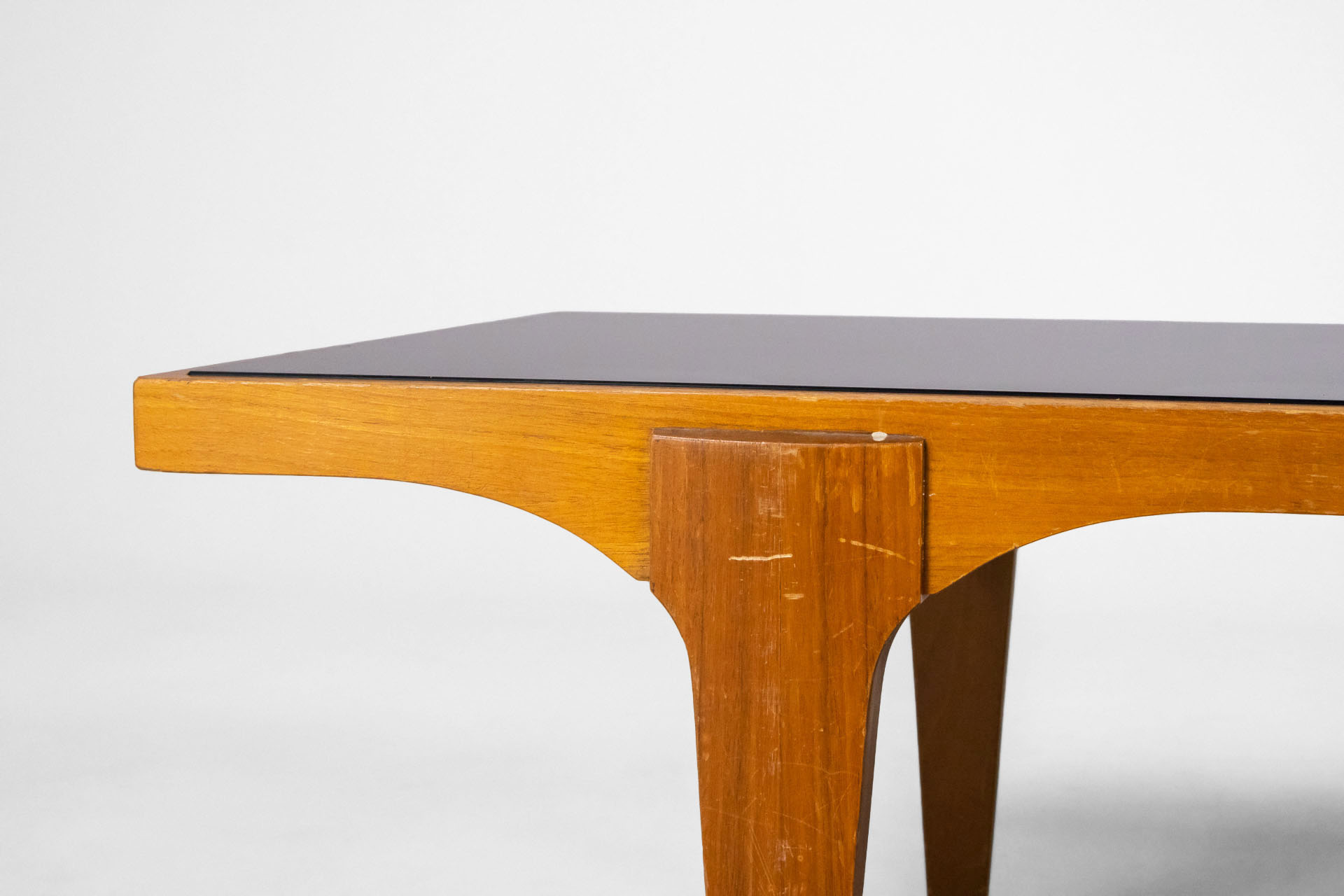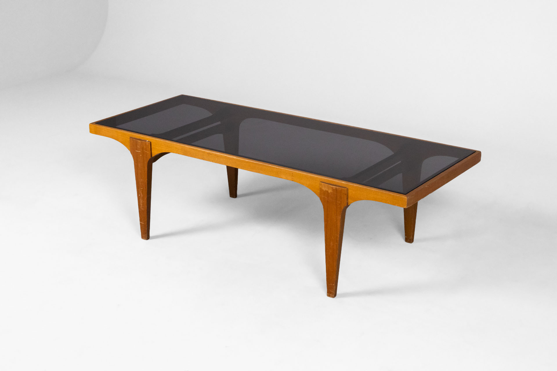 Modern dohányzóasztal világos fa kerettel és sötét üveg asztallappal