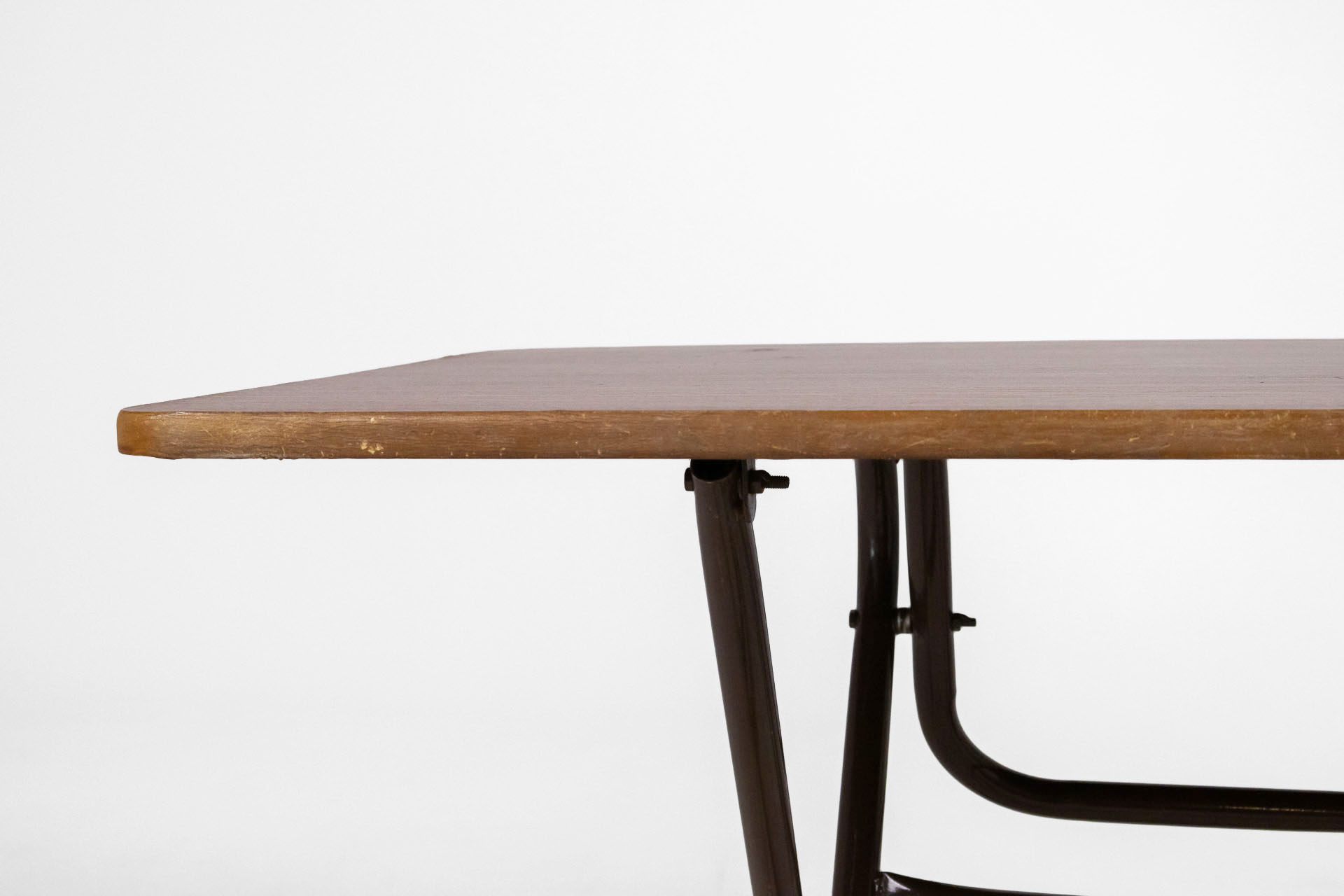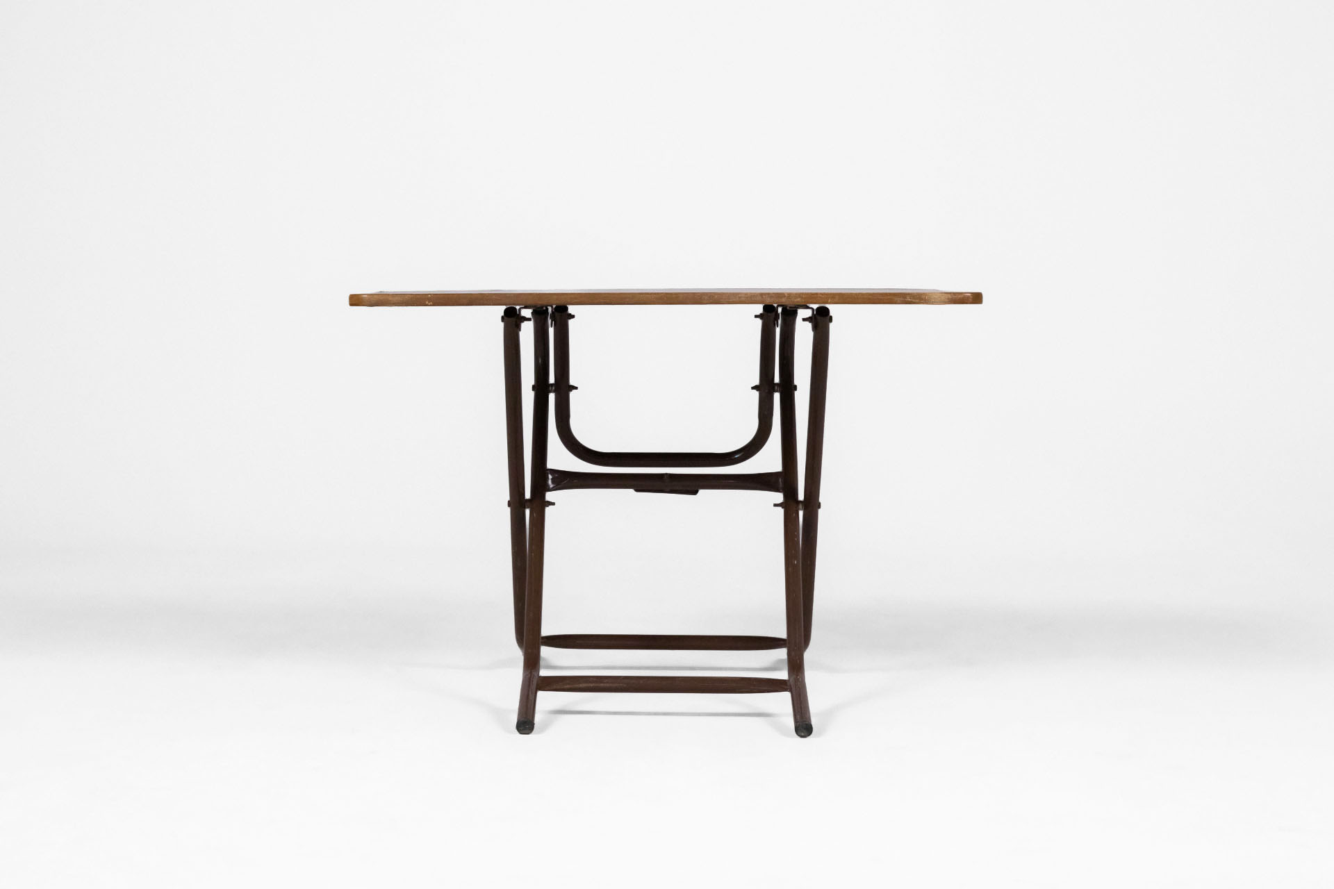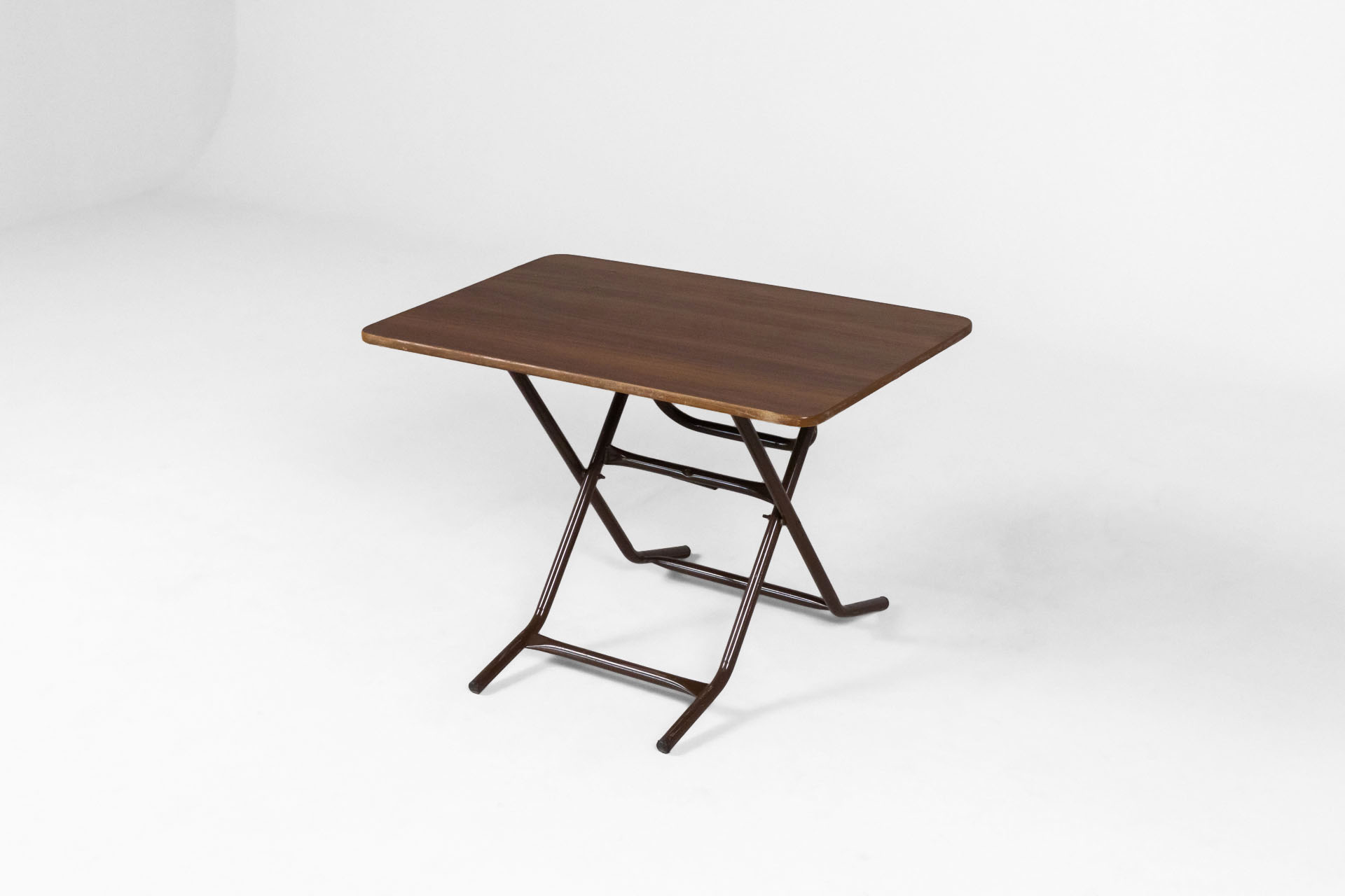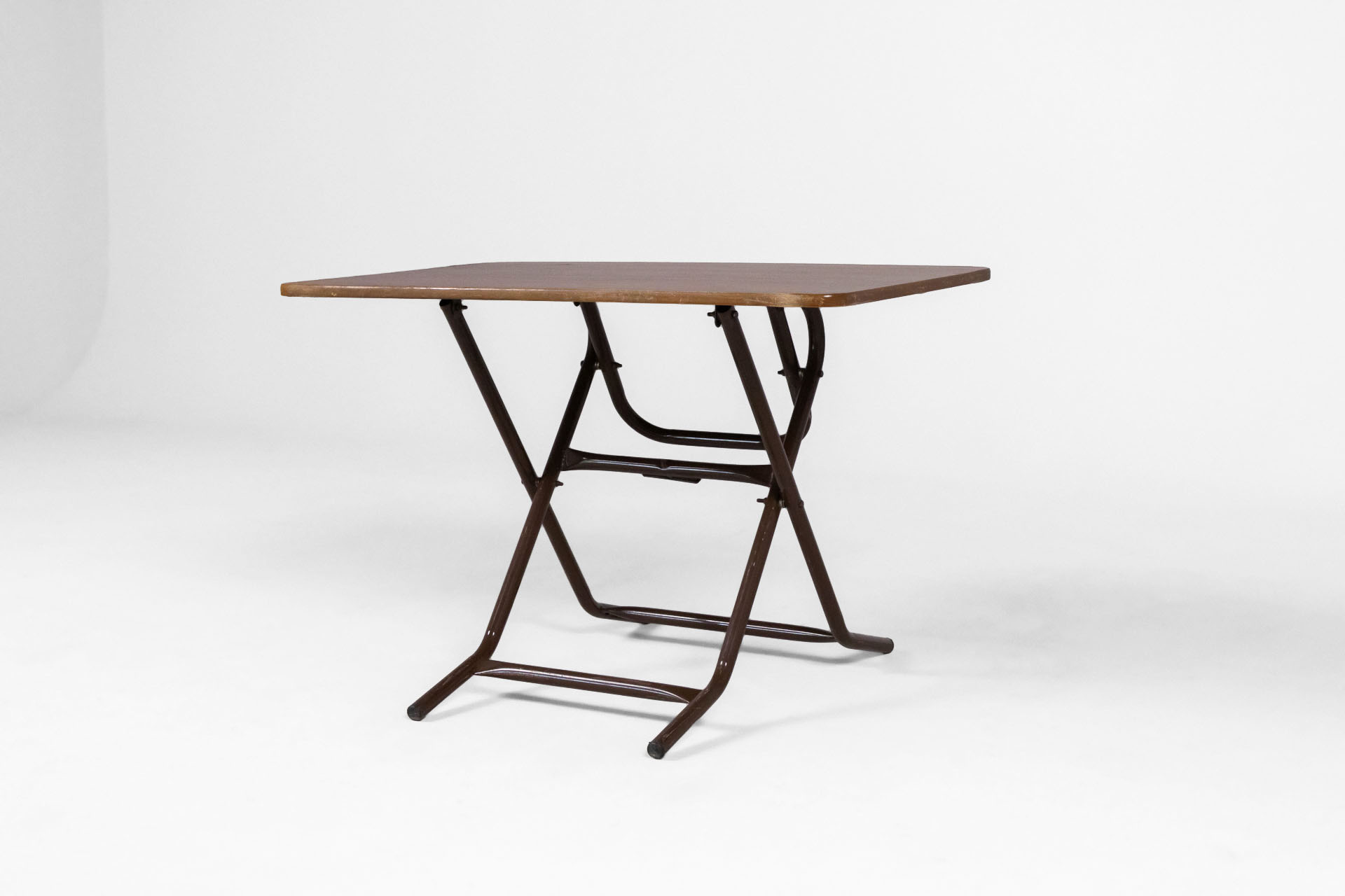 Praktikus, modern stílusú hajtható asztal, négyzetes formával, amely könnyen tárolható és szállítható. A masszív fém keret és a sima, sötétbarna asztallap kombinációja ideális választás bármilyen informális környezethez