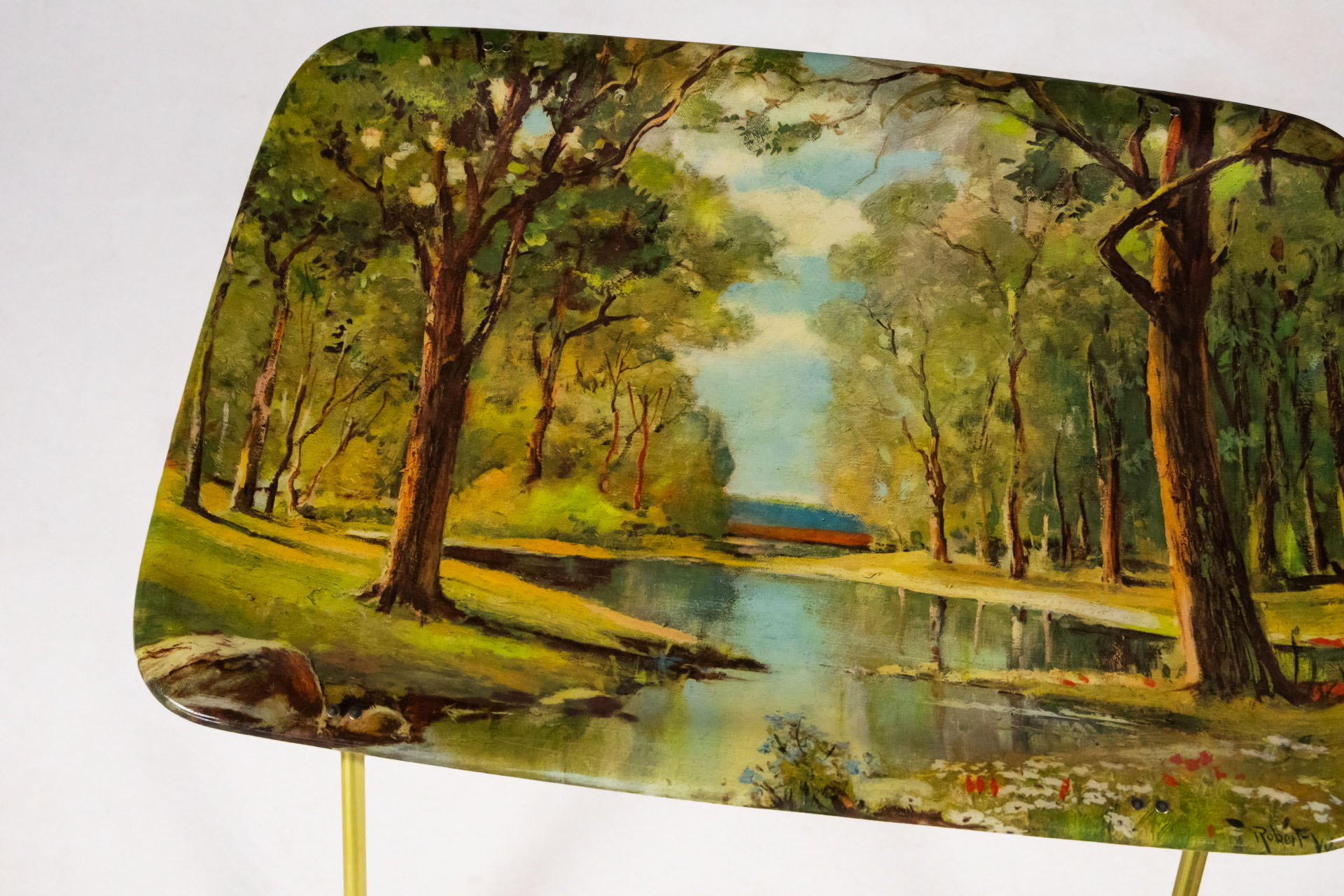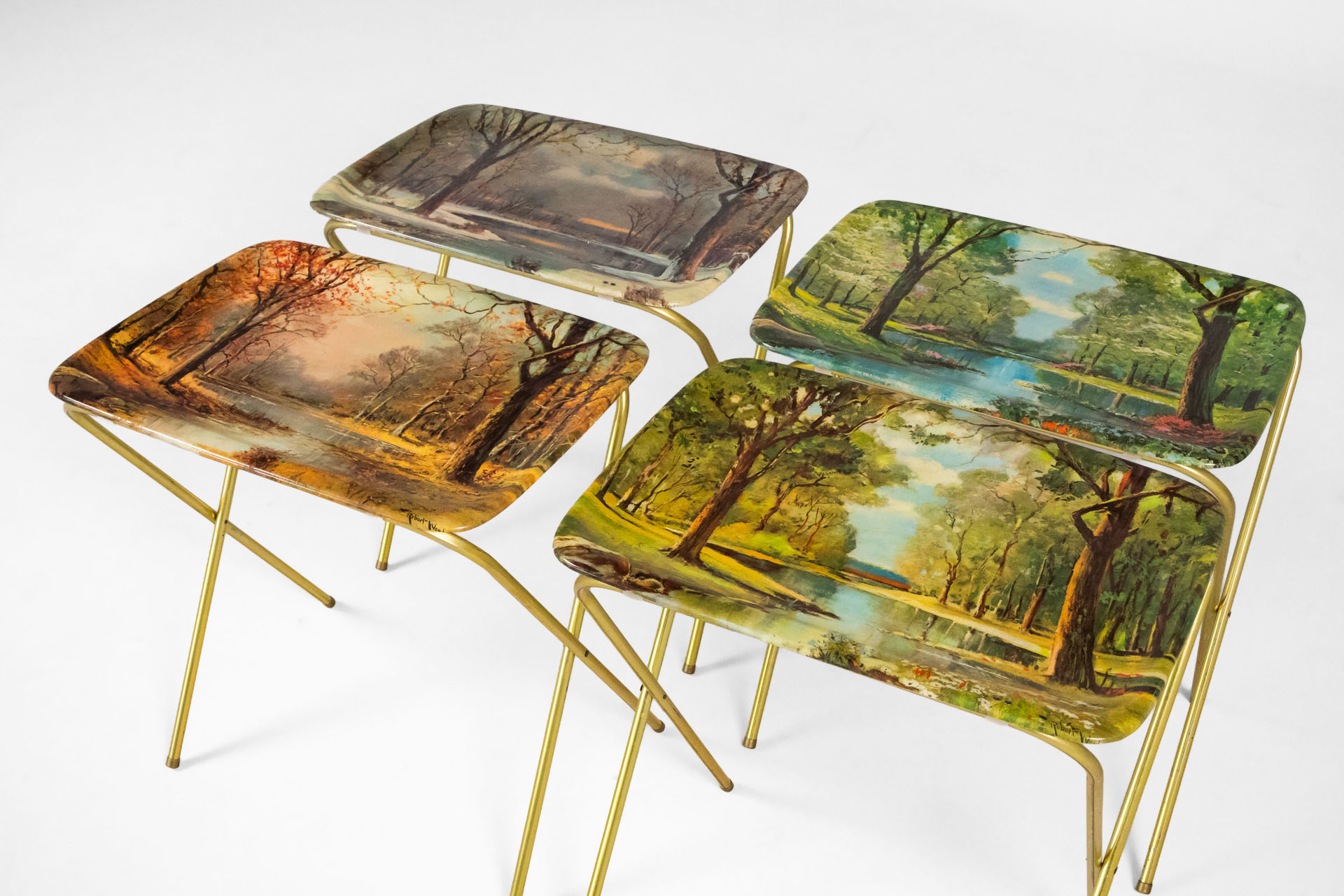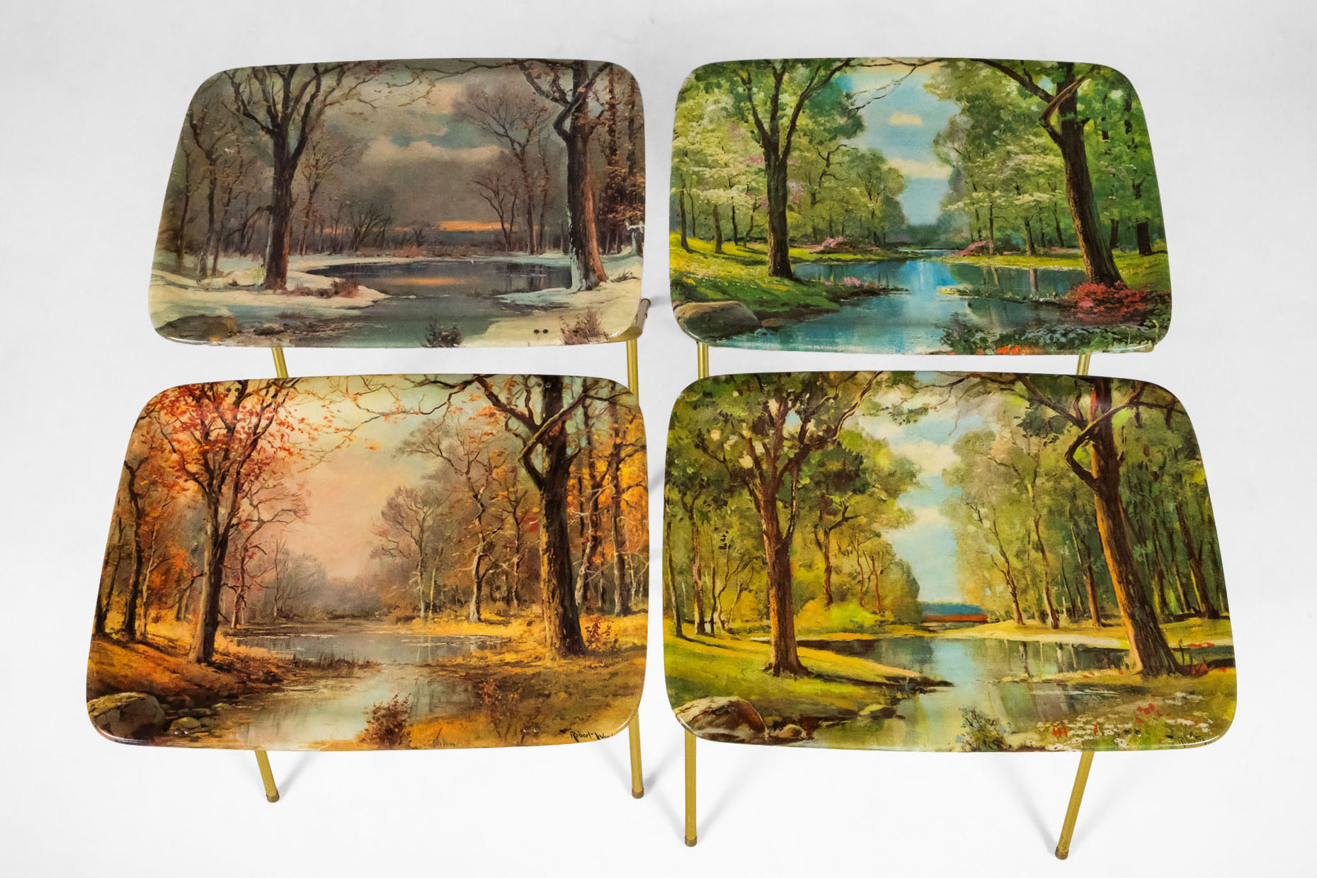 Négy darab vintage tálcaasztal, mindegyik különböző, festett tájképekkel díszítve, arany színű fém lábakkal. Az asztalok négyzetes formájúak, lekerekített sarkokkal, amelyek elegáns megjelenést kölcsönöznek. Az...