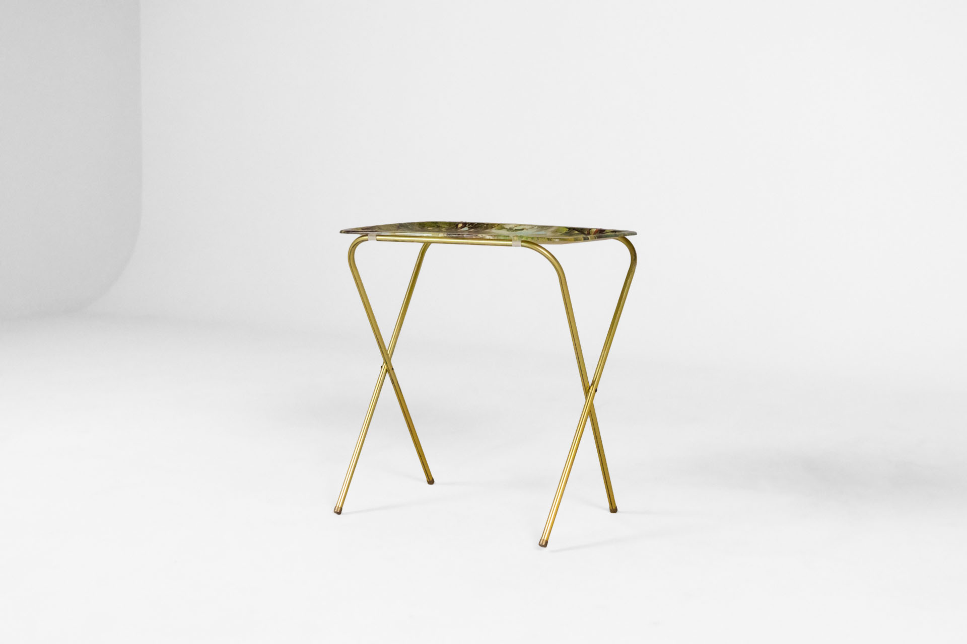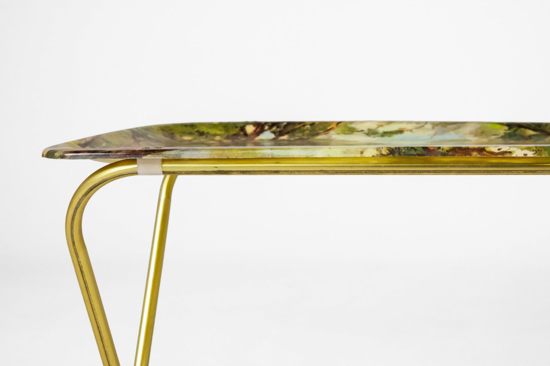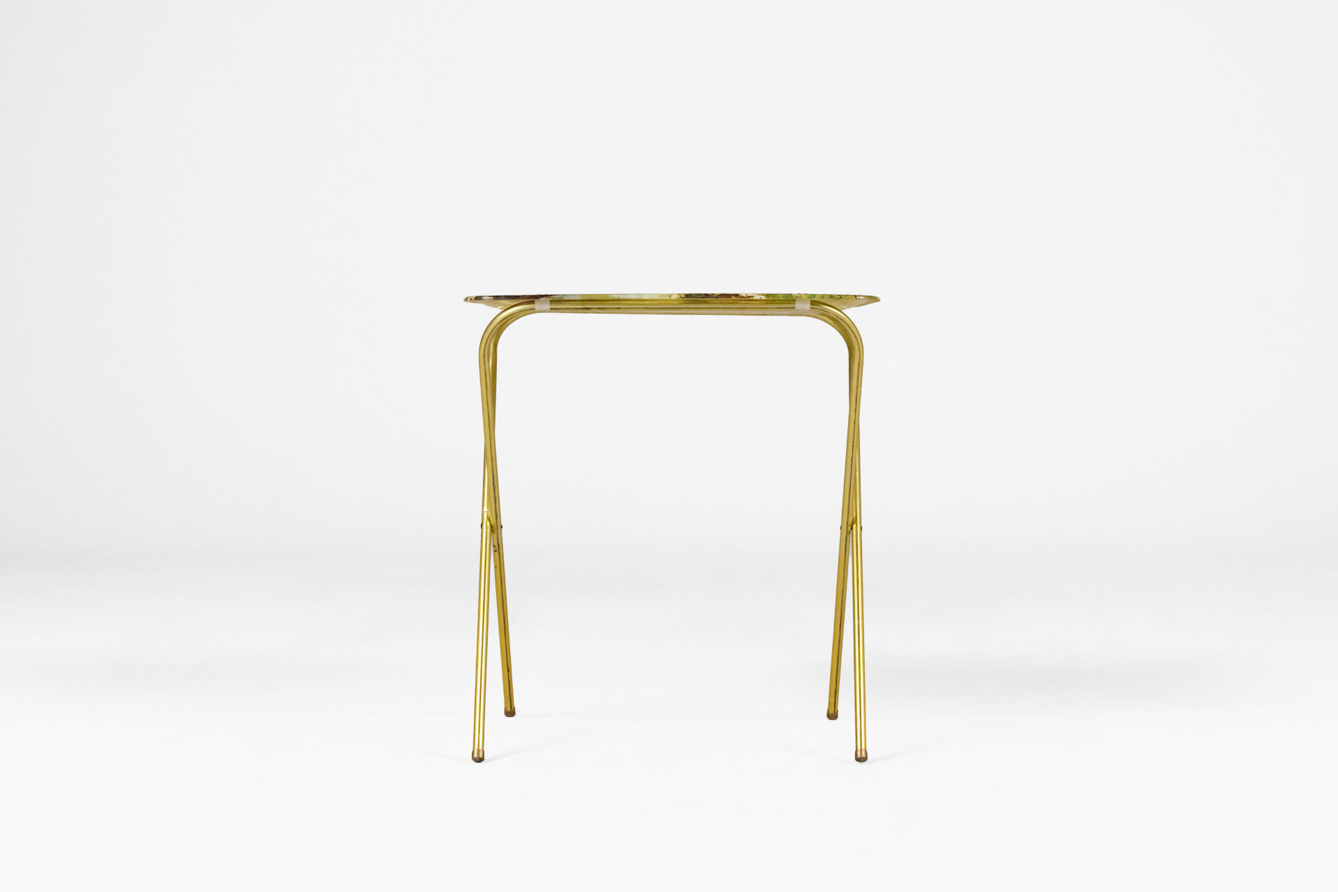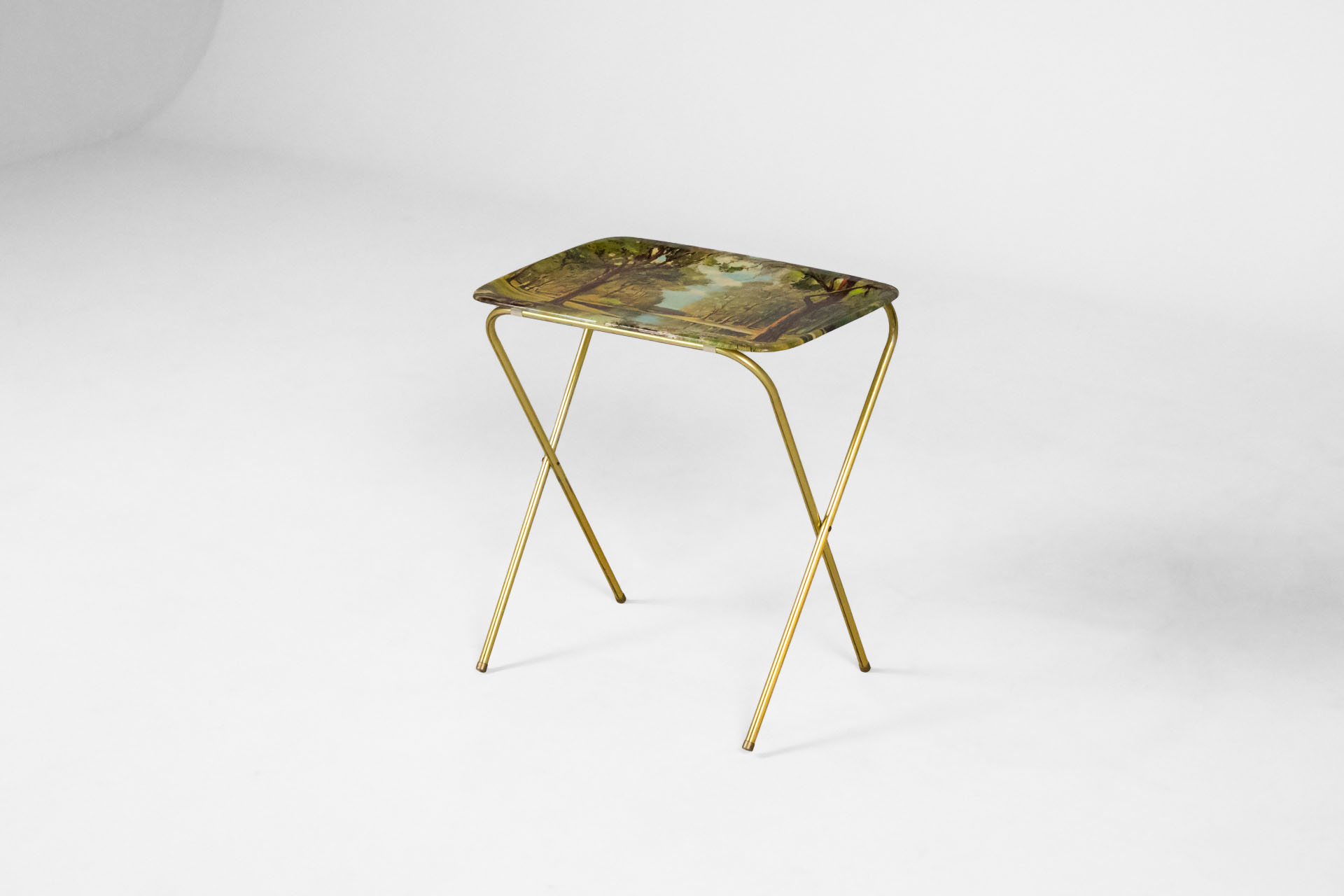 Négy darab vintage tálcaasztal, mindegyik különböző, festett tájképekkel díszítve, arany színű fém lábakkal. Az asztalok négyzetes formájúak, lekerekített sarkokkal, amelyek elegáns megjelenést kölcsönöznek. Az...
