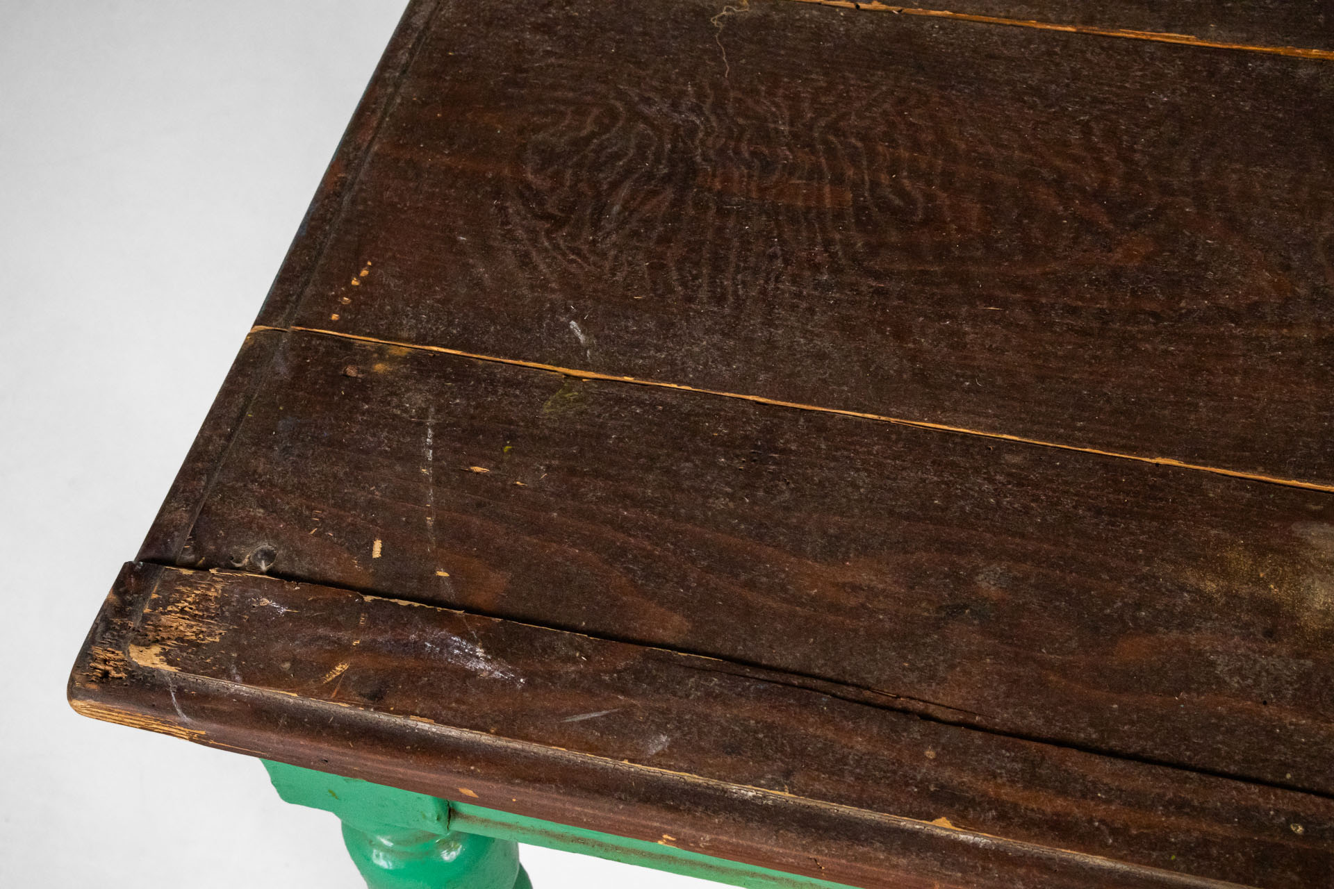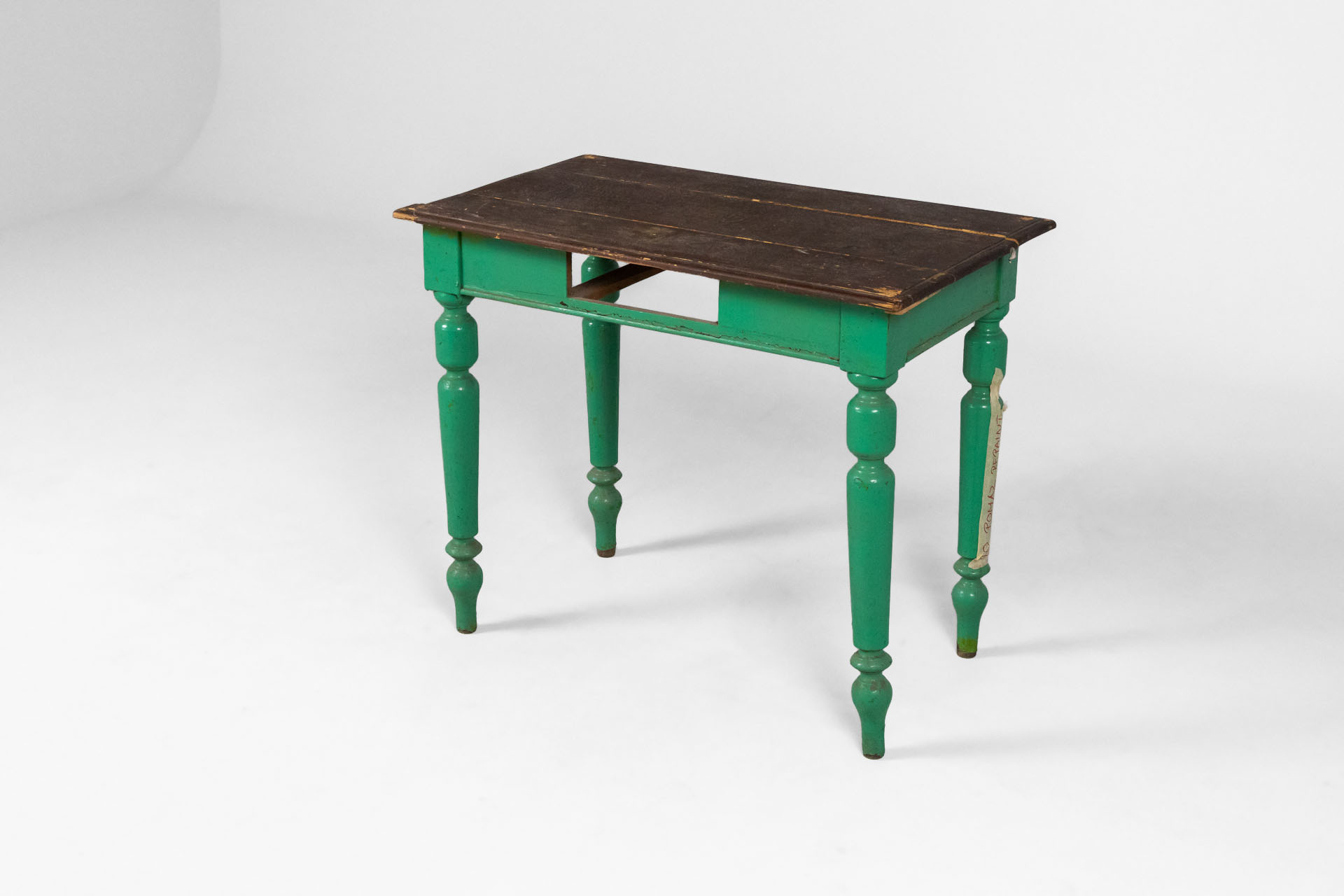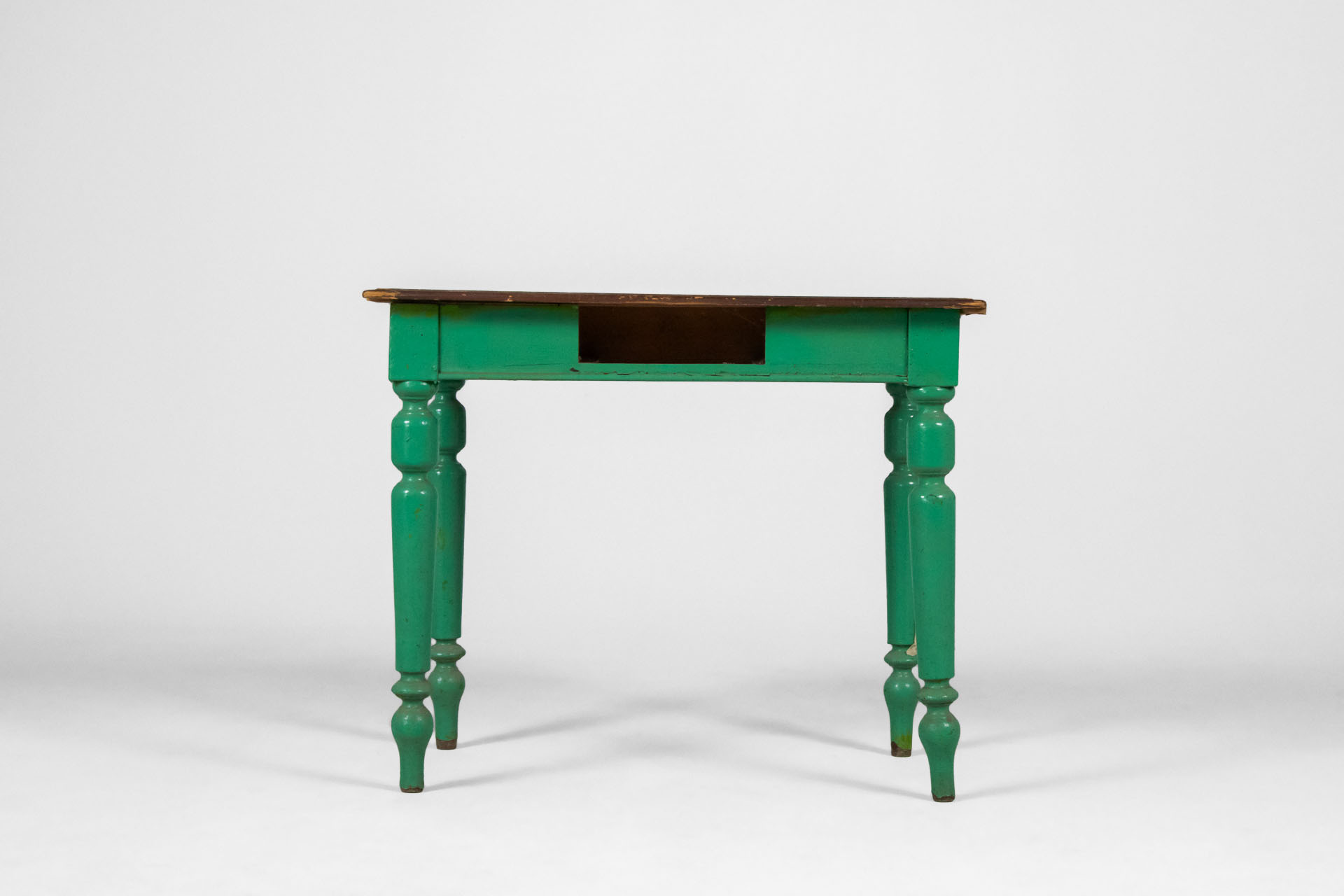 Klasszikus stílusú, zöld festékkel bevont íróasztal, amely masszív, sötétbarna fa asztallappal rendelkezik. Az asztal négy, esztergált lábbal áll, amelyek stabilitást és eleganciát biztosítanak. A tervezés egyszerű,...