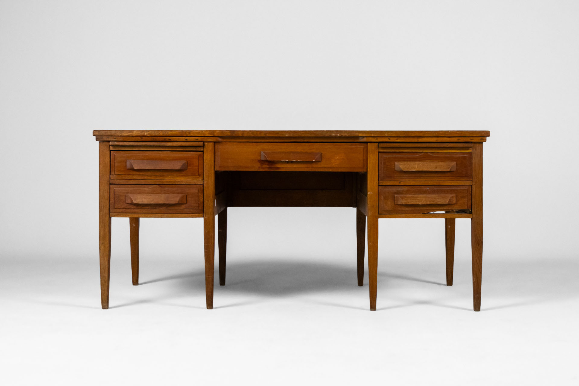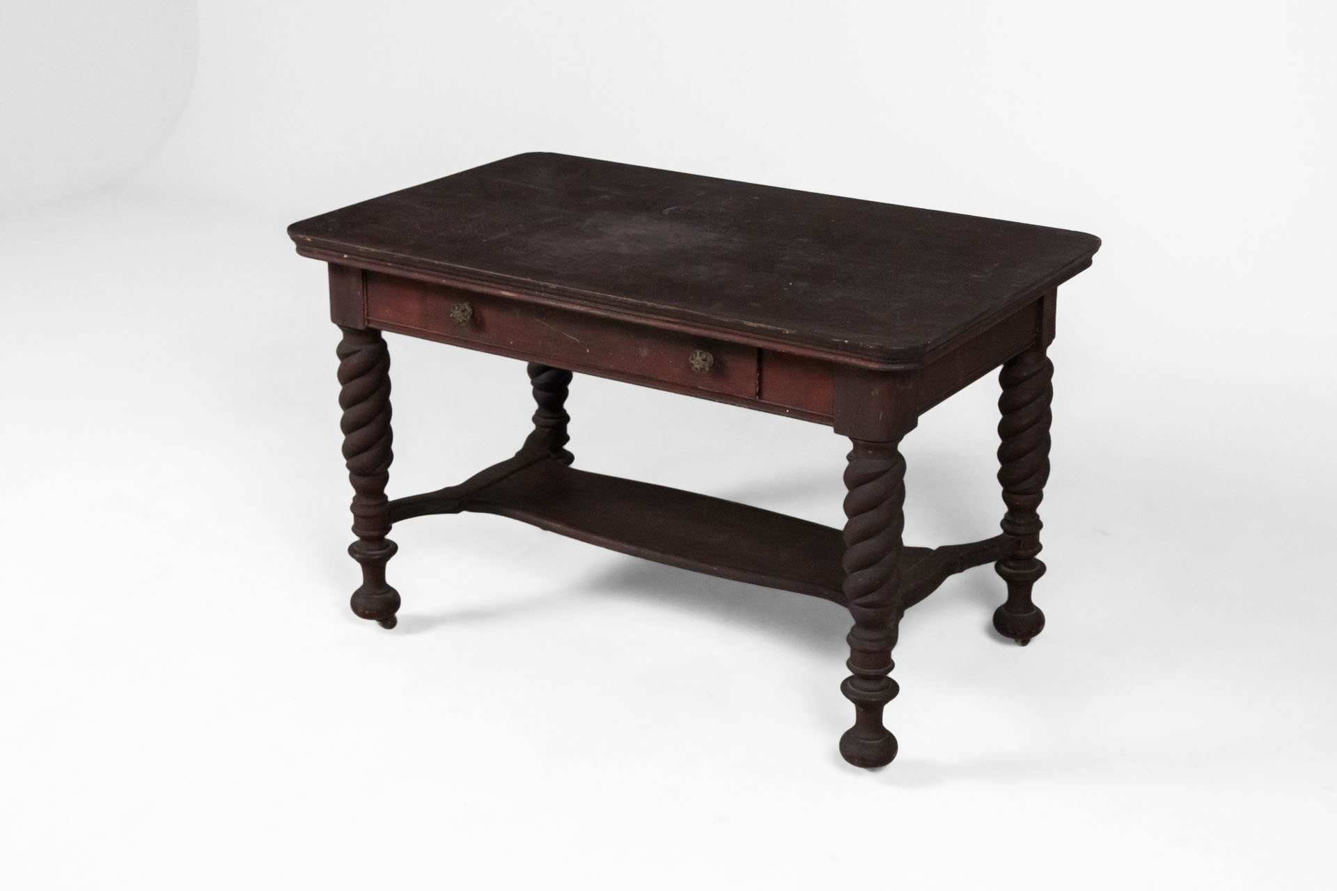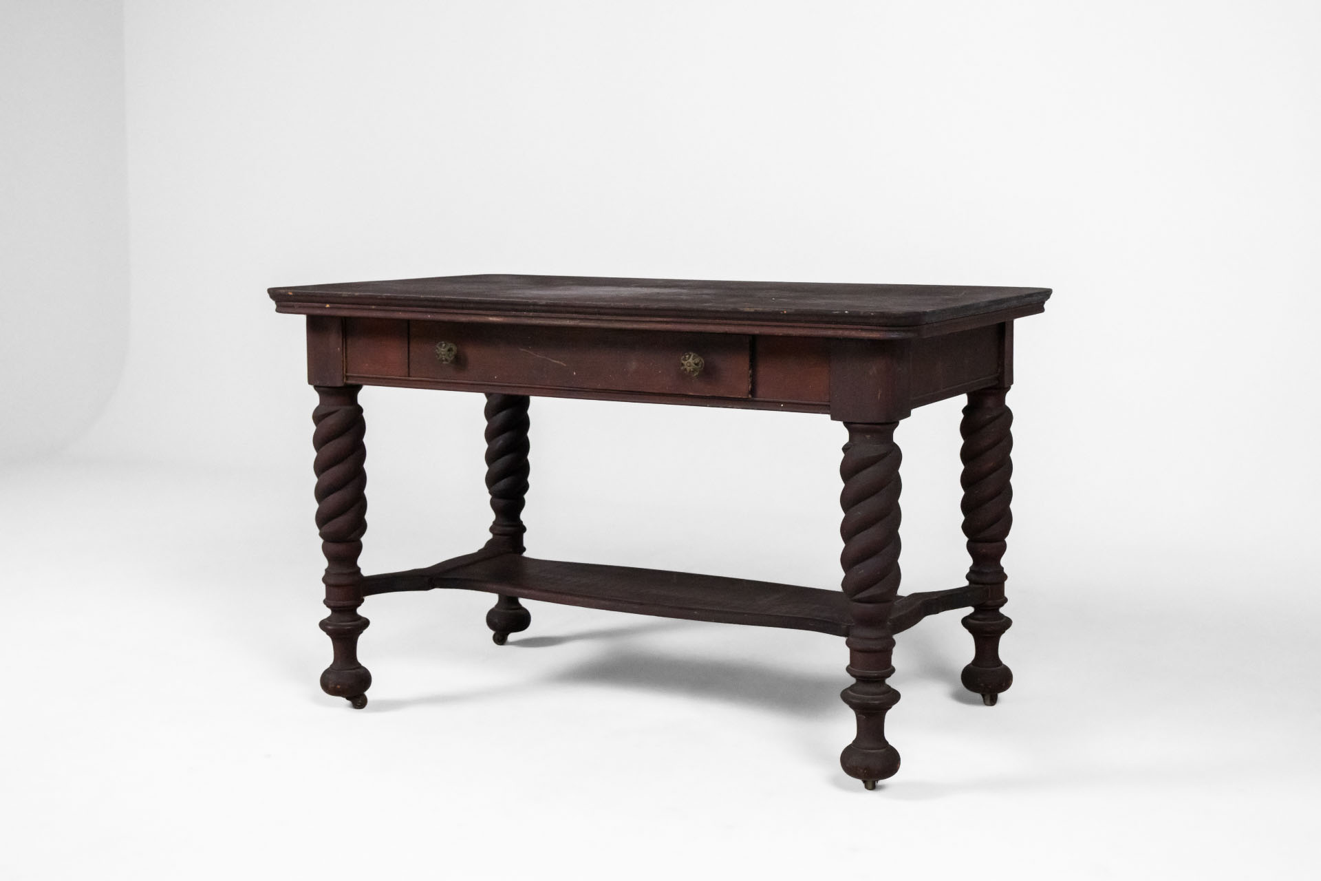Klasszikus stílusú, zöld festékkel bevont íróasztal, amely masszív, sötétbarna fa asztallappal rendelkezik. Az asztal négy, esztergált lábbal áll, amelyek stabilitást és eleganciát biztosítanak. A tervezés egyszerű,...