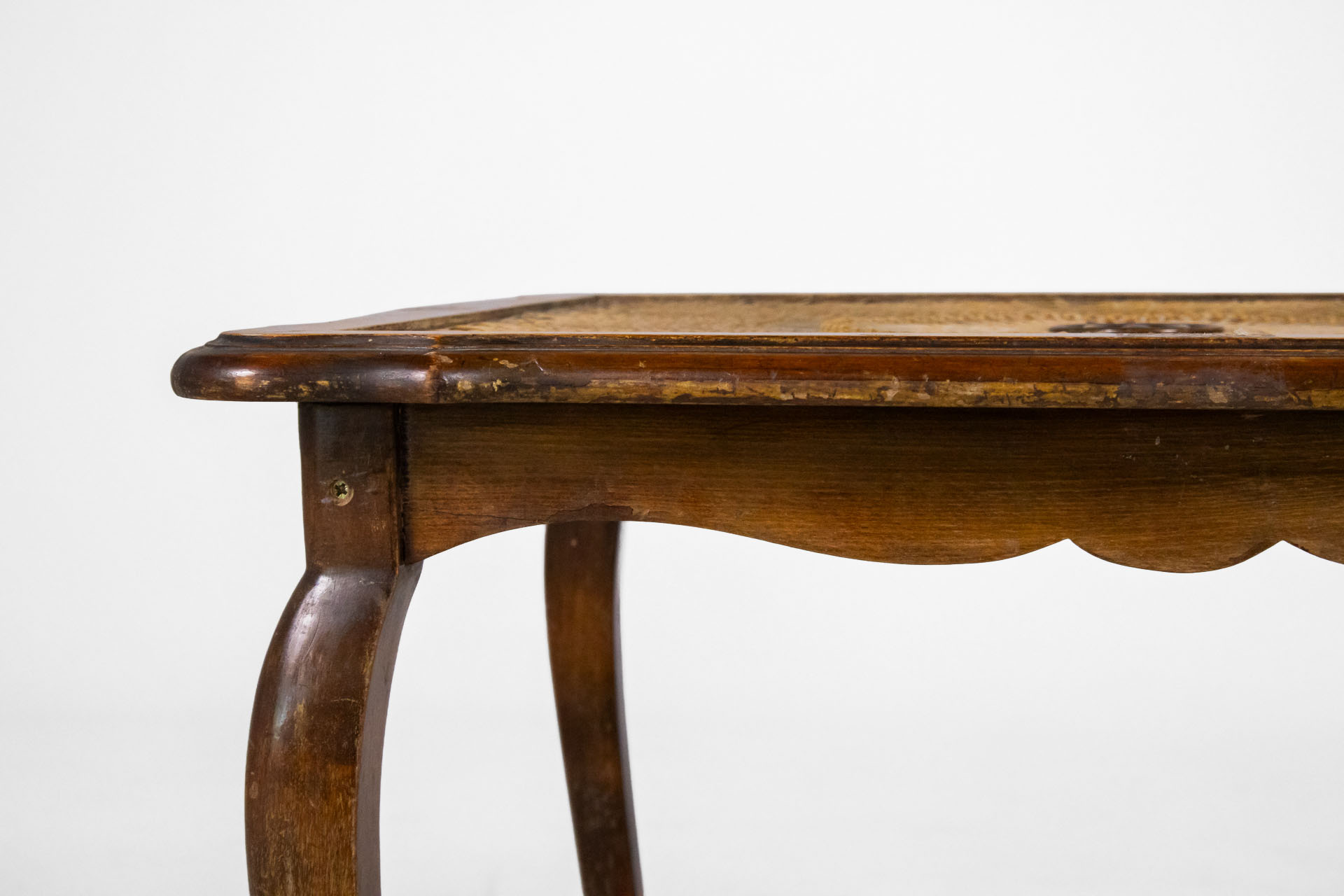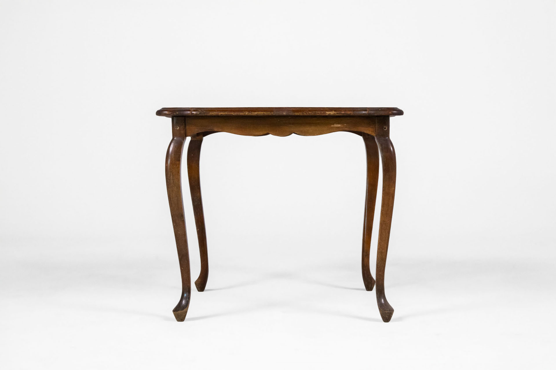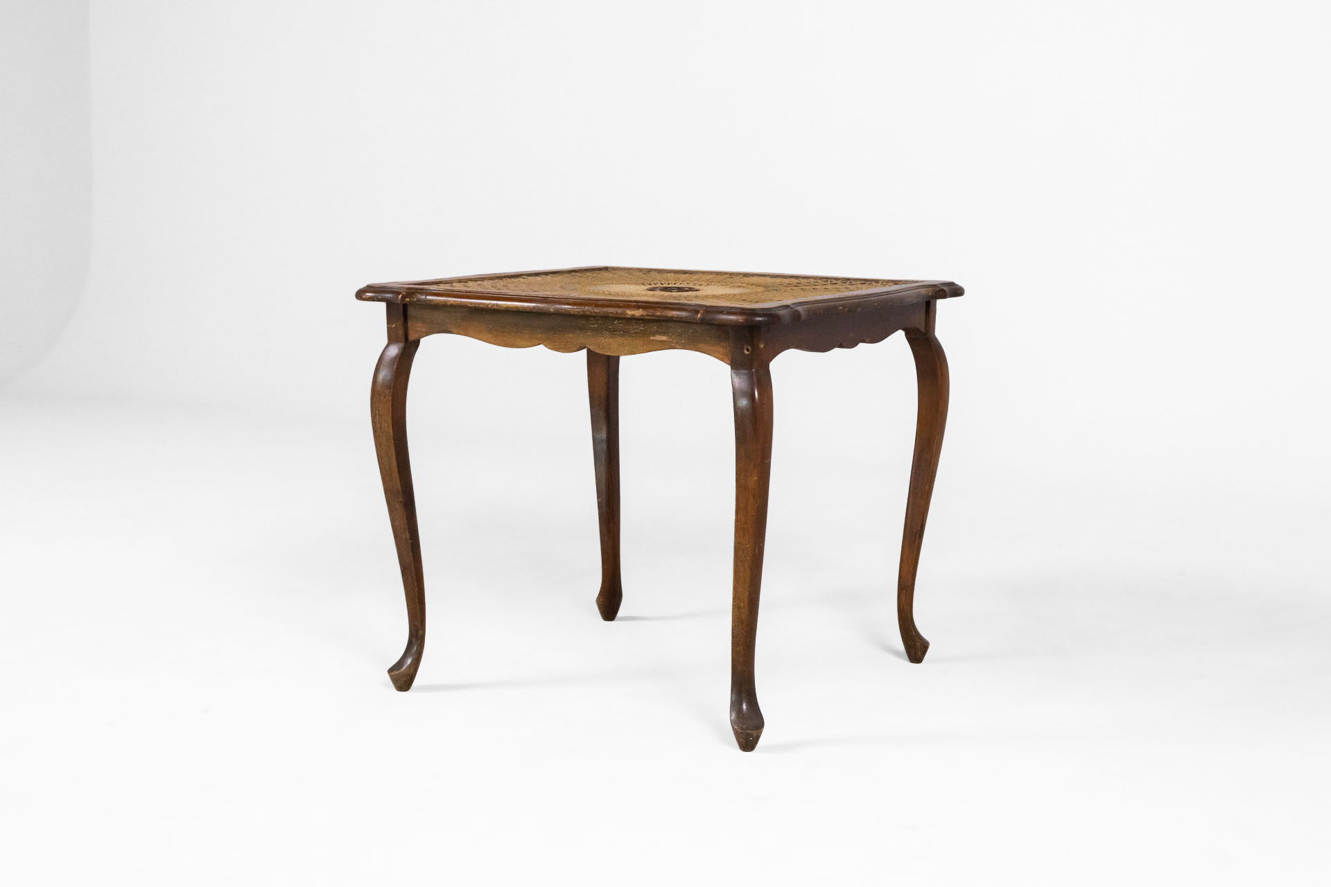 Tradicionális stílusú, négyzet alakú dohányzóasztal, díszített, faragott lábakkal és elegáns, rusztikus megjelenéssel. Az asztallap finoman megmunkált, és a sarkoknál ívelt részletek találhatók, amelyek karaktert...