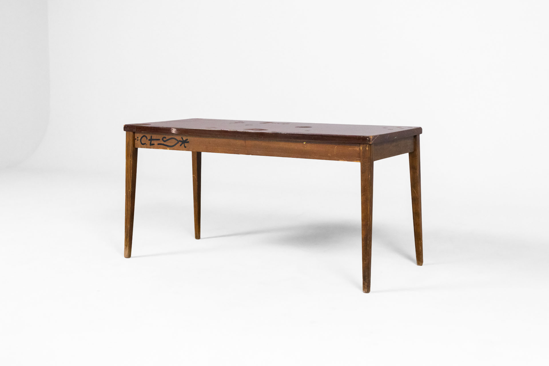 Rustikus stílusú, négy lábon álló, téglalap alakú asztal, amely időtlen bájt sugároz. A felület enyhén kopott, ami a használat nyomait tükrözi, és meleg, vörösesbarna színével otthonos hangulatot teremt. Az asztal...