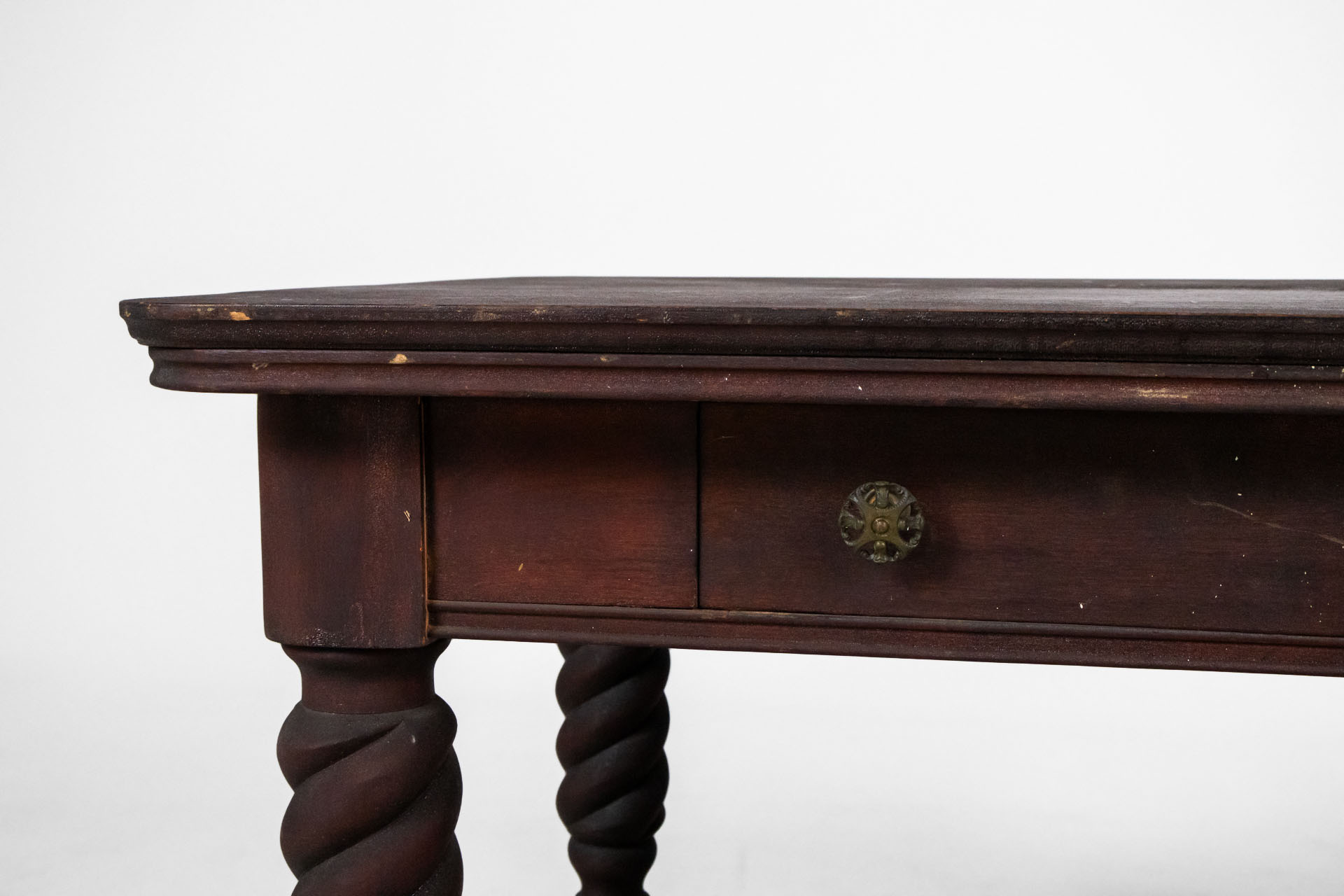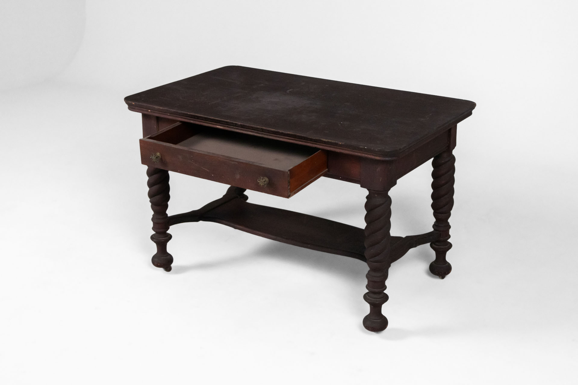 Klasszikus stílusú, masszív barna dohányzóasztal, amely karakteres, spirálisan faragott lábakkal és egy praktikus fiókkal rendelkezik. Az asztal lapja enyhén lekerekített sarkú, időtálló megjelenést kölcsönözve a...