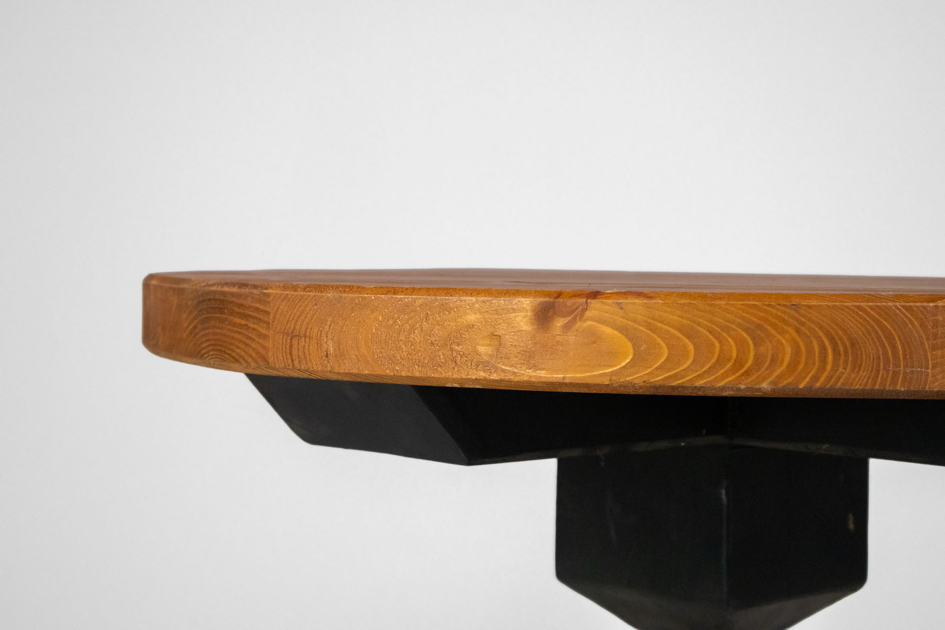 Minimalista, kerek dohányzóasztal, masszív fekete lábazattal és természetes fa asztallappal
