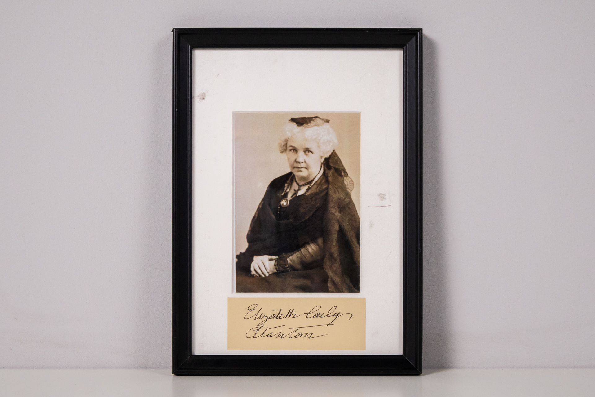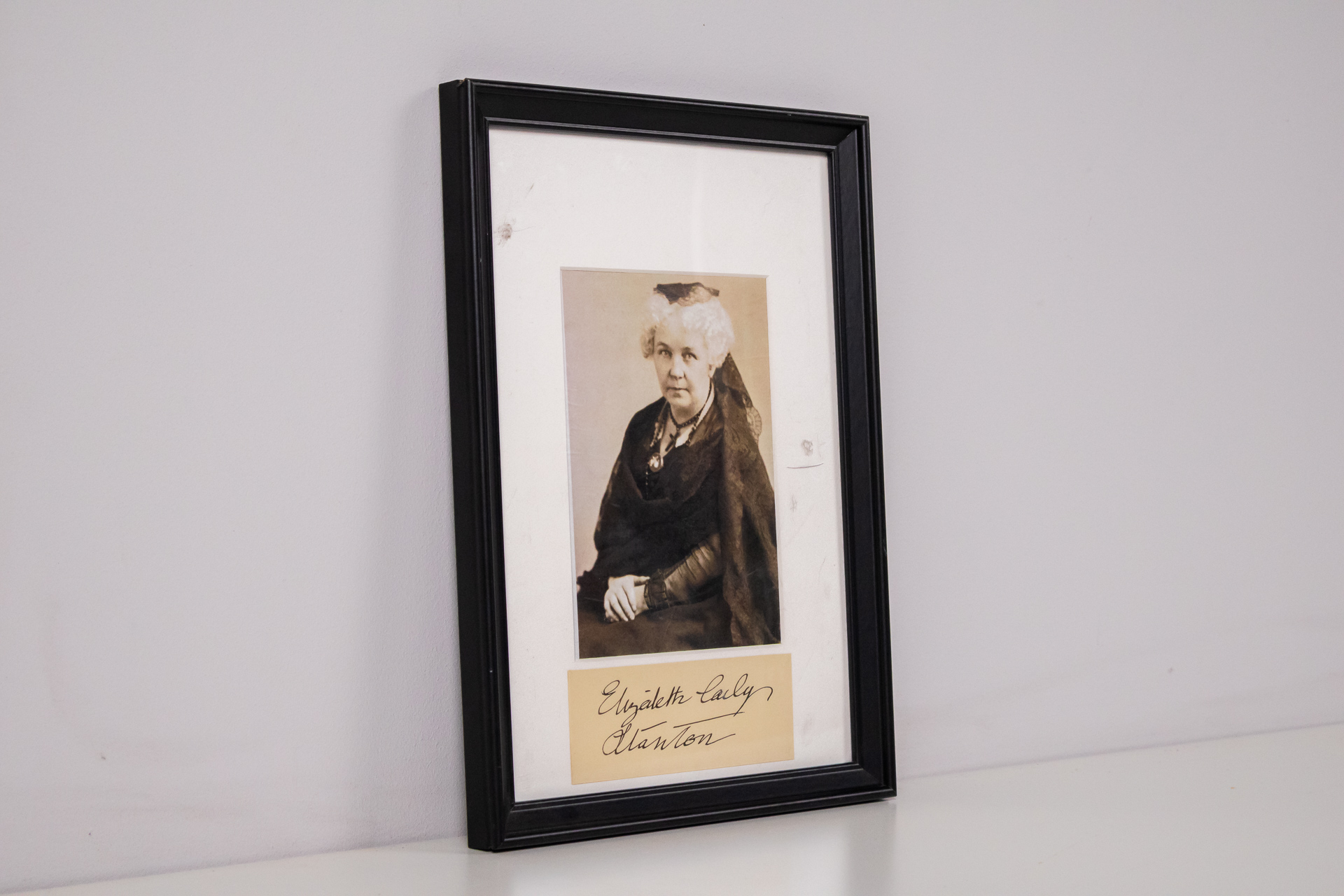 A kép egy fekete-fehér fotó, amely egy idős asszonyt ábrázol, aki elegáns ruhát visel. Az asszony arca kifejező, a háttér homályos, így a figyelem a portréra összpontosul. A fotó kerete fekete műanyagból készült,...