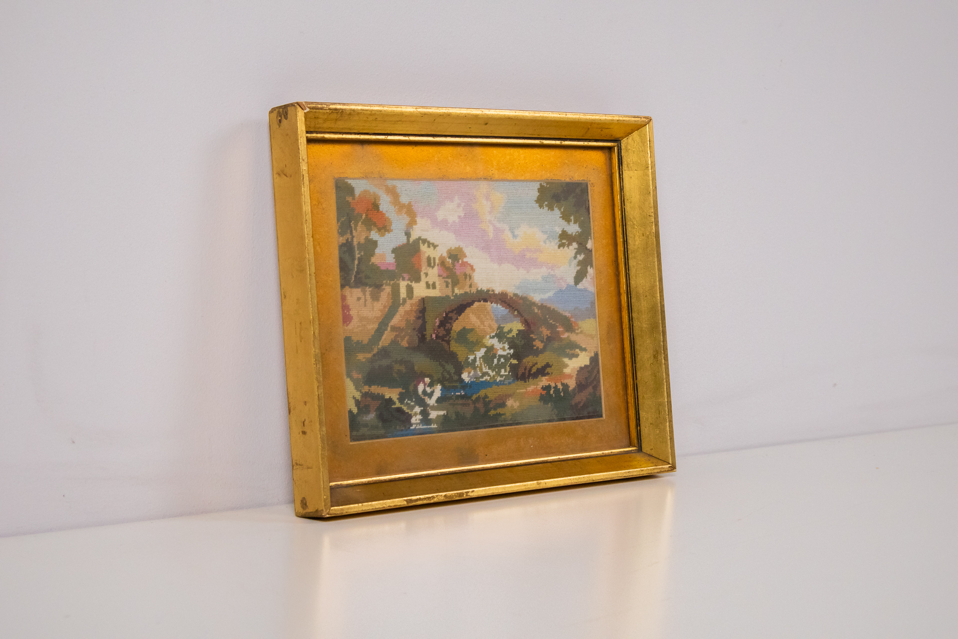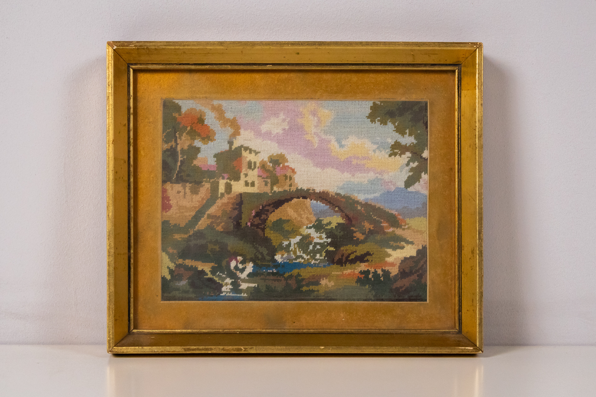 Hímzett tájképet ábrázol, amely egy hidat, folyót és épületeket mutat be egy festői környezetben. A háttérben hegyek és fák láthatók, a színek lágy, pasztell árnyalatokban pompáznak. Az arany keret egyszerű, de...