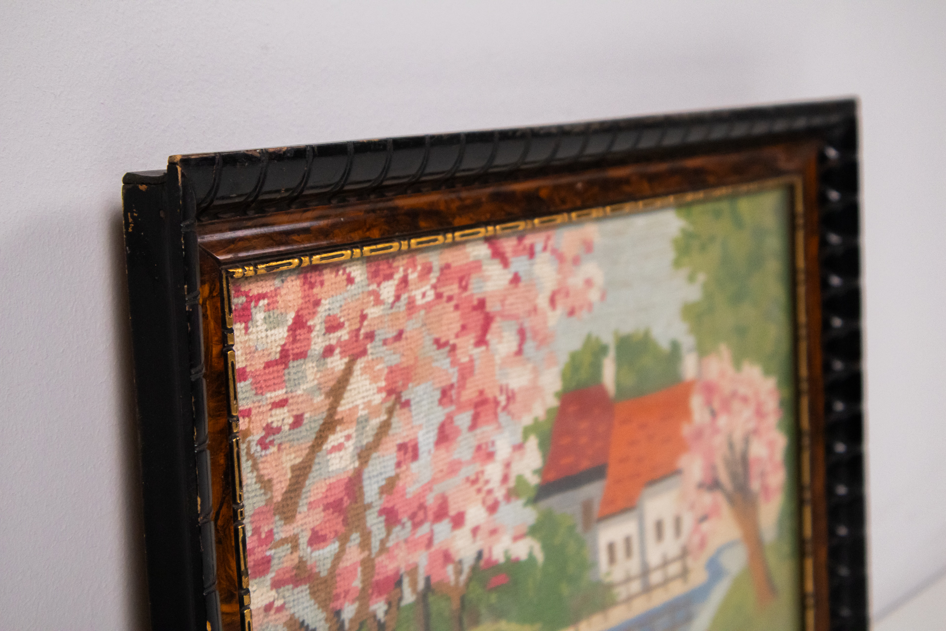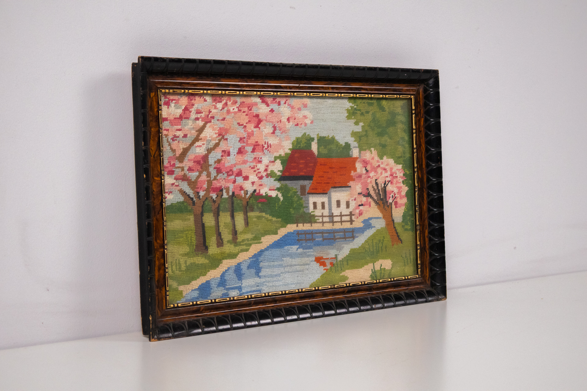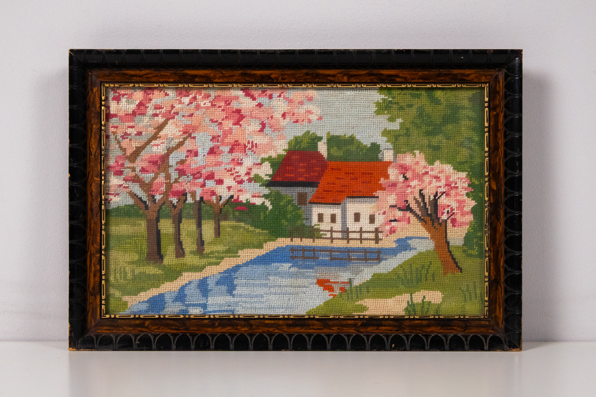 Hímzett tájképet ábrázol, amelyen virágzó fák, egy folyó és egy ház látható. A színek élénkek, dominálnak a rózsaszín, zöld és kék árnyalatok. A hímzés technikája finom, részletes, és a képet egy díszes, fekete-fából...