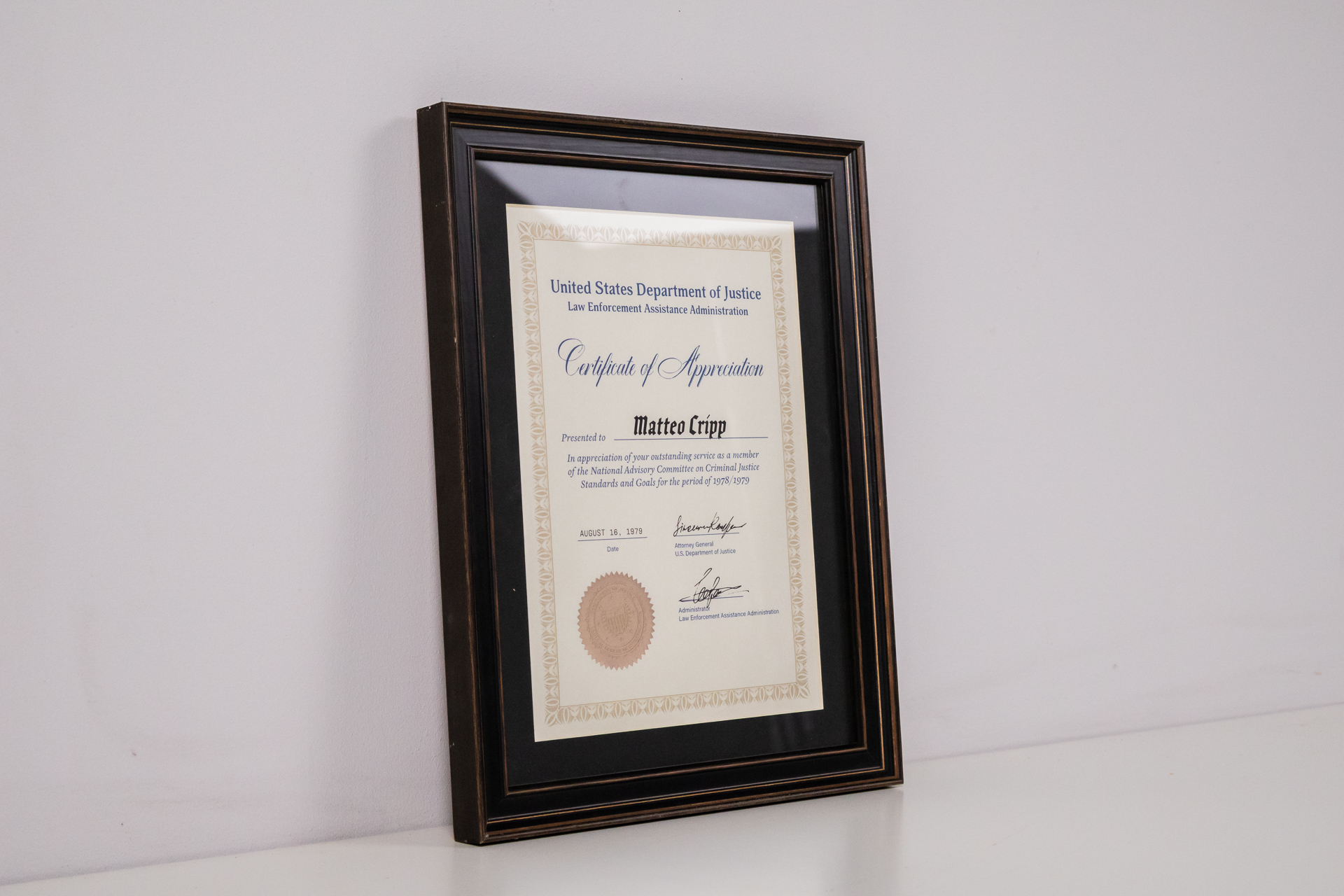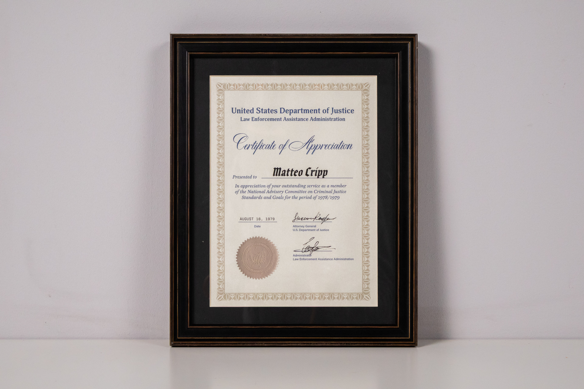 Hivatalos oklevél, amely a 'United States Department of Justice' részére készült, a 'Law Enforcement Assistance Administration' alá tartozik. Az oklevél díszes kerettel rendelkezik, amely fekete és arany színű,...