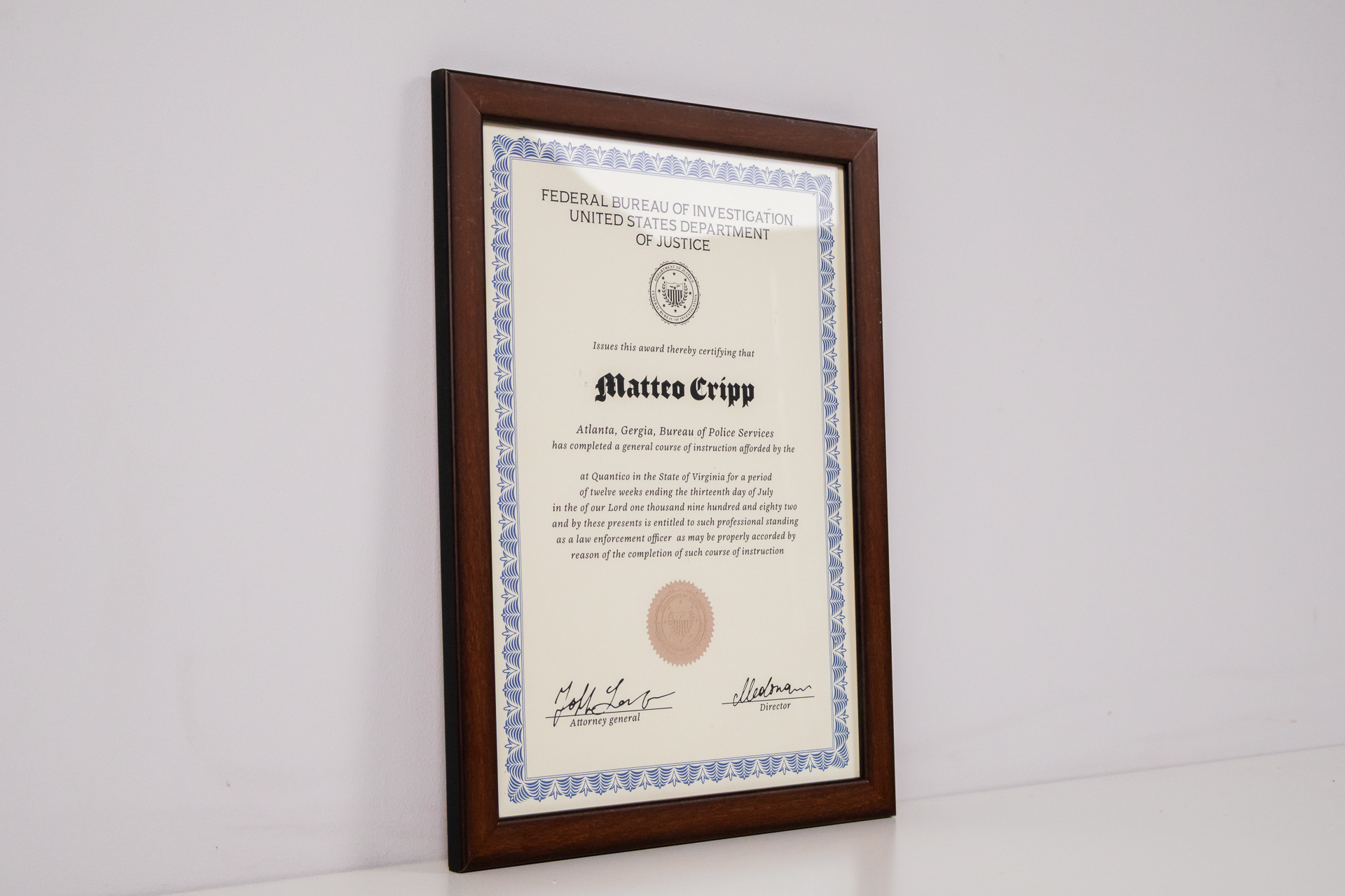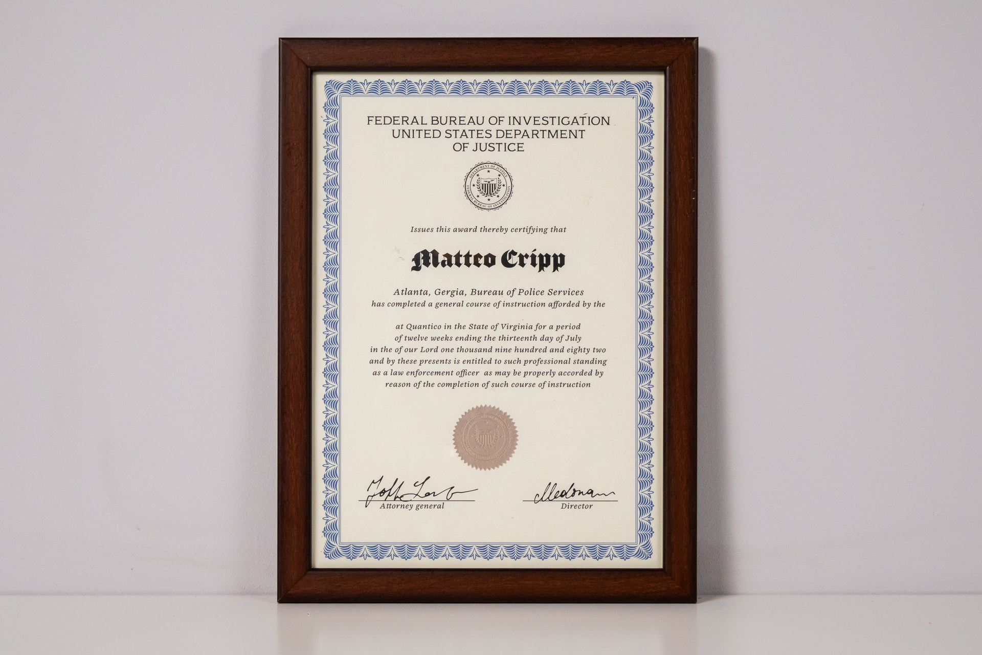 Hivatalos oklevél, amely tanúsítja, hogy Matteo Cripp sikeresen teljesítette a rendőrségi szolgálat által biztosított képzést. Az oklevél klasszikus formátumú, díszes kerettel, kék és fehér mintázattal a szélén,...