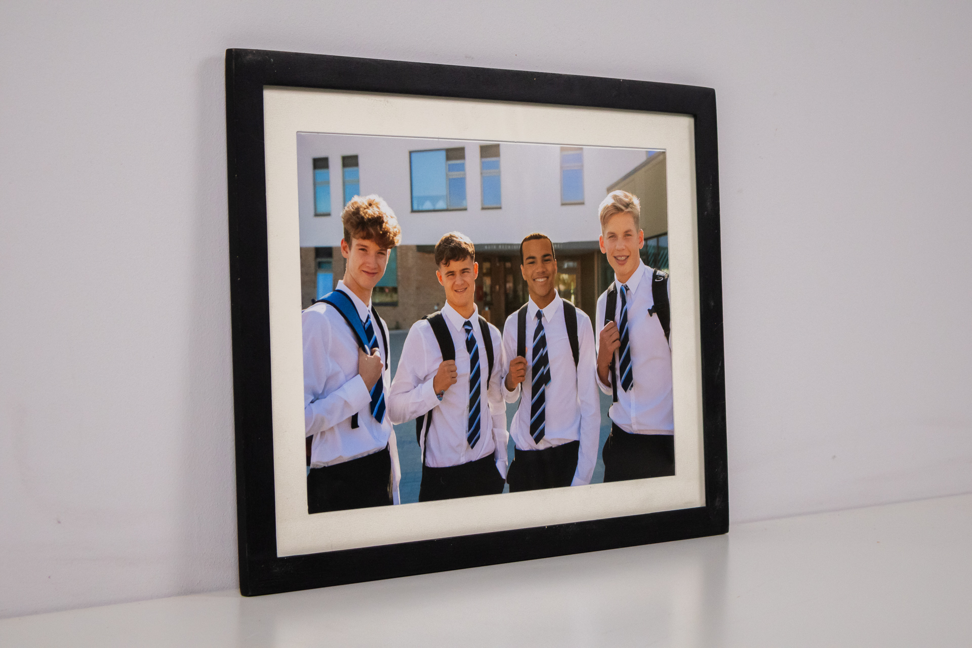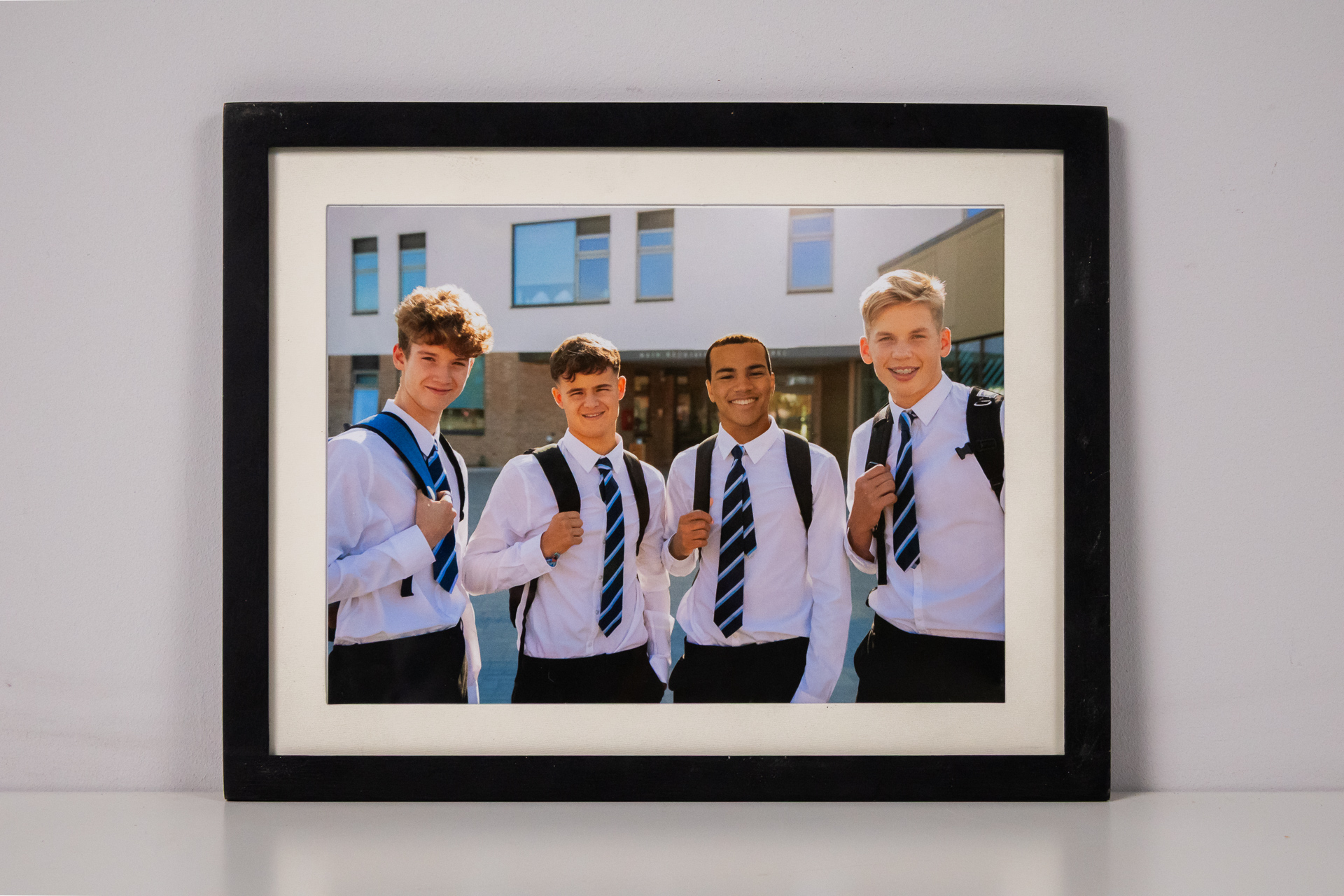 A kép négy fiatal fiú portréját ábrázolja, akik iskolai egyenruhát viselnek. A háttérben modern épület látható, amely világos színekkel és nagy ablakokkal rendelkezik. A fiúk mosolyognak, és hátizsákot hordanak. A...