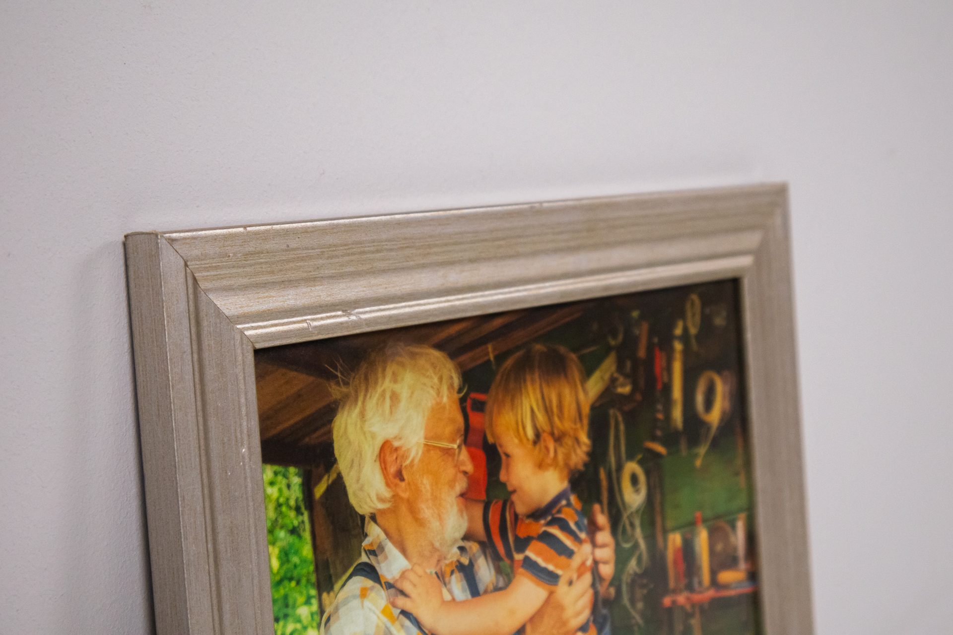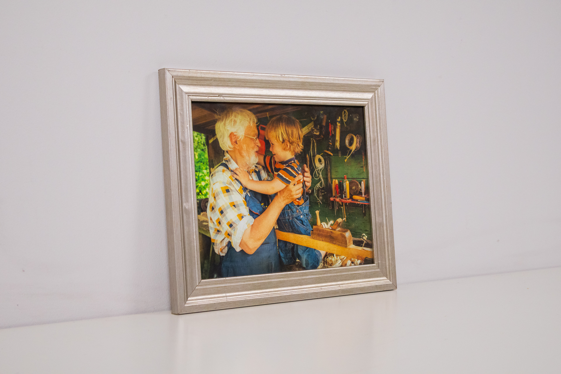 A kép egy idős férfit és egy kisfiút ábrázol, amint egy műhelyben együtt dolgoznak. Az idős férfi boldogan néz a kisfiúra, aki az ölében ül. A háttérben láthatóak különböző szerszámok és faanyagok, amelyek a...