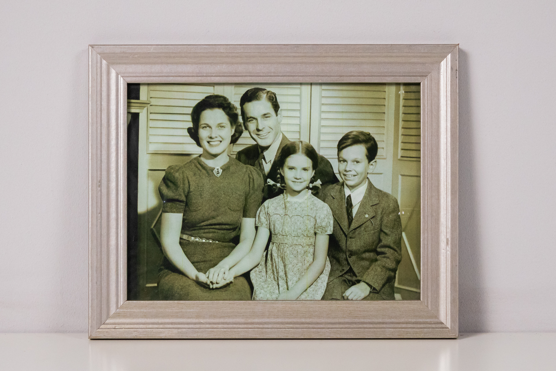 Fekete-fehér családi portré, amely négy főt ábrázol: két felnőttet és két gyermeket. A háttérben redőnyök láthatók, a szereplők barátságos pózban ülnek. A nő elegáns ruhát visel, a férfi öltönyben van, a gyerekek...