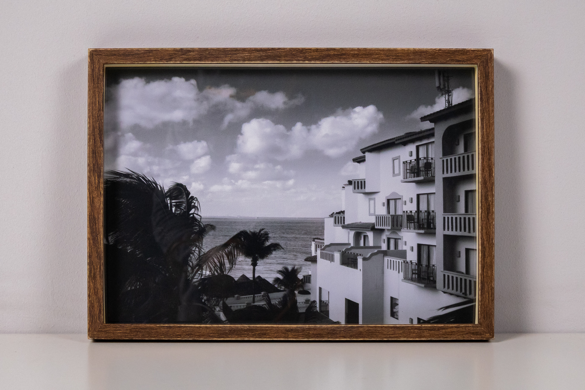 Fekete-fehér fénykép, amely egy tengerparti épületet és a mögötte elterülő tengert ábrázol, pálmafákkal az előtérben. Az égbolt felhős, dinamikus felhőformációkkal, amely mélységet ad a kompozíciónak. A kép modern,...