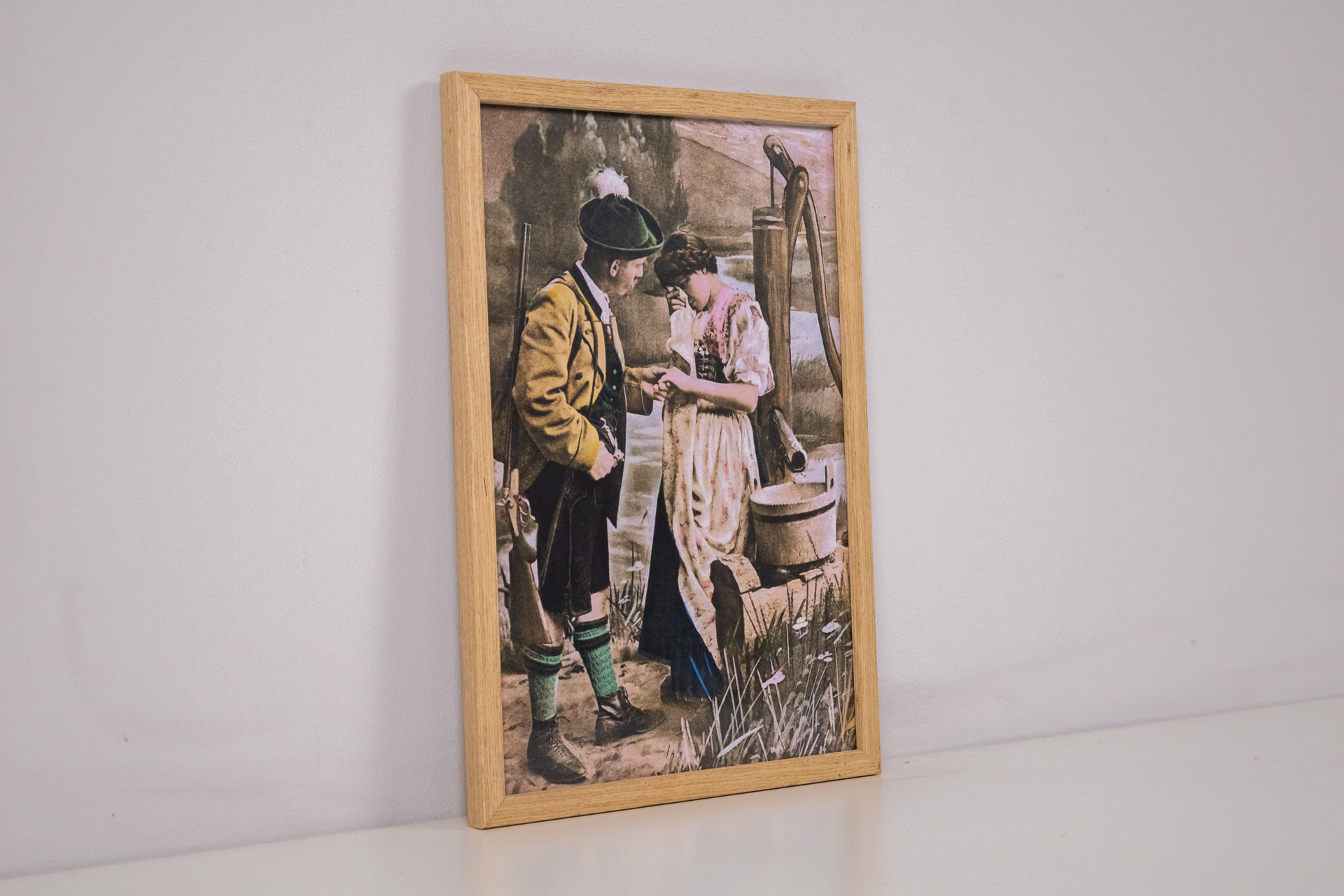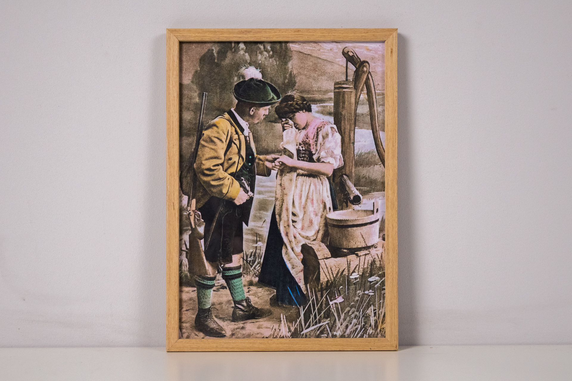 Romantikus stílusú festmény, amely egy fiatal párt ábrázol, amint egy kút mellett állnak, a lány a fiú kezét nézi. A háttérben dombos táj és víz látható, a színek melegek és lágyak, dominál a bézs, zöld és kék. A...