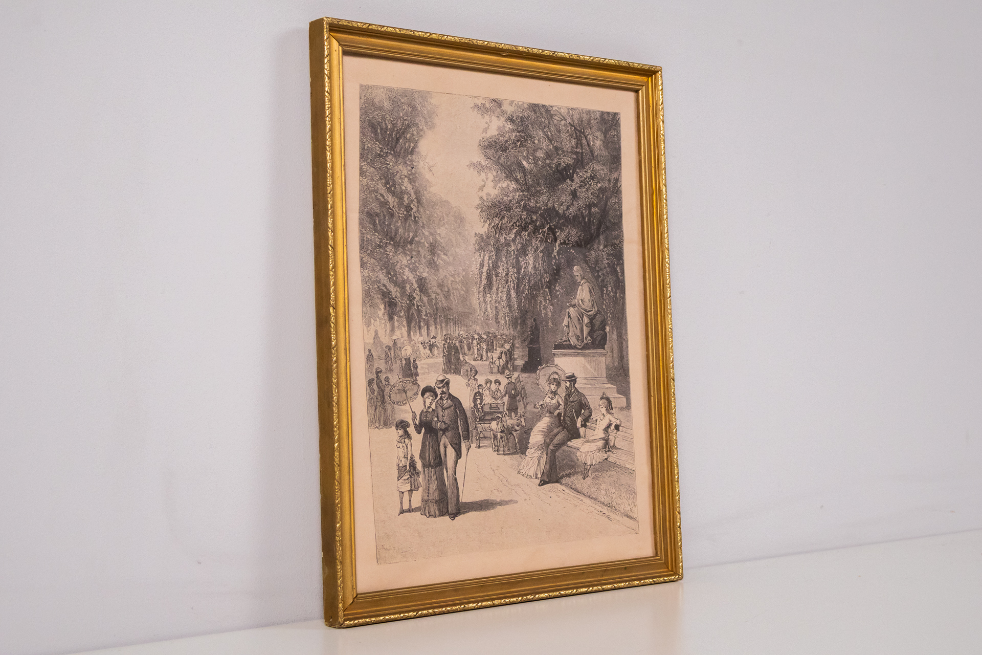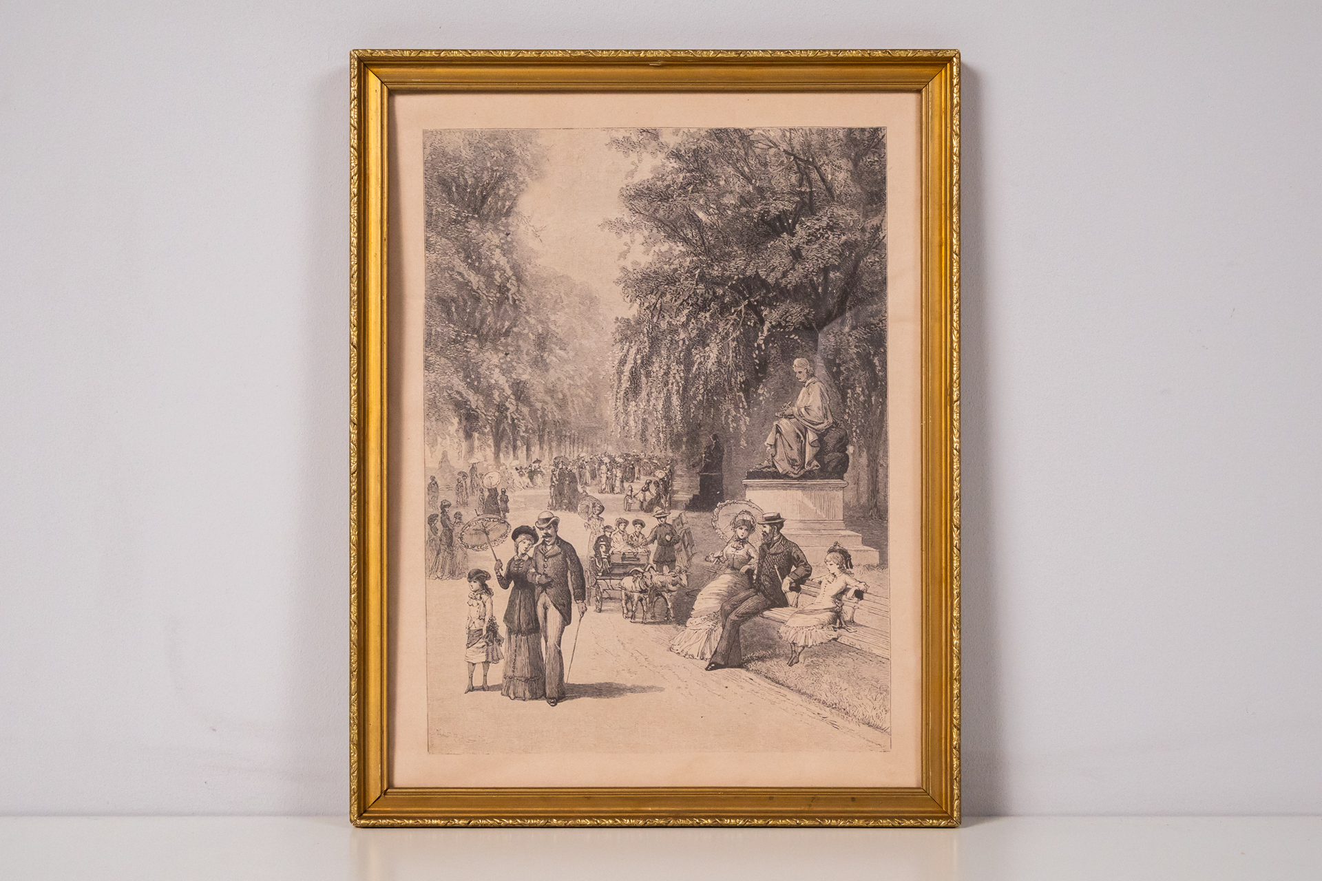 A kép egy 19. századi parkjelenetet ábrázol, ahol különböző korú emberek sétálnak és pihennek. A háttérben fák és egy szobor látható, a figurák részletes kidolgozása és az árnyékok finom játéka jellemzi. A technika...