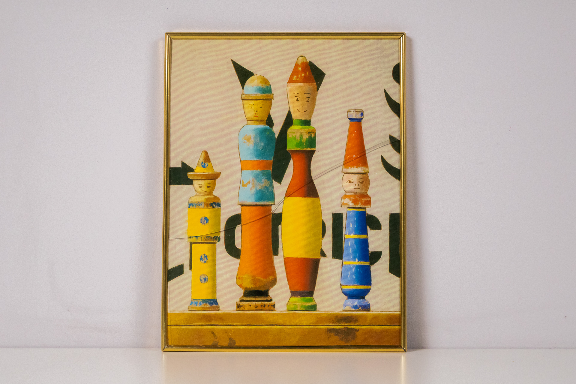 A kép négy stilizált, fából készült figurát ábrázol, élénk színekben, mint például kék, narancssárga, zöld és sárga. A figurák különböző magasságúak és formájúak, mindegyiknek van saját karaktere, ami játékos...