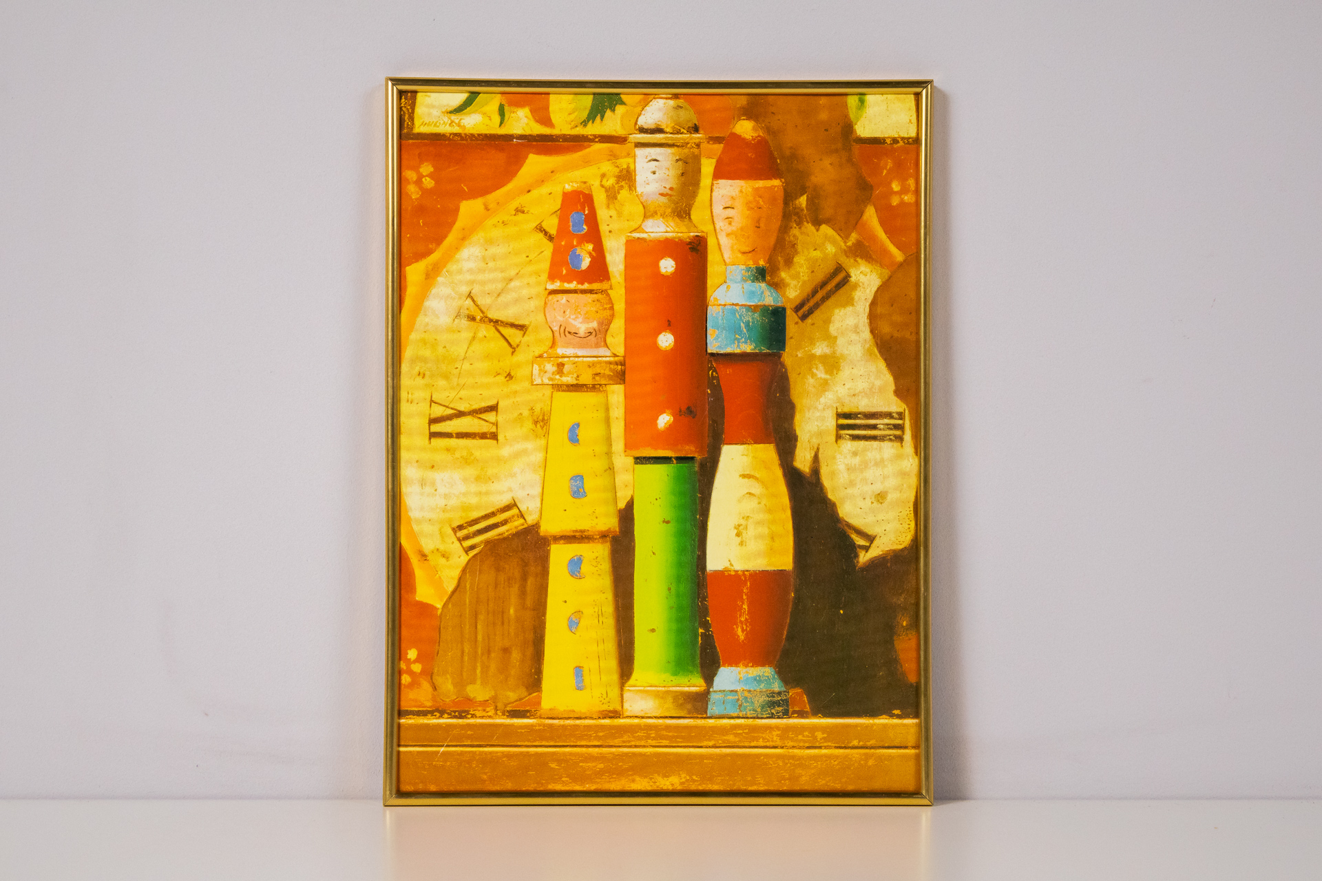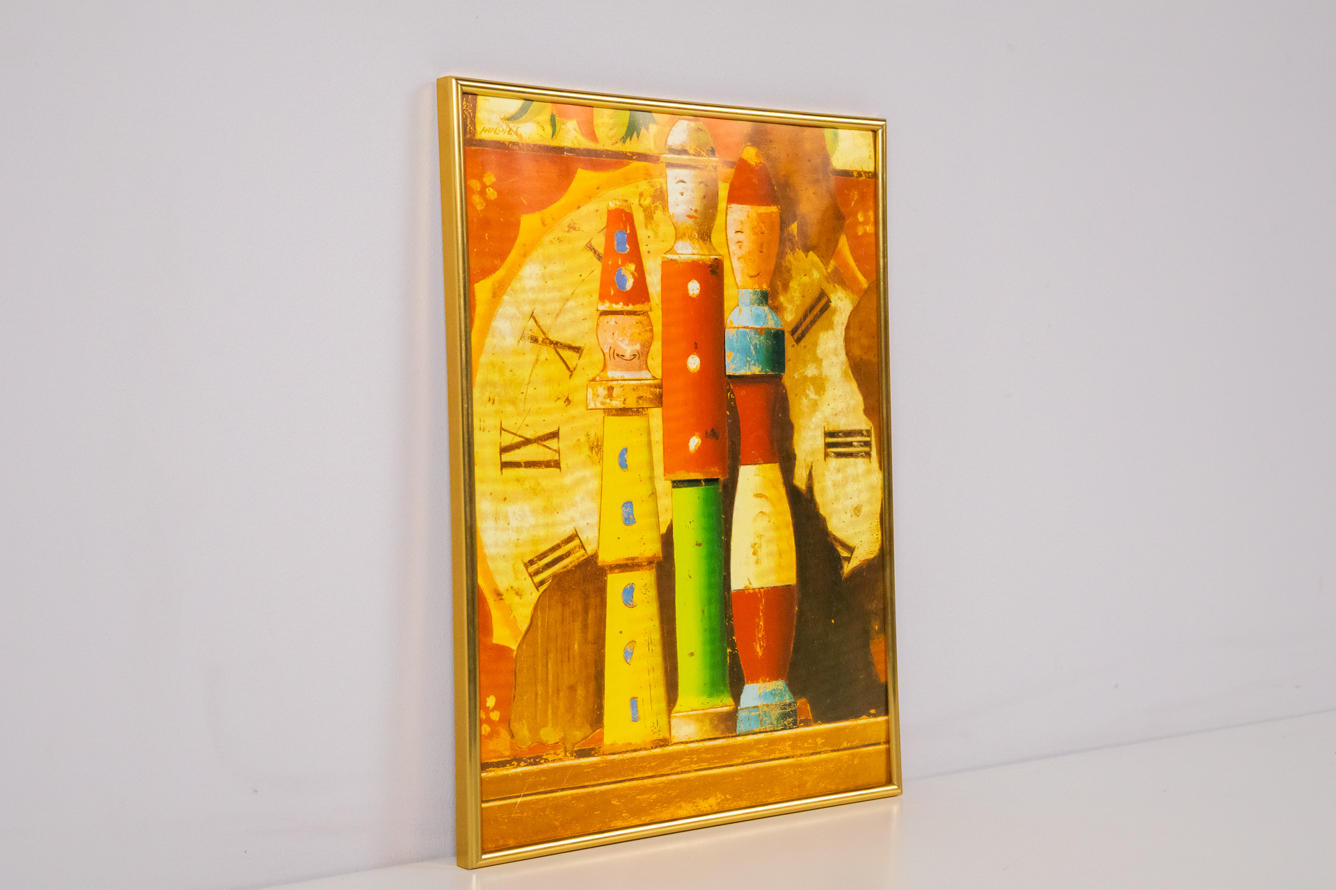 Absztrakt stílusú festmény, amely színes figurákat ábrázol, élénk piros, kék, zöld és sárga színekkel. A háttérben óra motívumok láthatók, amelyek a mozgás és az idő múlását szimbolizálják. A festmény aranyozott...