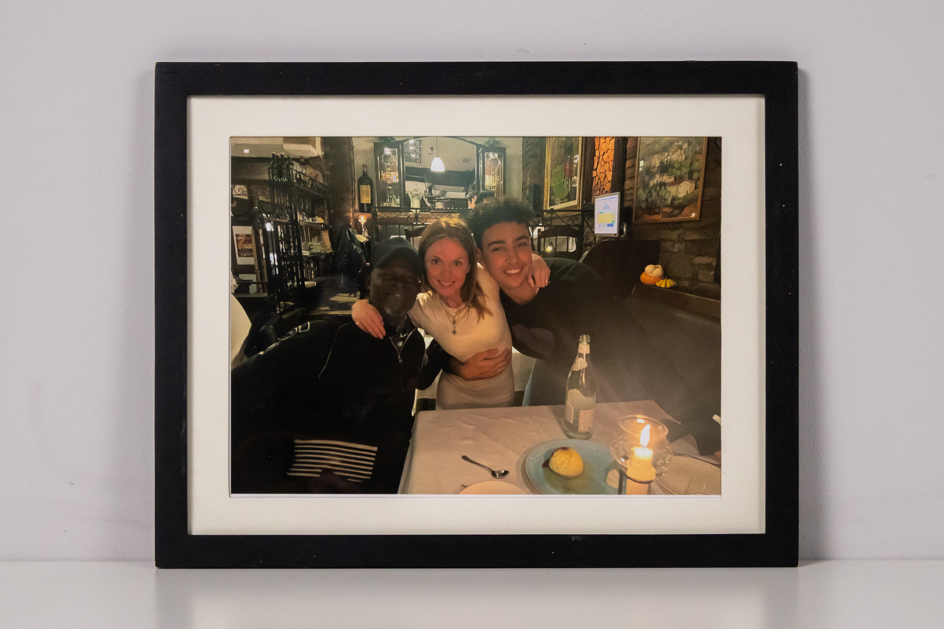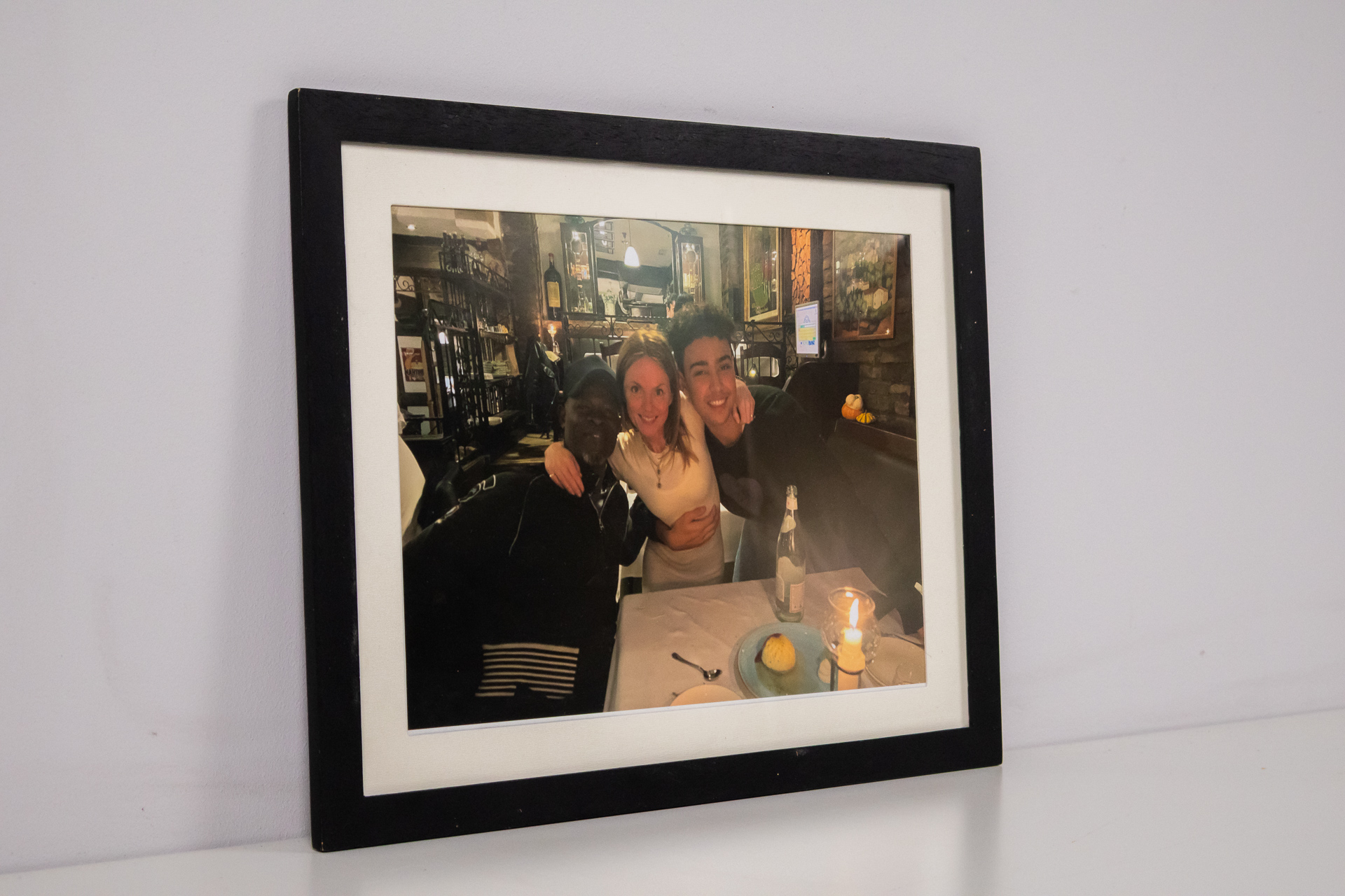 A kép három fiatal felnőttet ábrázol, akik baráti ölelésben állnak egy étteremben. A háttérben étterem belső terének részletei láthatók, beleértve a világítást és a dekorációt. A képet fekete keret keretezi, amely...