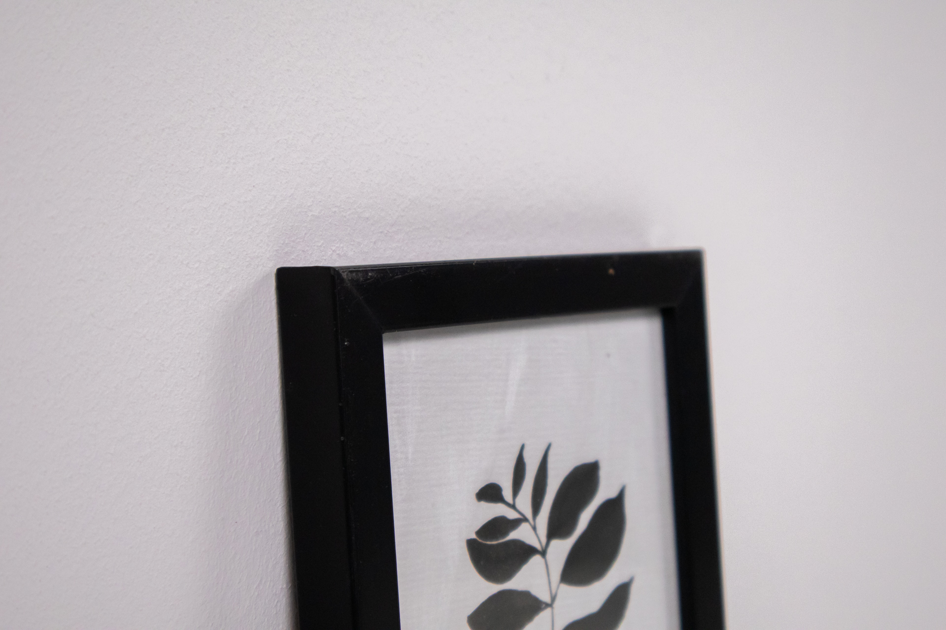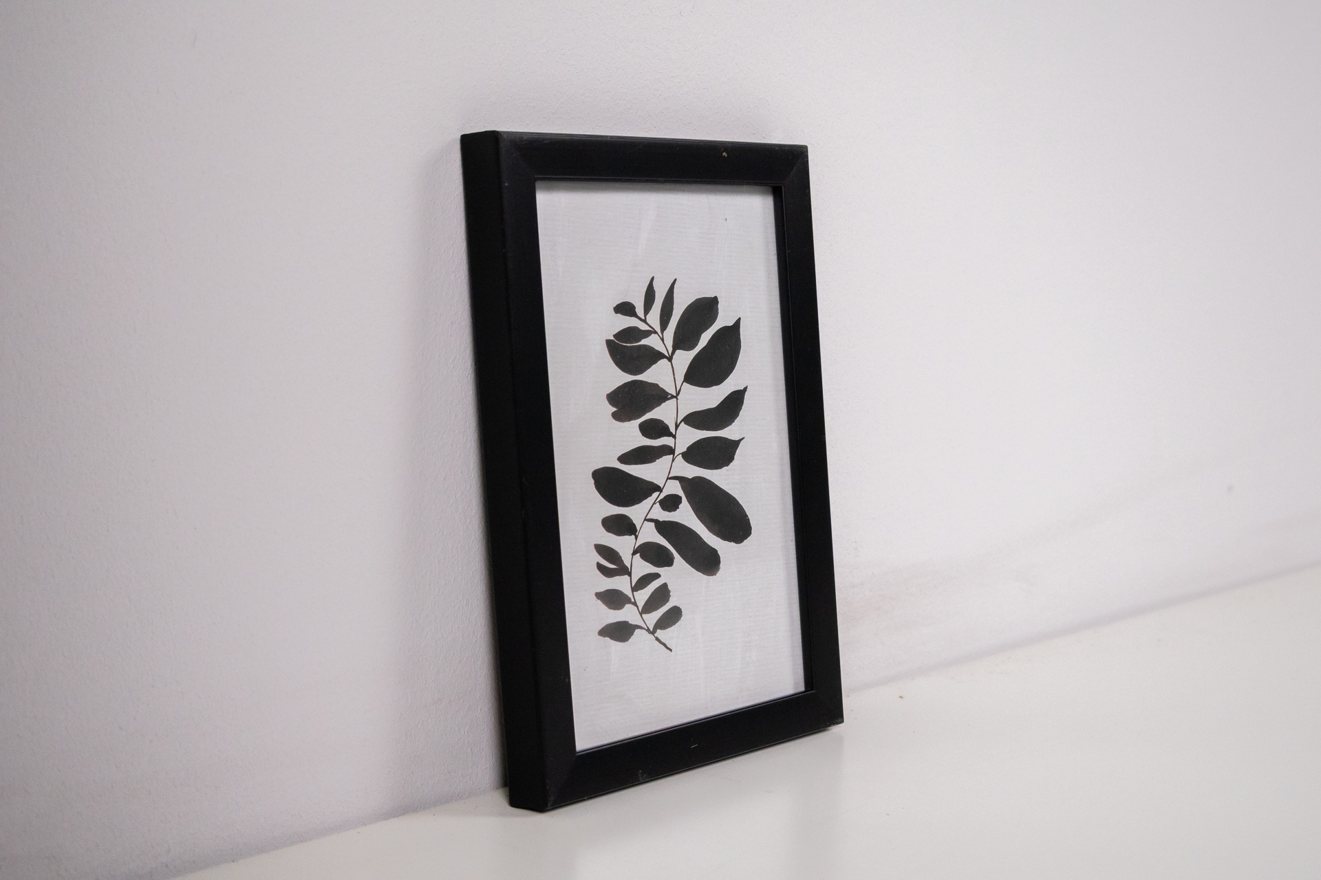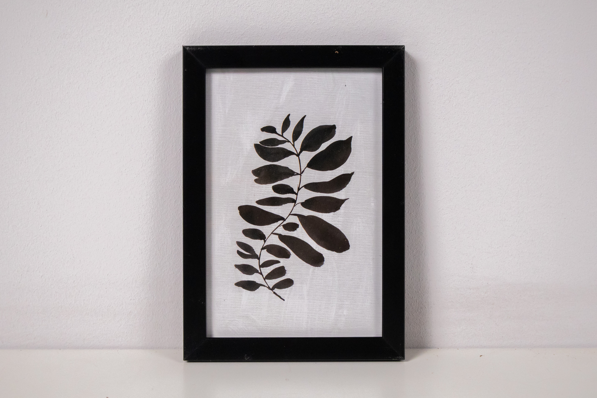 Minimalista stílusú botanikai ábrázolás, amely egy levélágat mutat be, fekete színű levelekkel. A háttér világos textúrájú, ami kiemeli a levelek formáit. A kép fekete, egyszerű vonalvezetésű keretben található,...