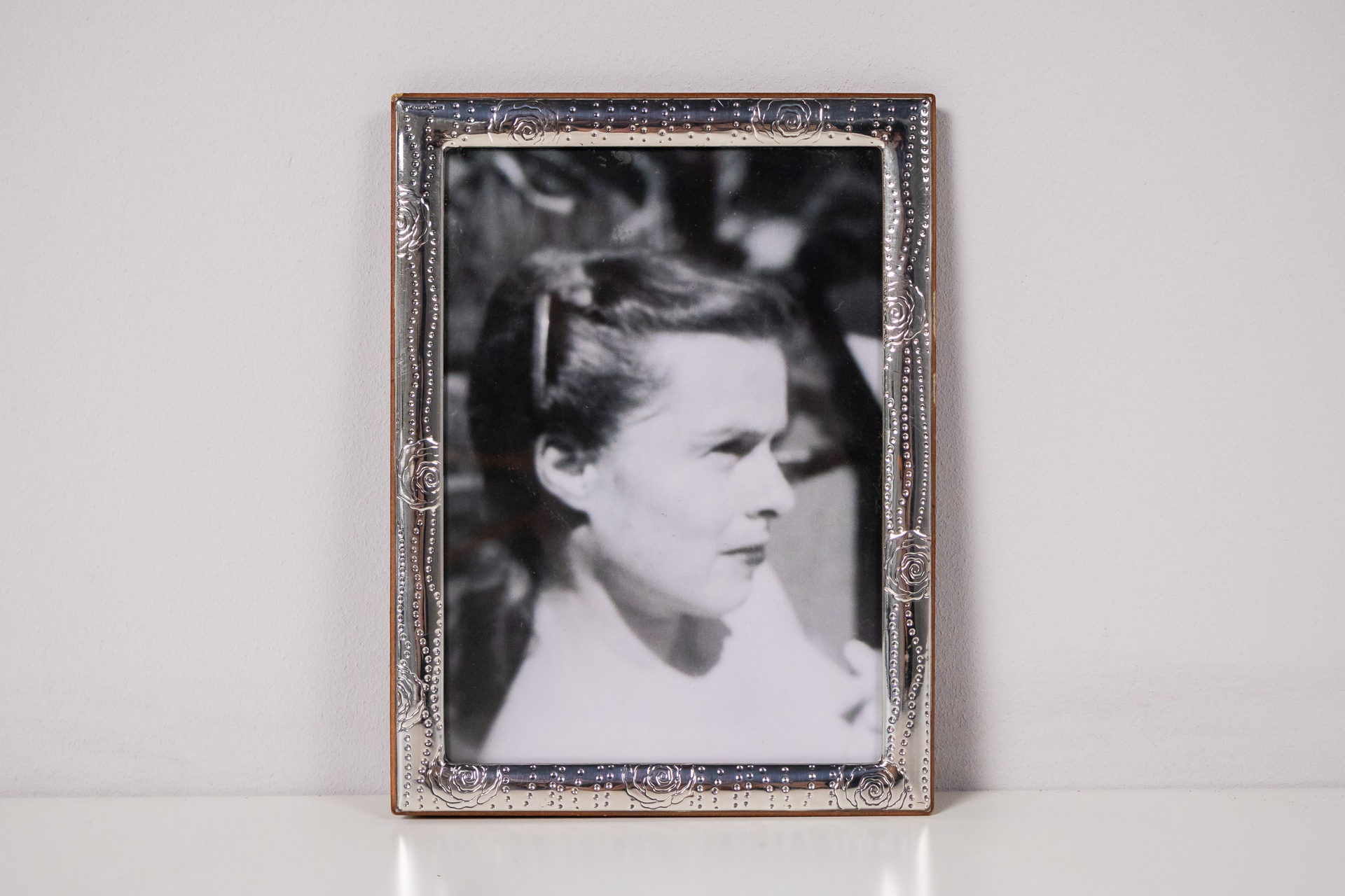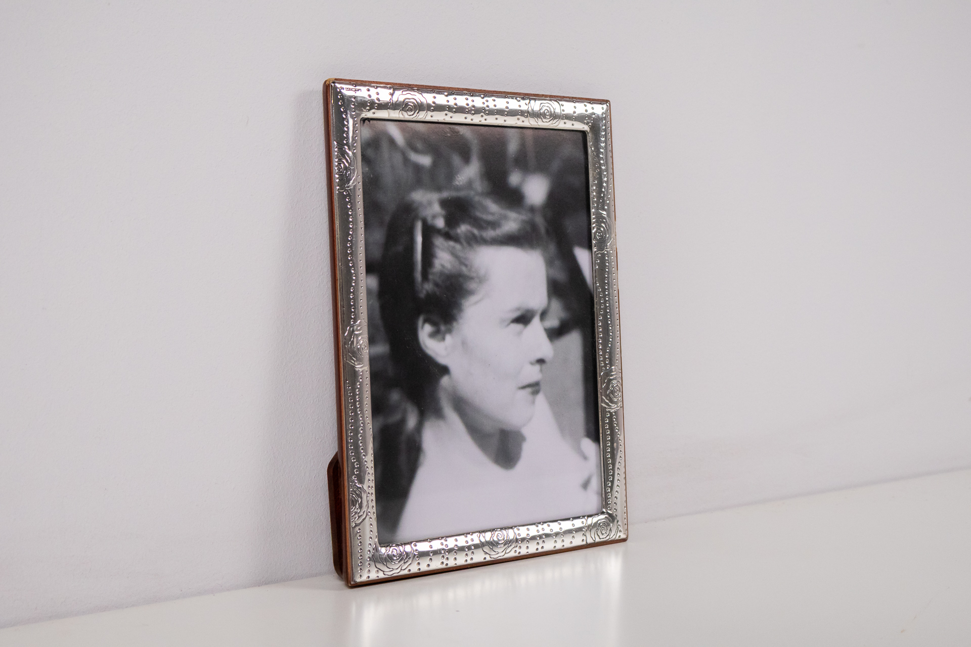 A kép egy fiatal lányt ábrázol, aki profilból néz a kamerába. A háttér homályos, így a figyelem a lány arcára összpontosul. A fénykép fekete-fehér, ami nosztalgikus hangulatot kölcsönöz. A keret díszes, ezüst színű,...