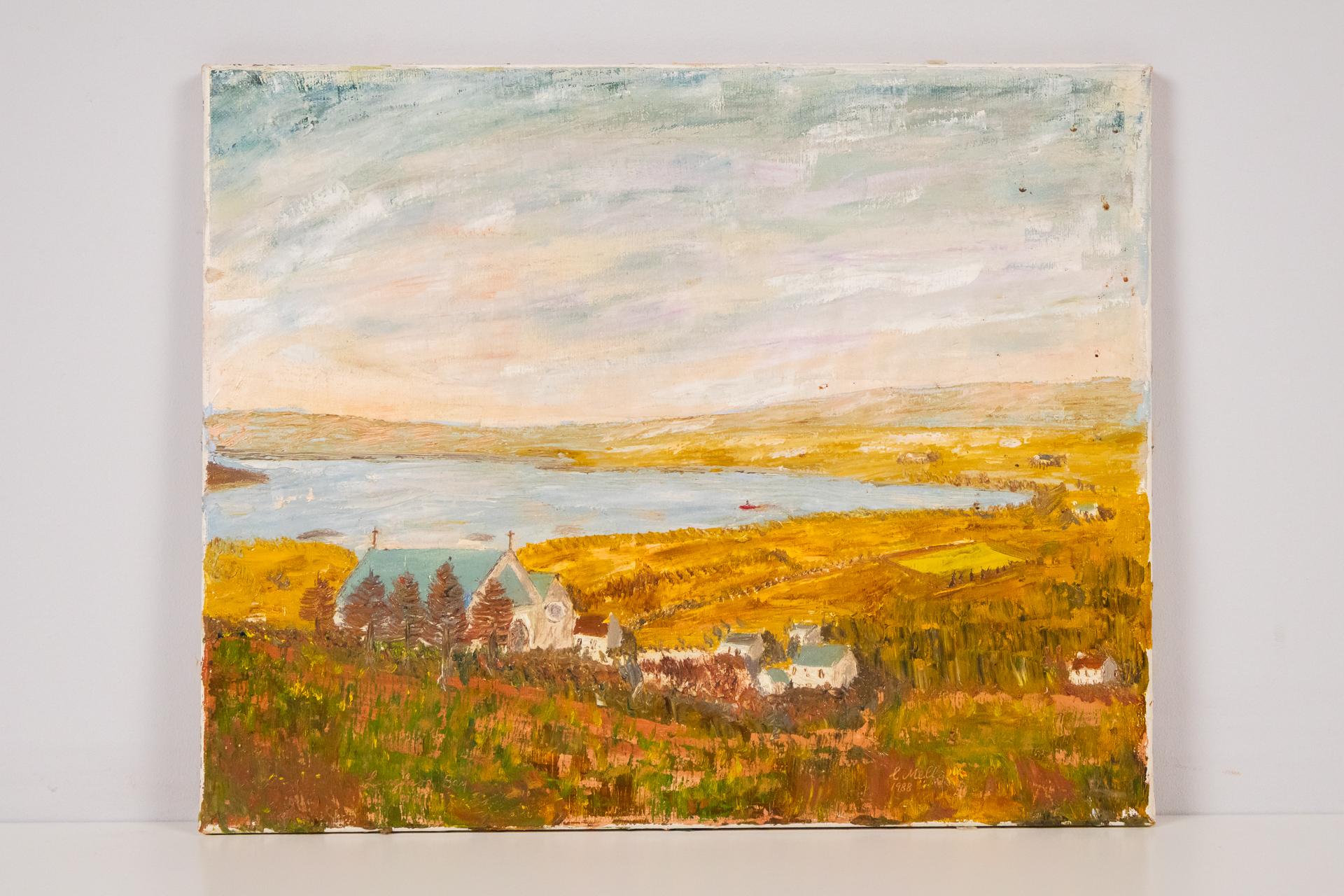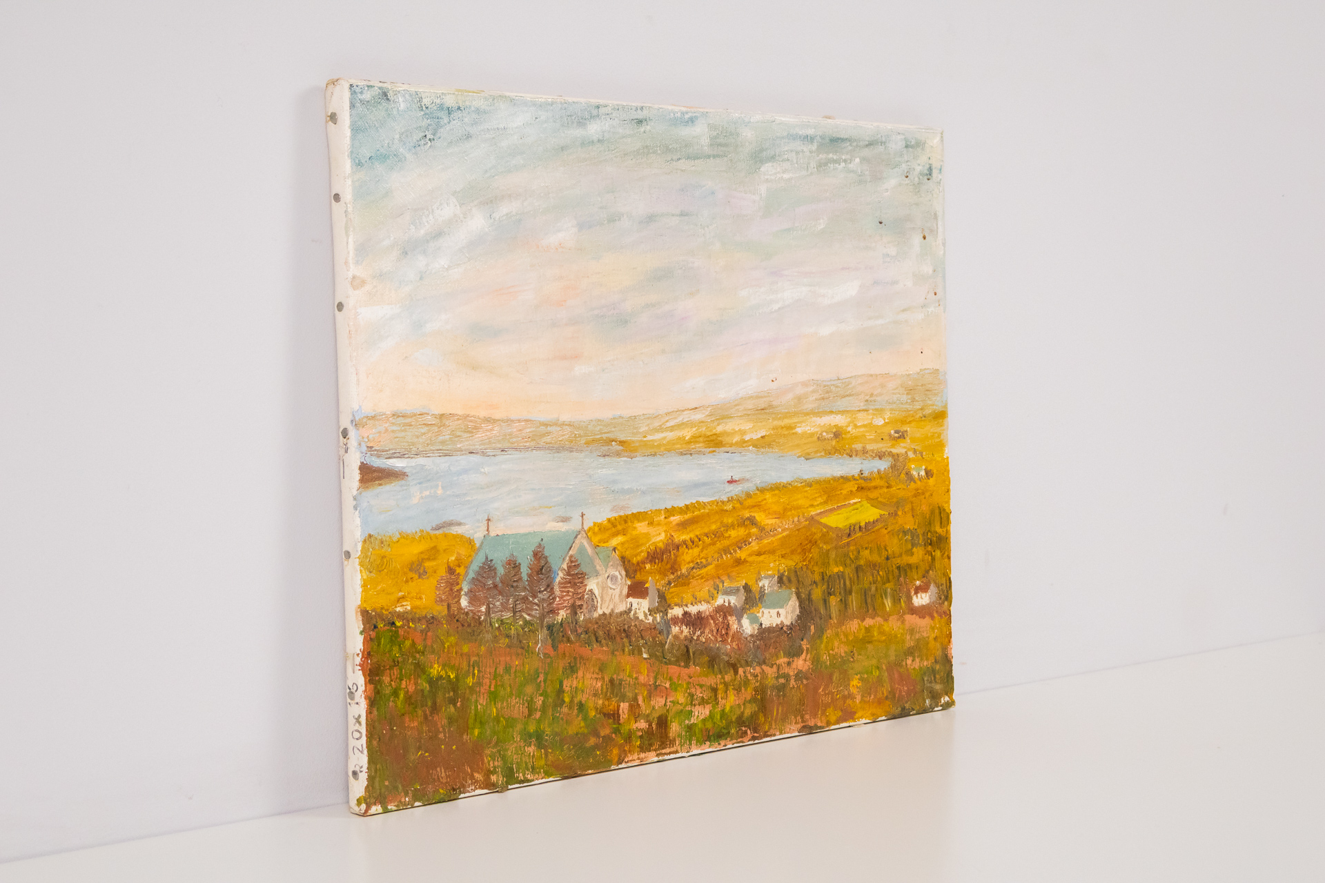 A kép egy vidéki tájat ábrázol, ahol a folyó és a falvak dominálnak. Az égbolt világos színekkel van megfestve, míg a földön a fák és a házak láthatók. A festmény technikája olajfestés, amely laza ecsetvonásokkal...