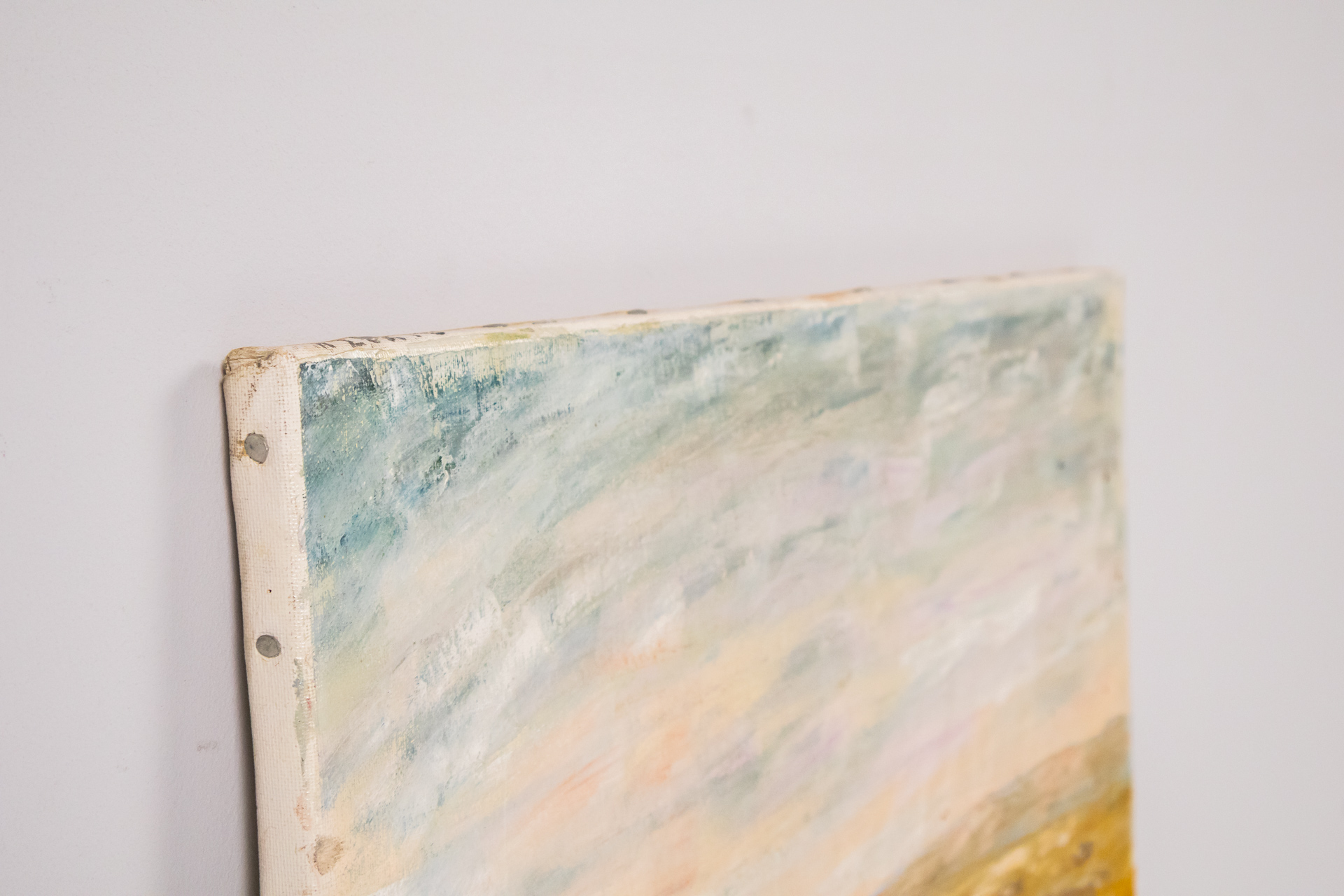 Absztrakt stílusú tájkép, amely egy naplementét ábrázol, lágy átmenetekkel a színek között. A kép középső részén sárgás árnyalatok dominálnak, míg a felső részen kék és szürke tónusok találhatók. A keret sötétbarna,...