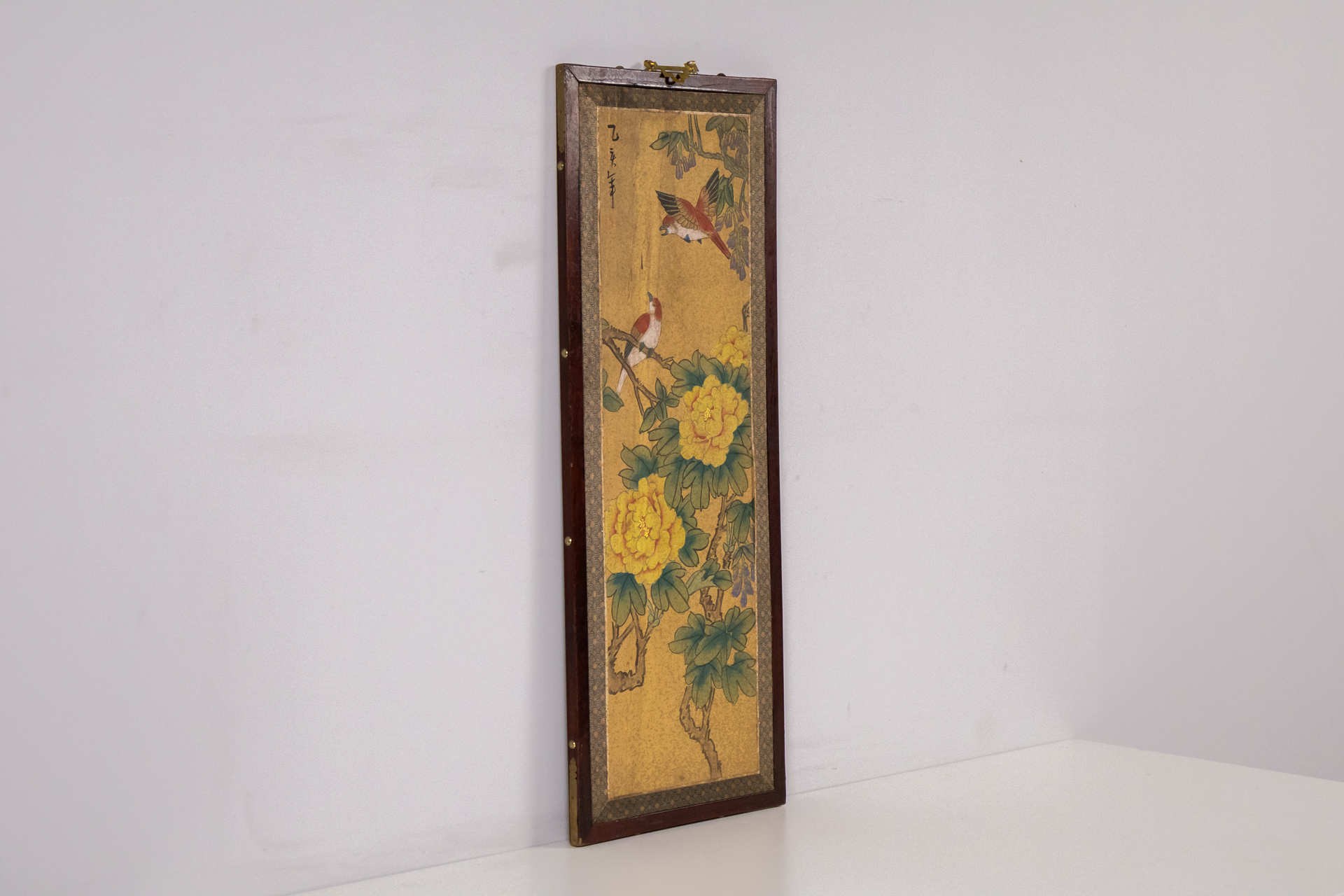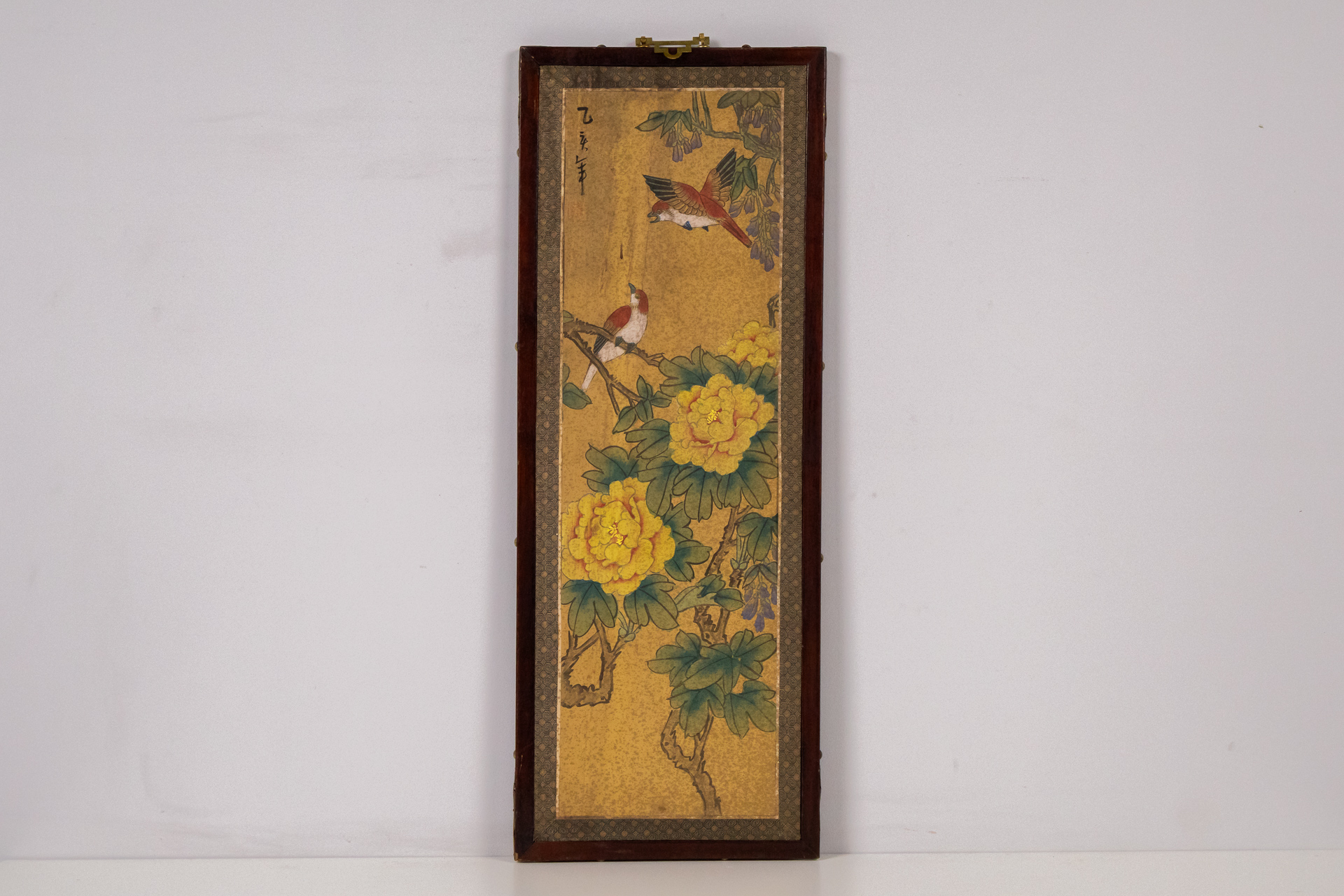 Hagyományos kínai stílusú festmény, amely egy sárga virágot és két madarat ábrázol. A háttér aranysárga, a virág élénk sárga színű, míg a madarak színei változatosak, részletesen kidolgozottak. A festmény papírra...