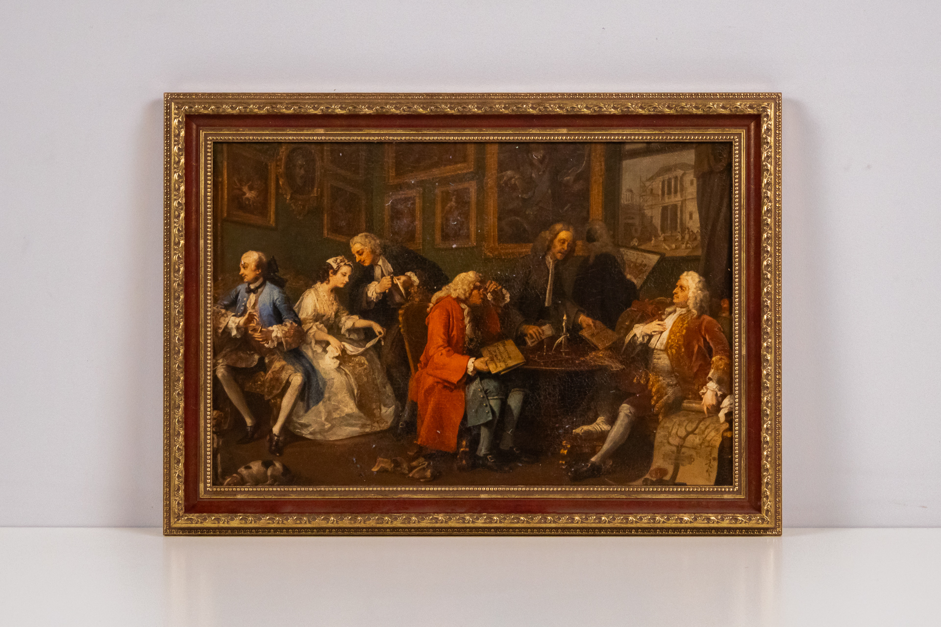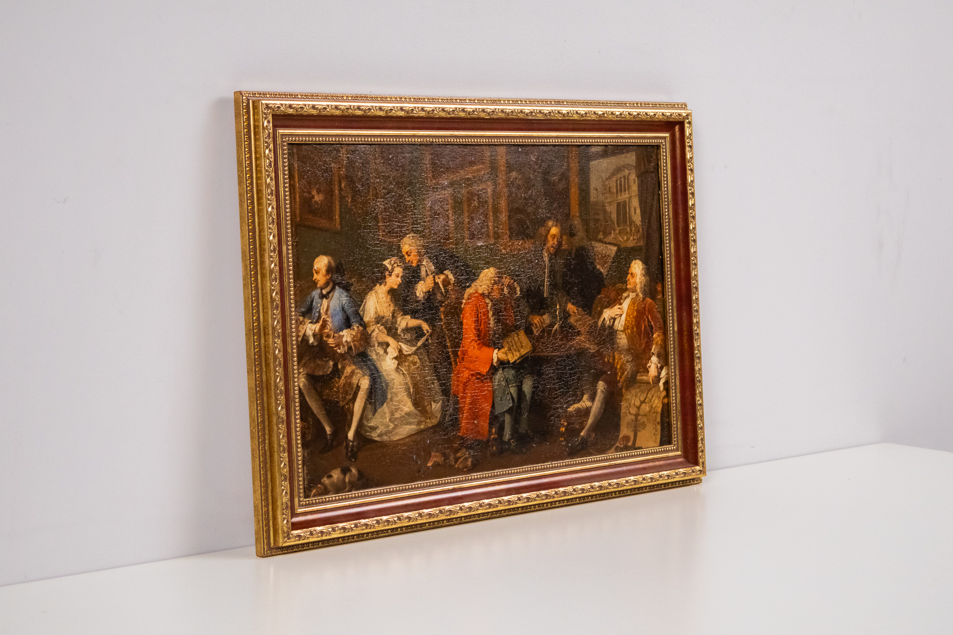 Részletgazdag barokk festmény aranyozott keretben, amely egy társasági jelenetet ábrázol, gazdag színekkel és részletes ruházattal