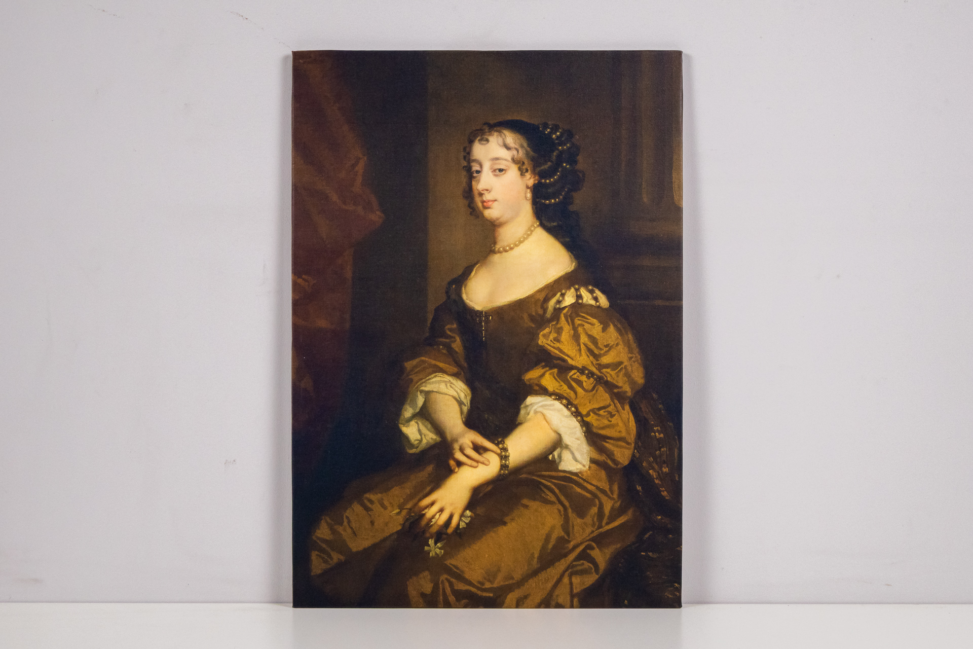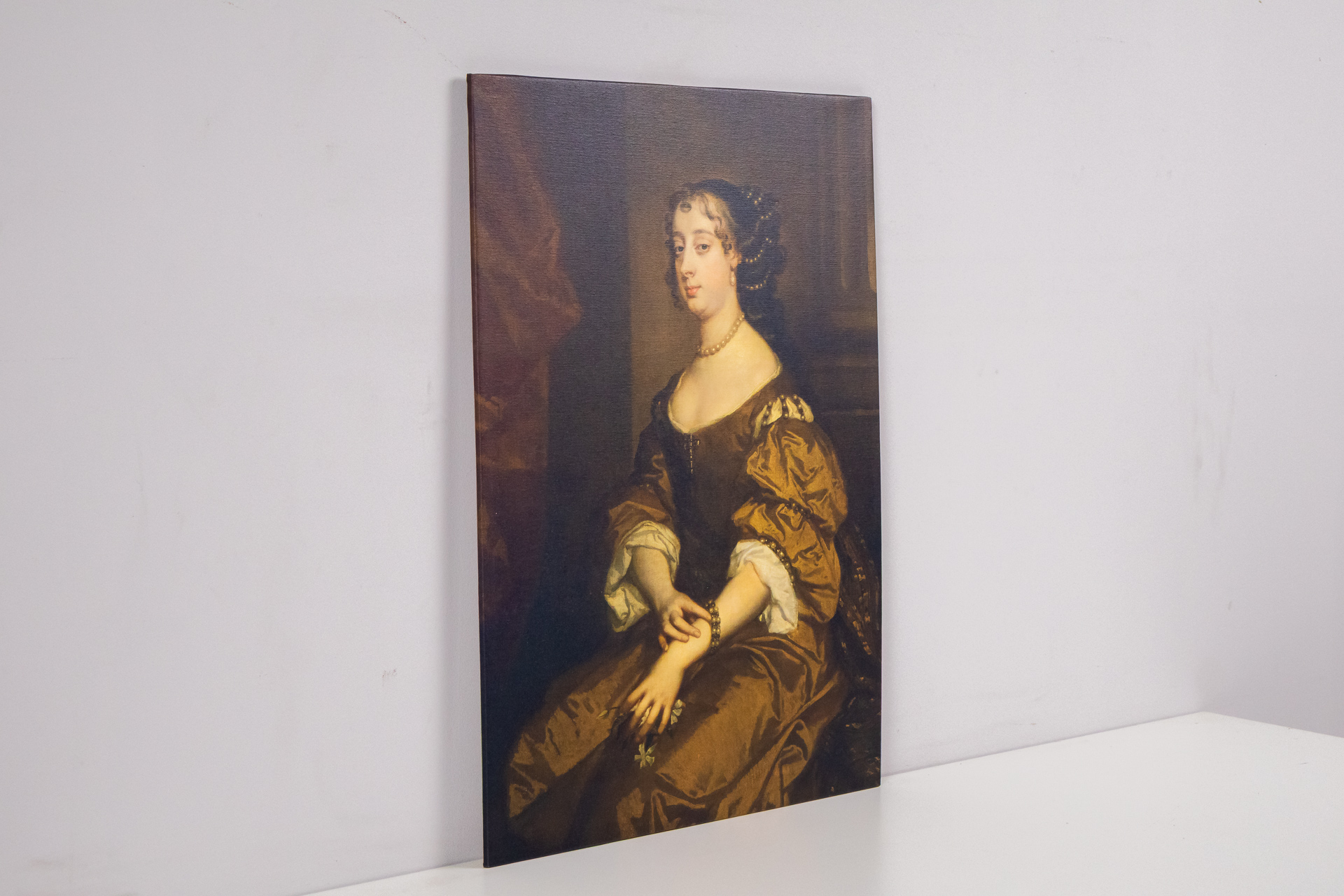 Elegáns női portré barokk stílusban, gazdag színek és részletes árnyékolás jellemzi