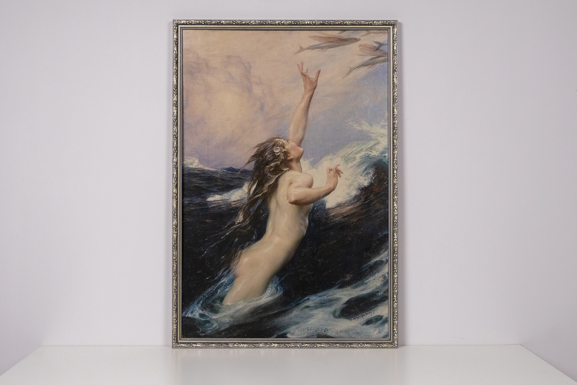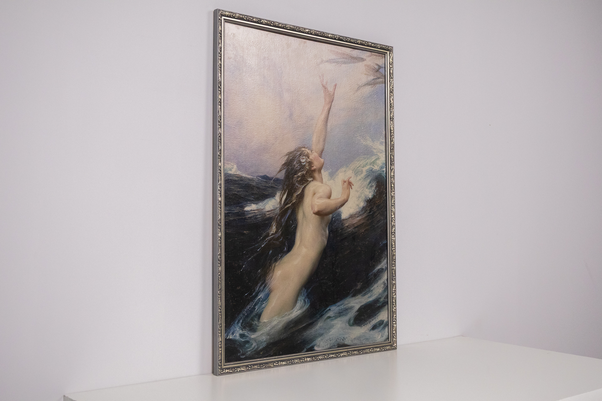A festmény egy női alakot ábrázol, aki a tenger hullámaiból emelkedik ki, karját az ég felé nyújtva. A háttérben lágy, pasztell színek dominálnak, a víz és az ég színátmenetei harmonikus összhangban vannak. Az alak...