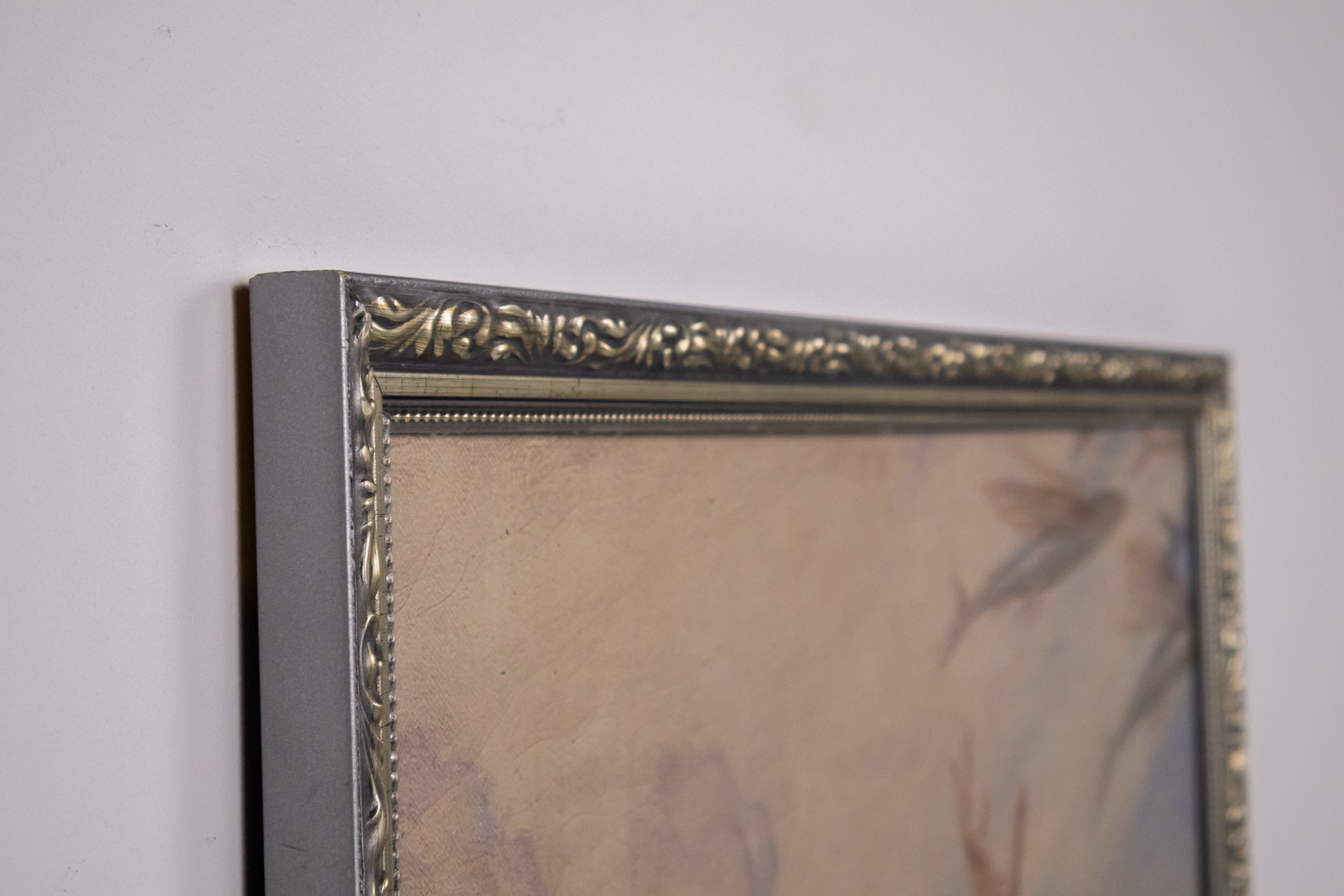 A festmény dinamikus madárjeleneteket ábrázol, különböző fajtájú madarak repülnek egy színes háttér előtt. A kompozíció gazdag színvilága sárgás és barnás árnyalatokat ölel fel, a madarak részletes kidolgozása...