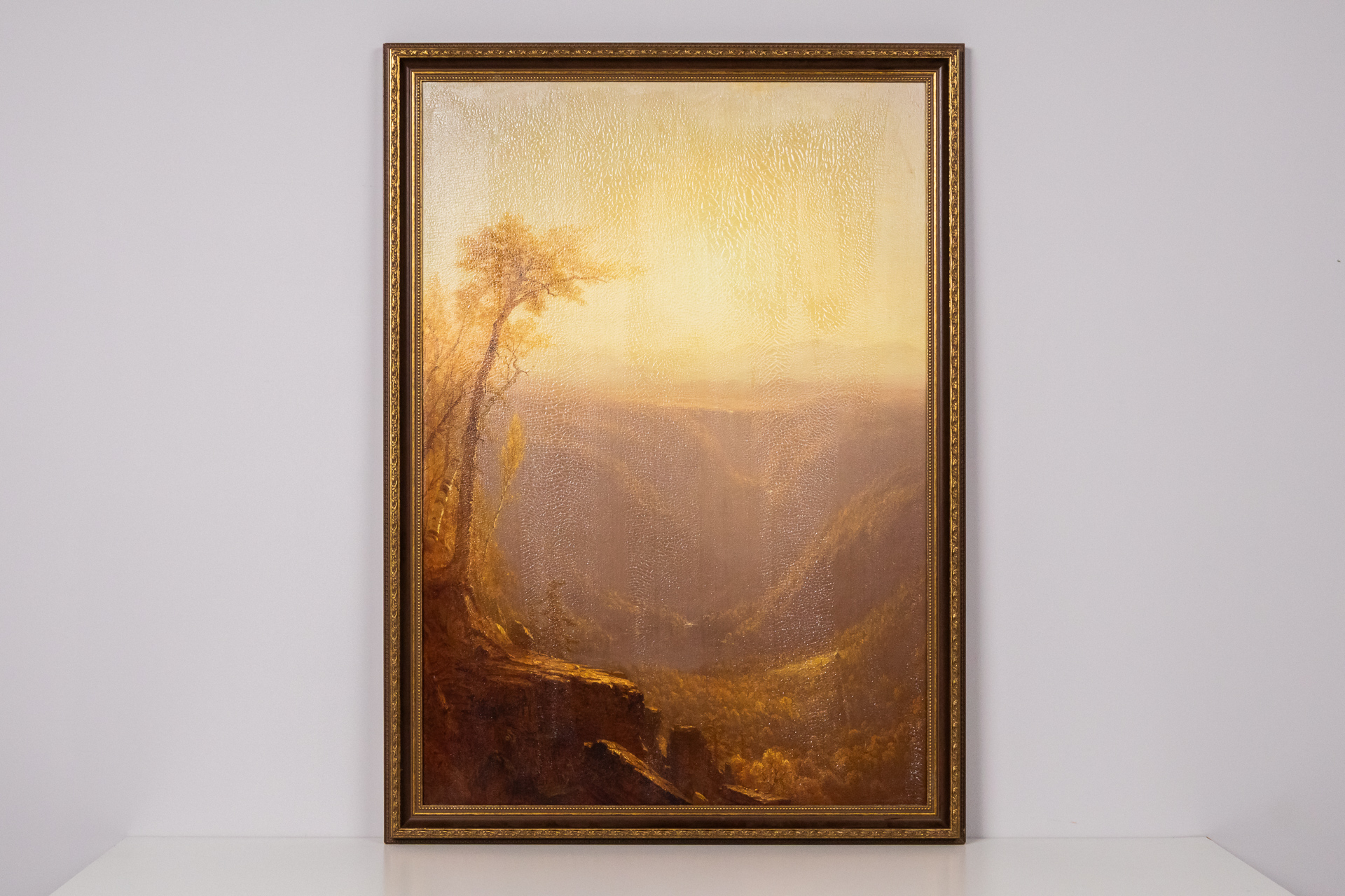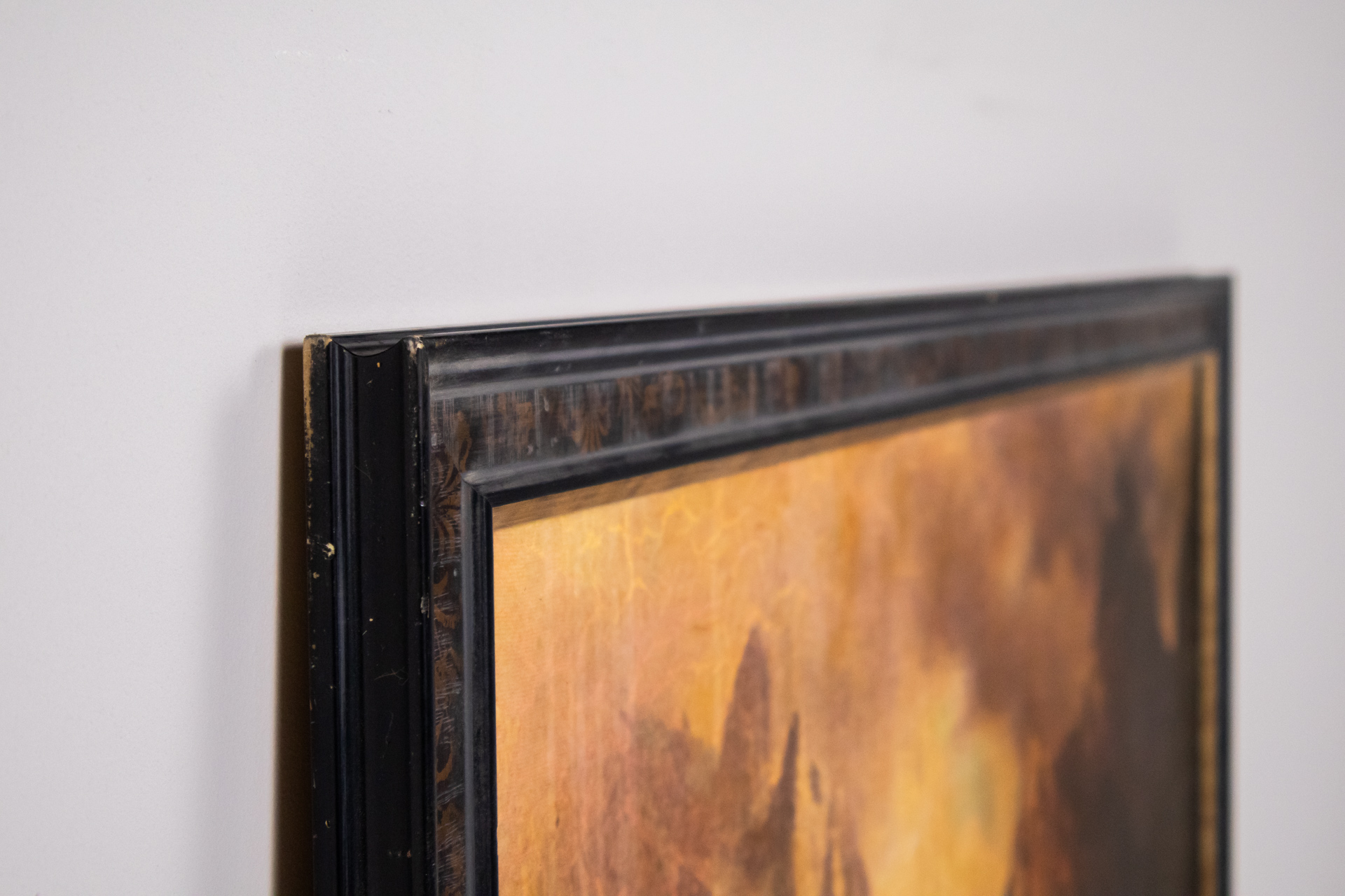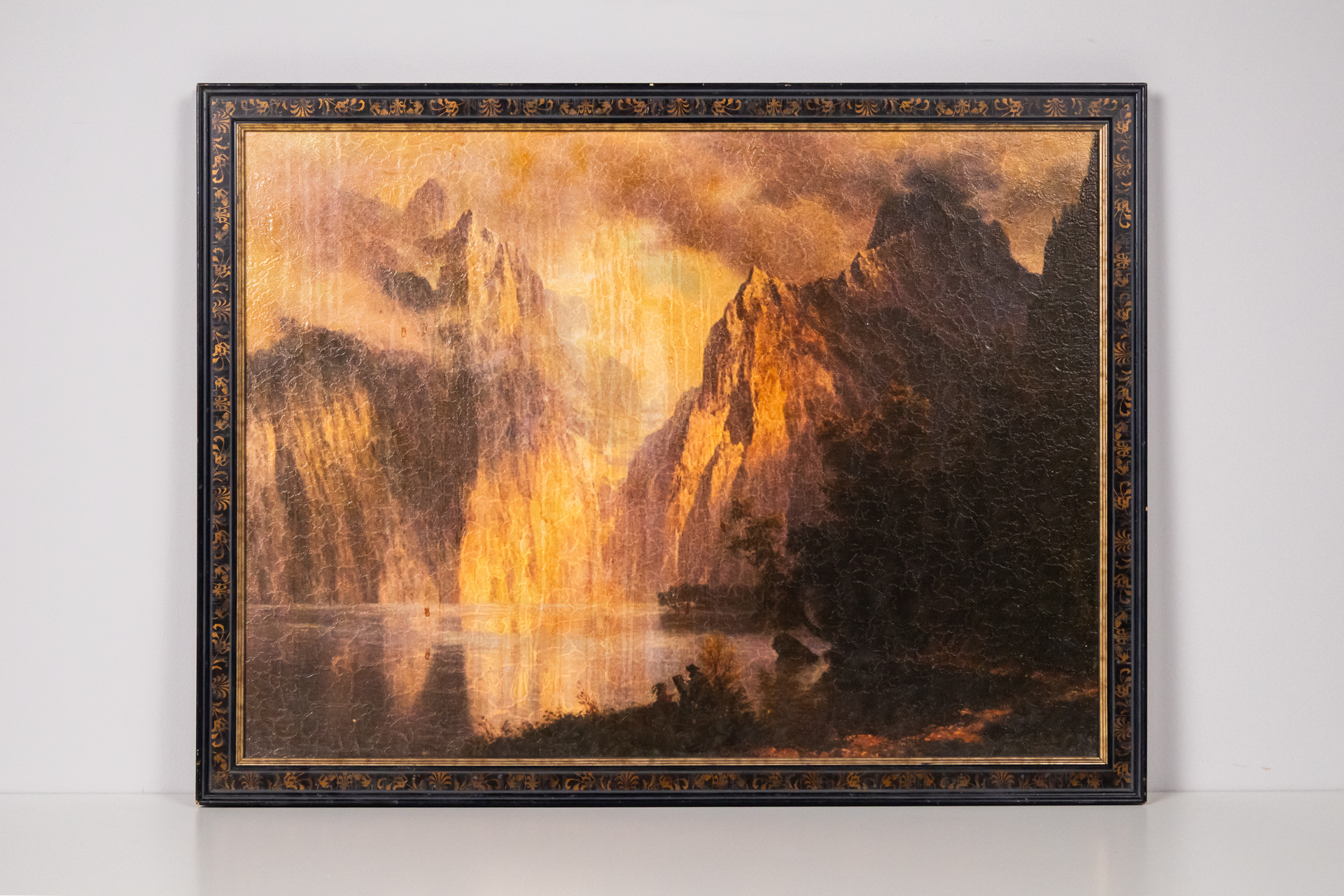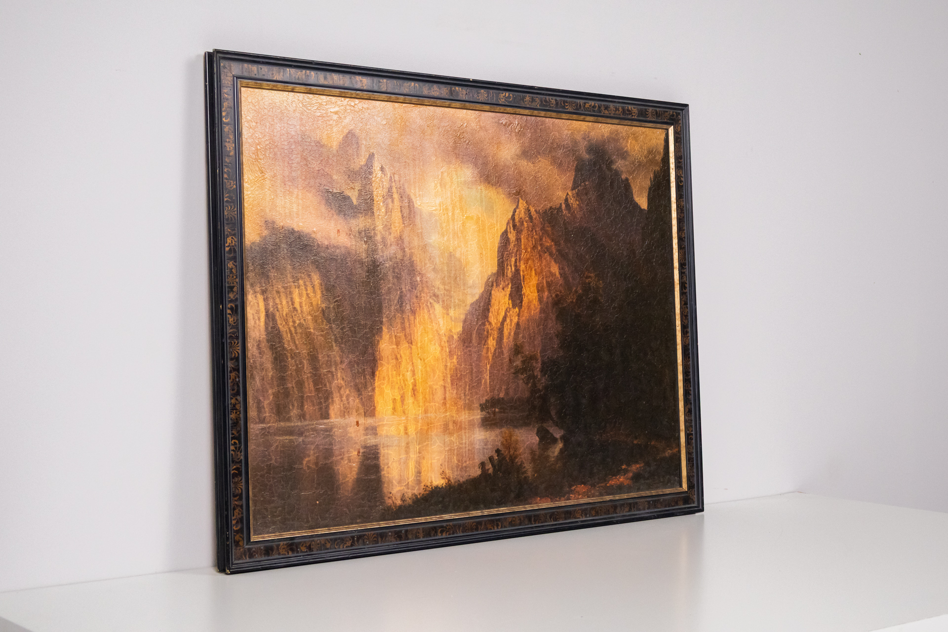 Romantikus stílusú tájképfestmény, amely hegyvidéki tájat ábrázol naplementében, dominál a sárga és narancssárga árnyalatokkal, a hegyek és a víz tükröződése látható. A festmény díszes, fekete és arany színű keretben...