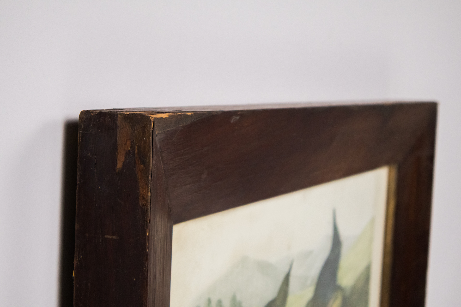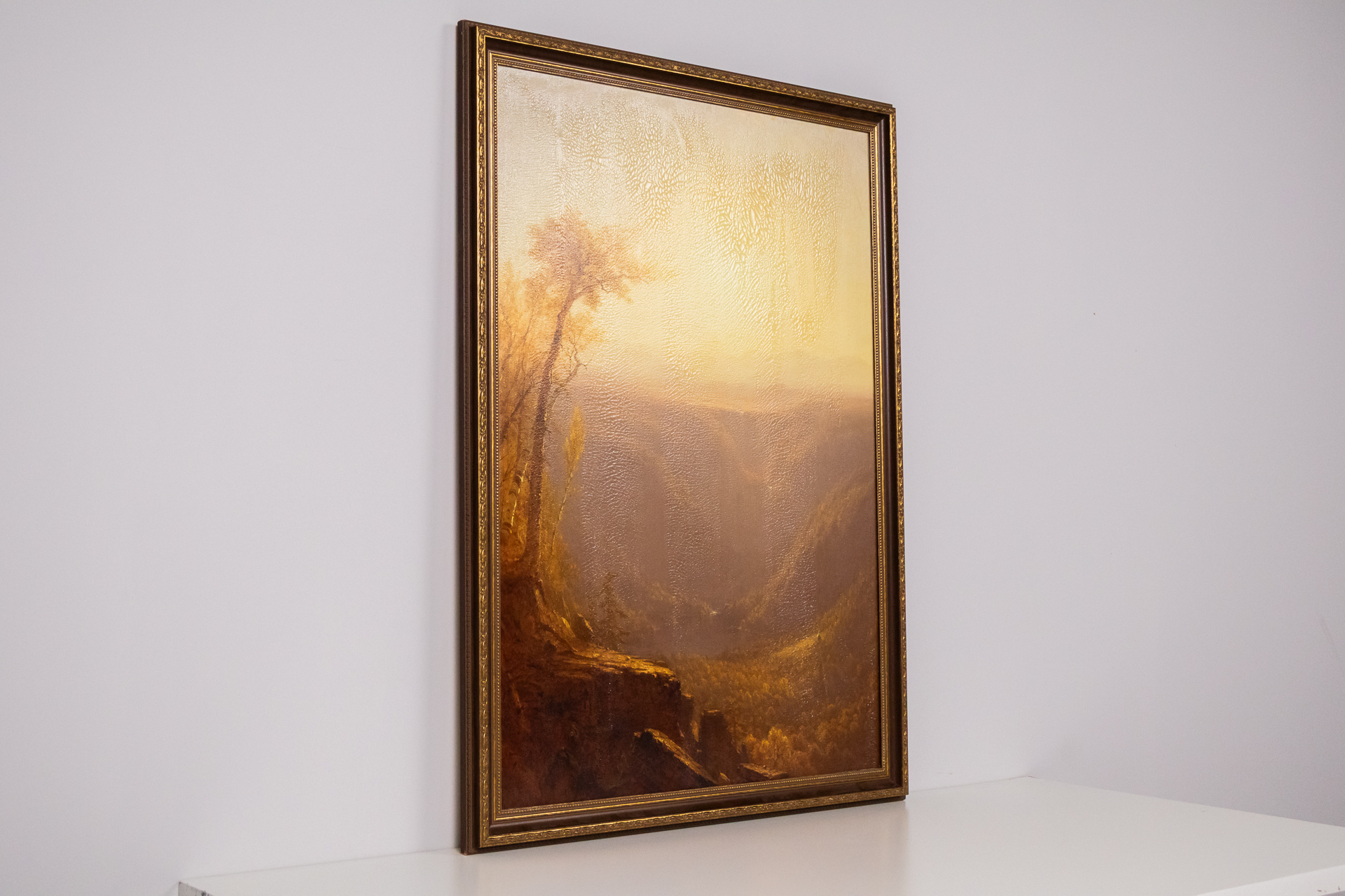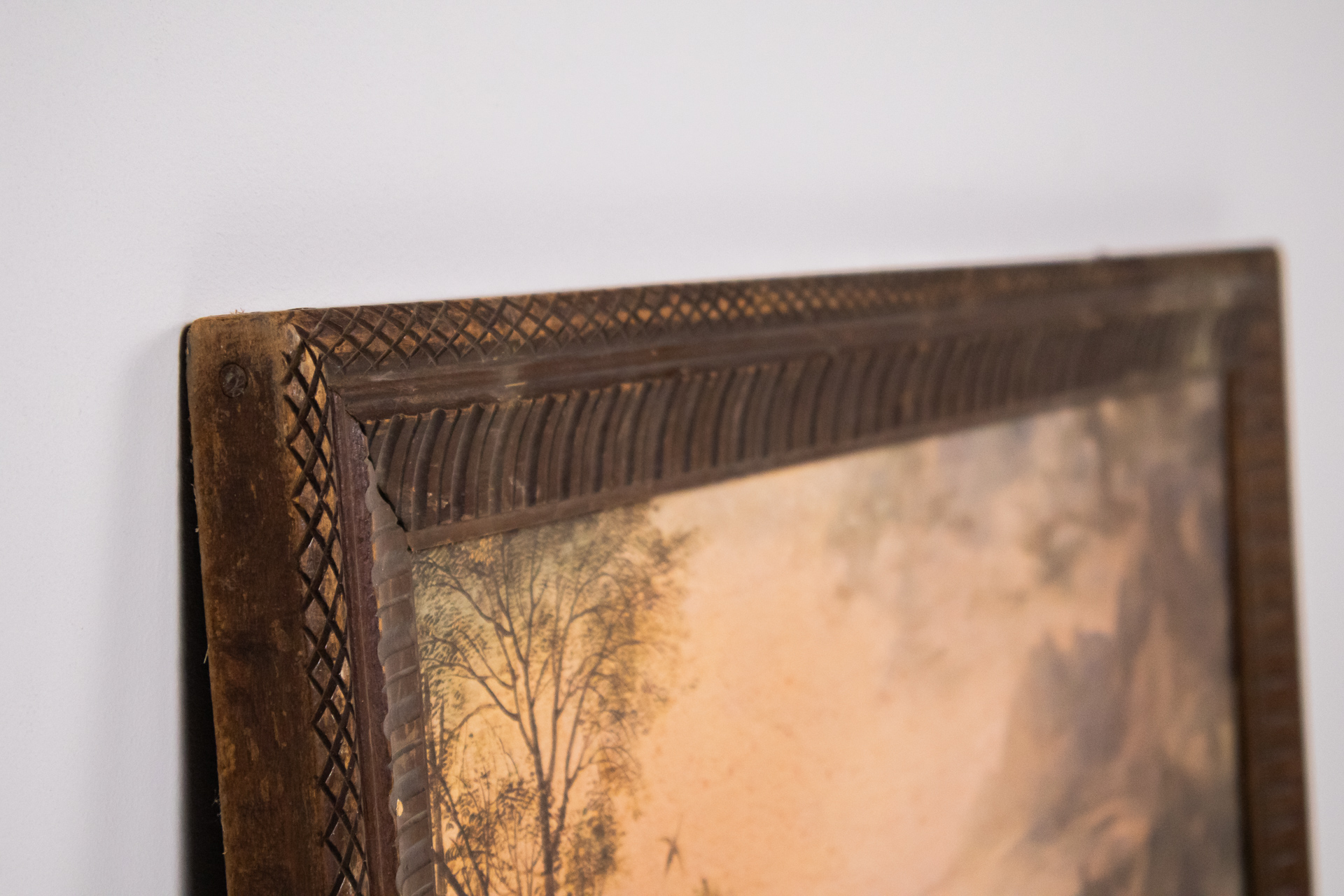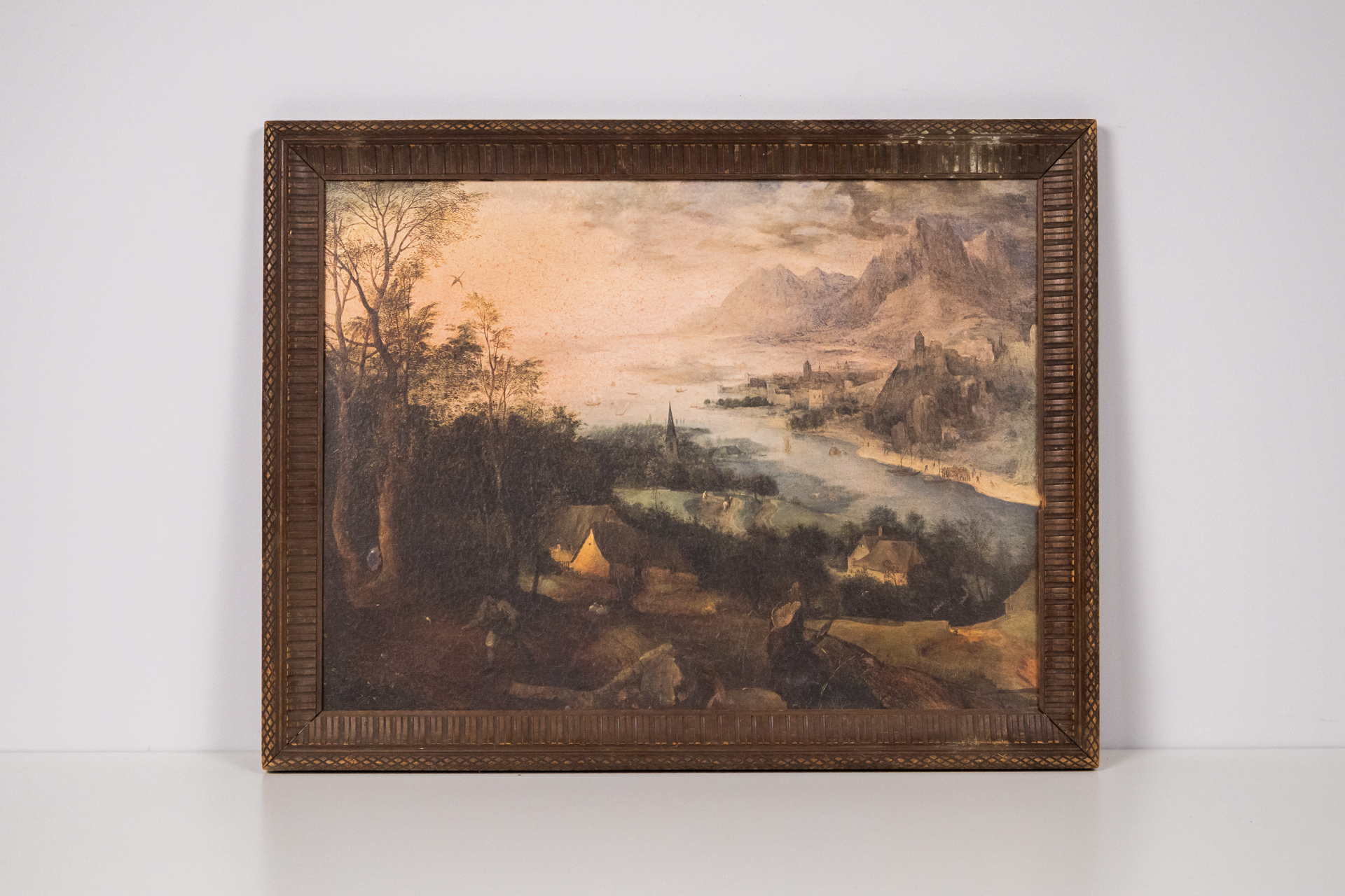 Romantikus stílusú tájkép, amely egy festői vidéki tájat ábrázol, folyóval, hegyekkel és fákkal. A színek lágyak és melegek, a naplemente fényei tükröződnek a víz felszínén. A keret sötétbarna fából készült, finoman...