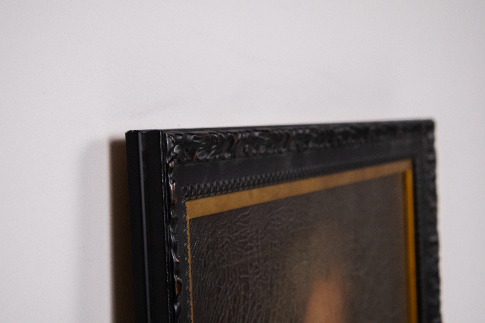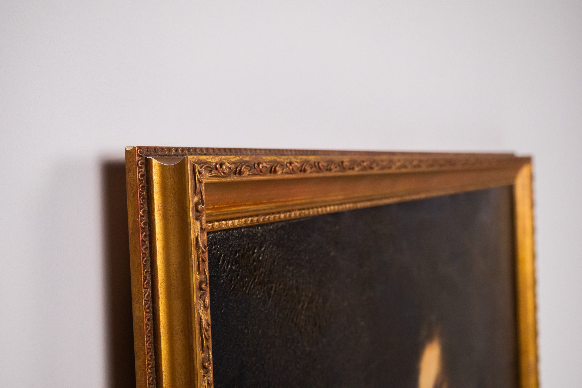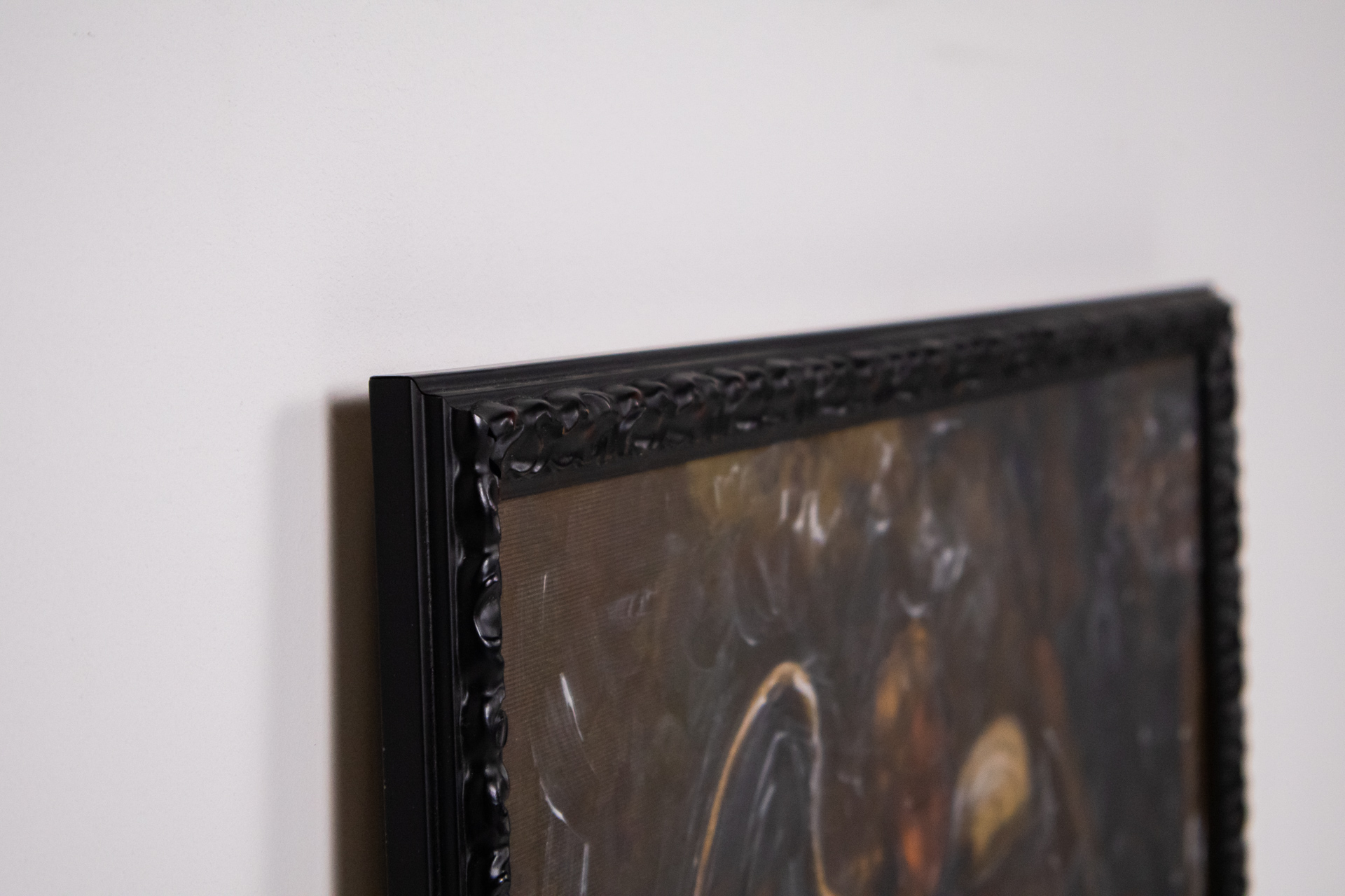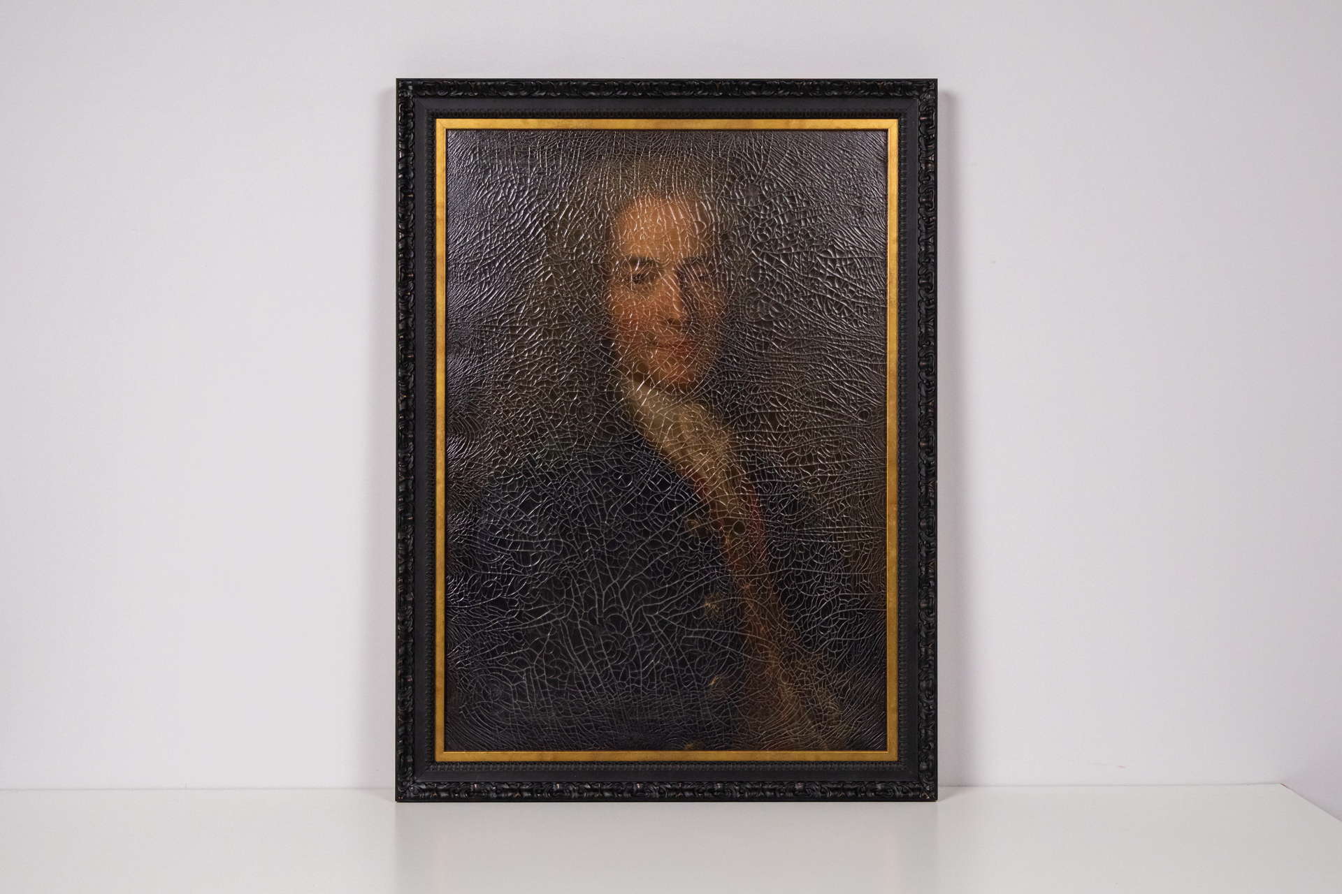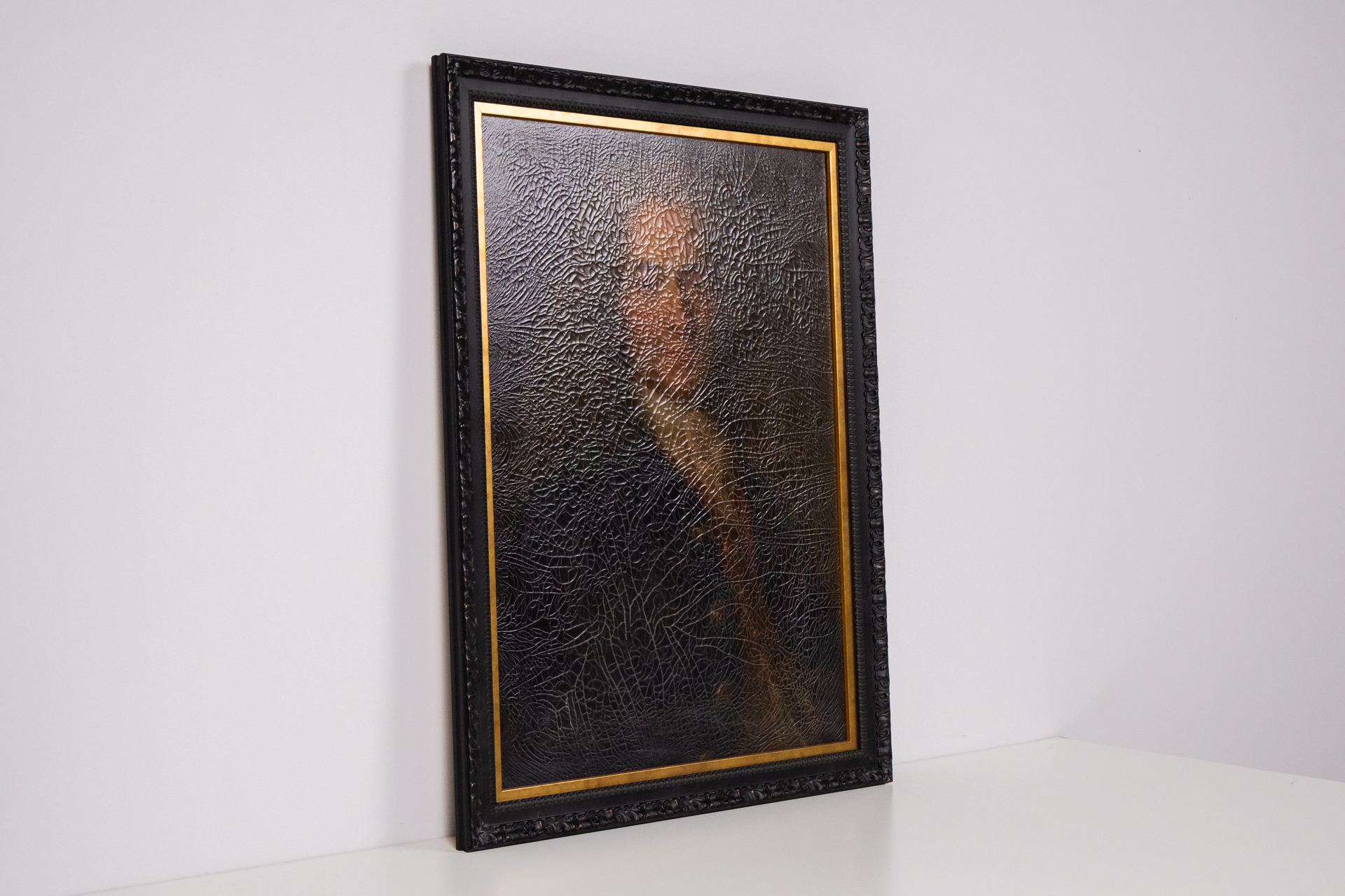 A kép egy férfi portréját ábrázolja, akinek arca részben homályos, a háttér sötét tónusú. A festmény olajjal készült, a felület repedezett, ami az idő múlásának nyomait mutatja. A keret fekete színű, aranyozott...