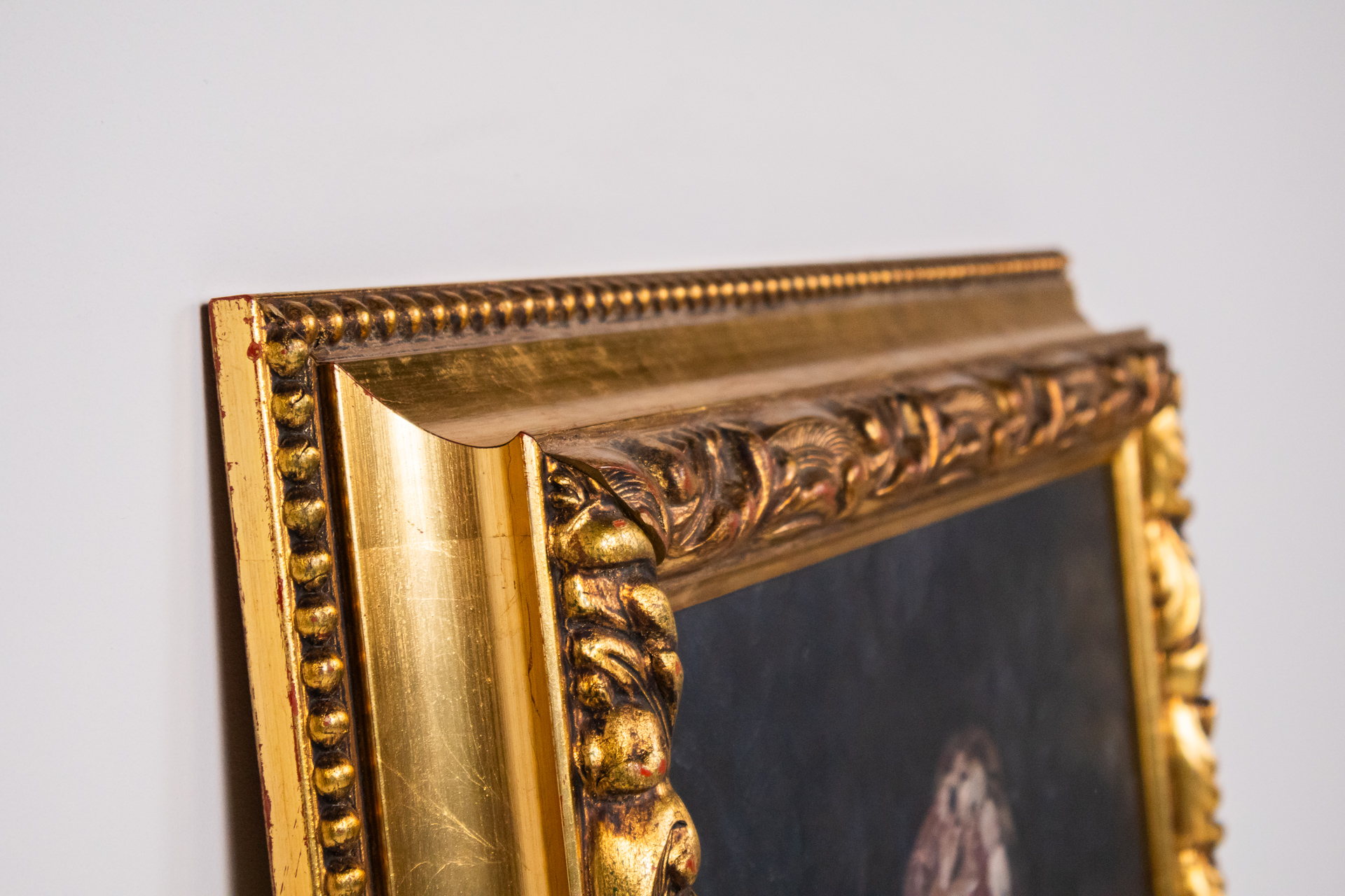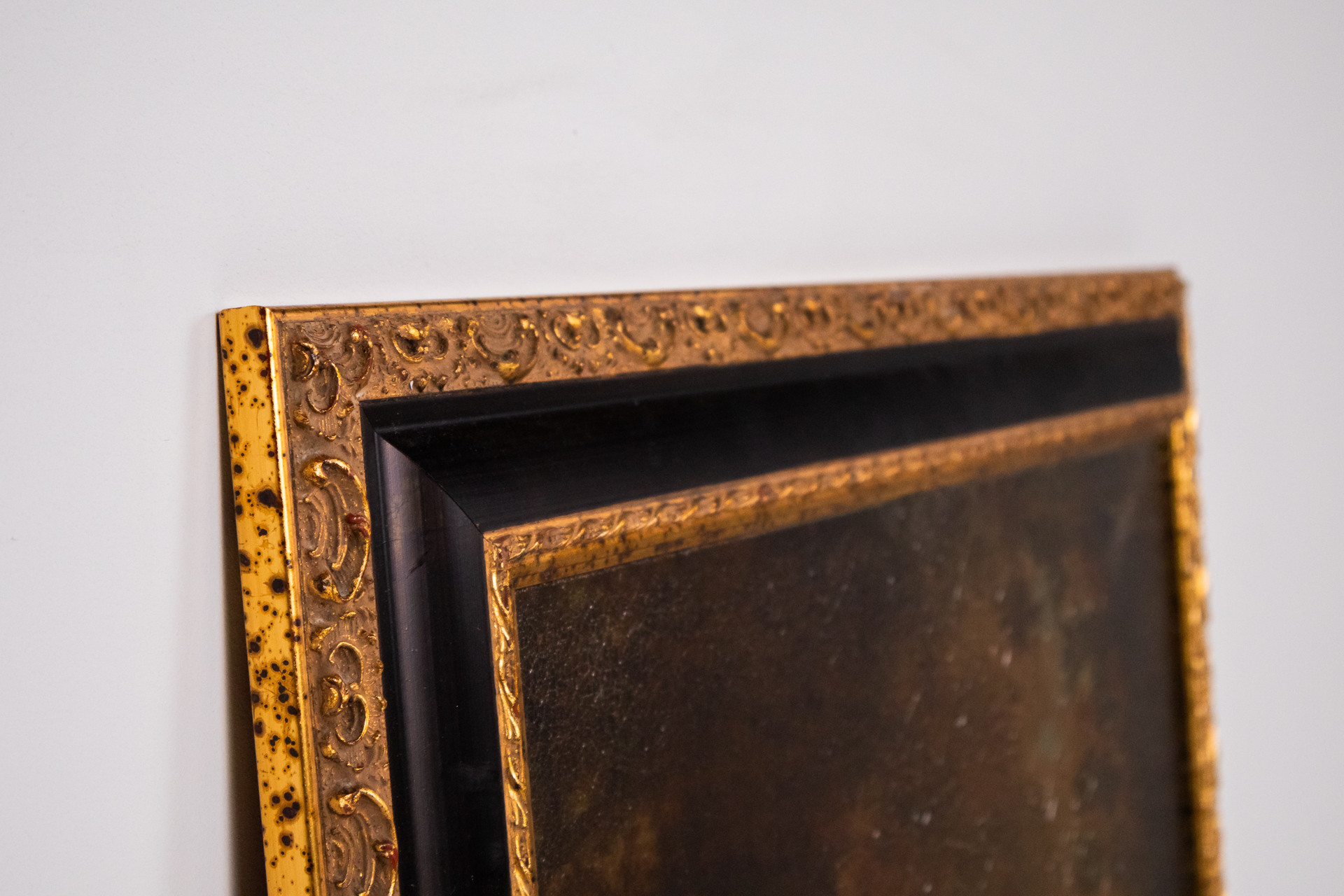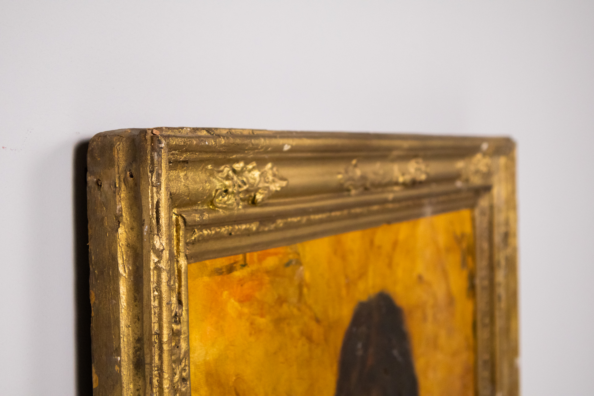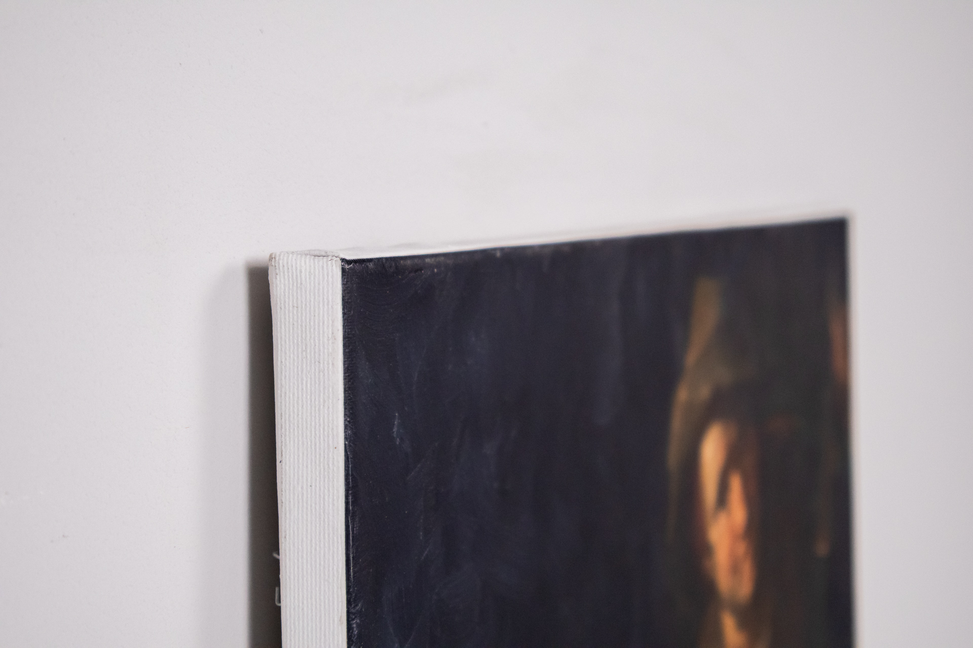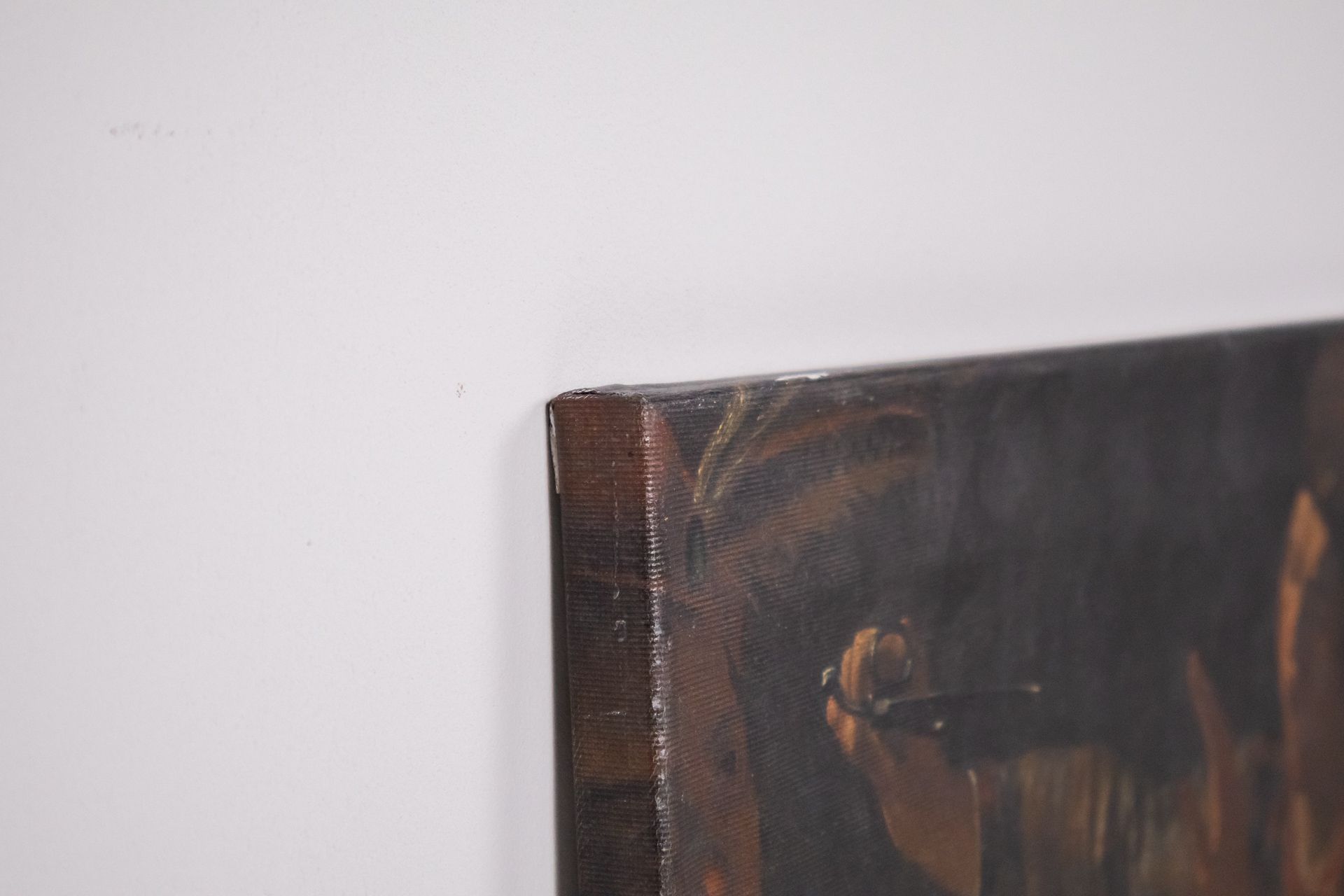 A kép egy férfi portréját ábrázolja, akinek arca részben homályos, a háttér sötét tónusú. A festmény olajjal készült, a felület repedezett, ami az idő múlásának nyomait mutatja. A keret fekete színű, aranyozott...