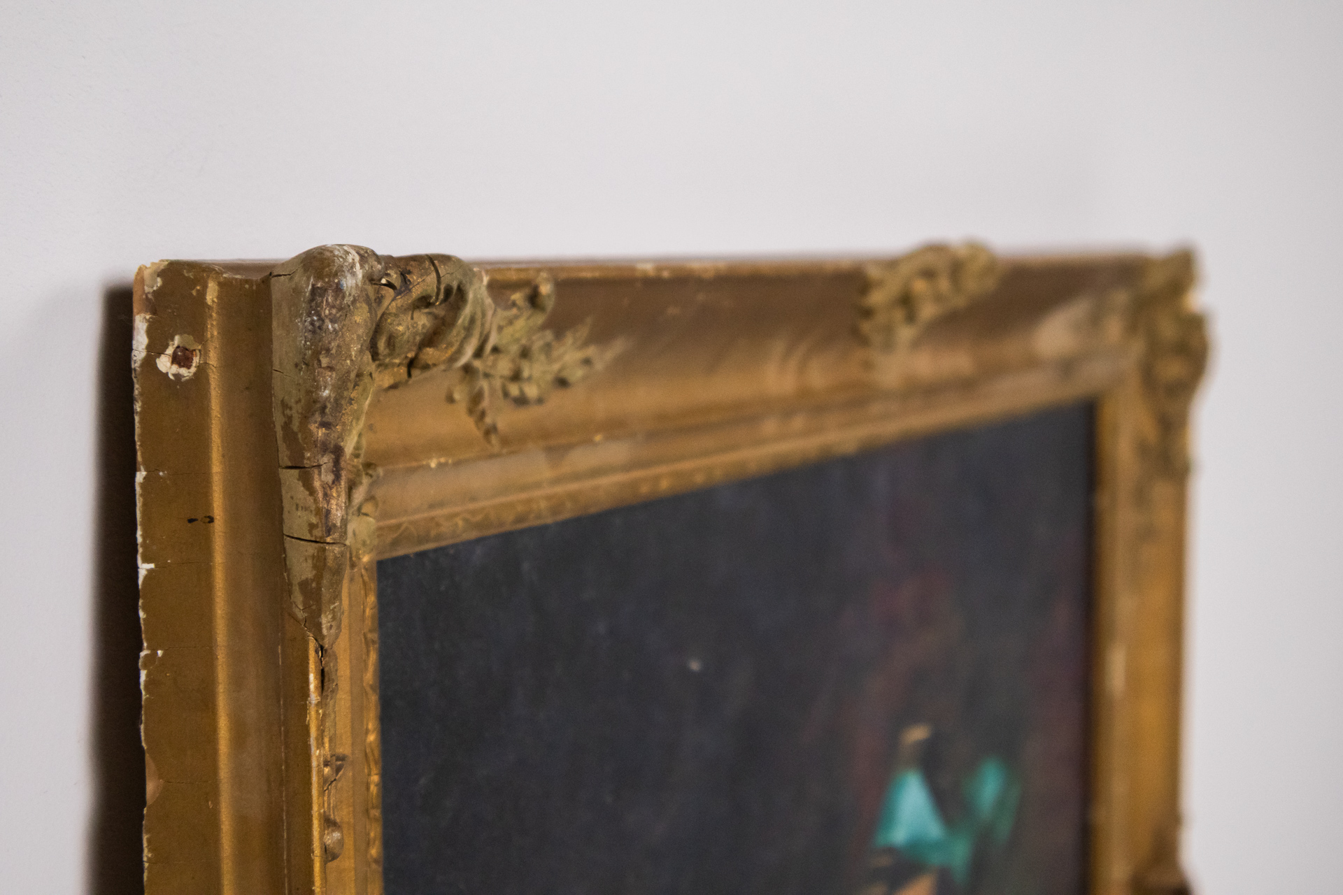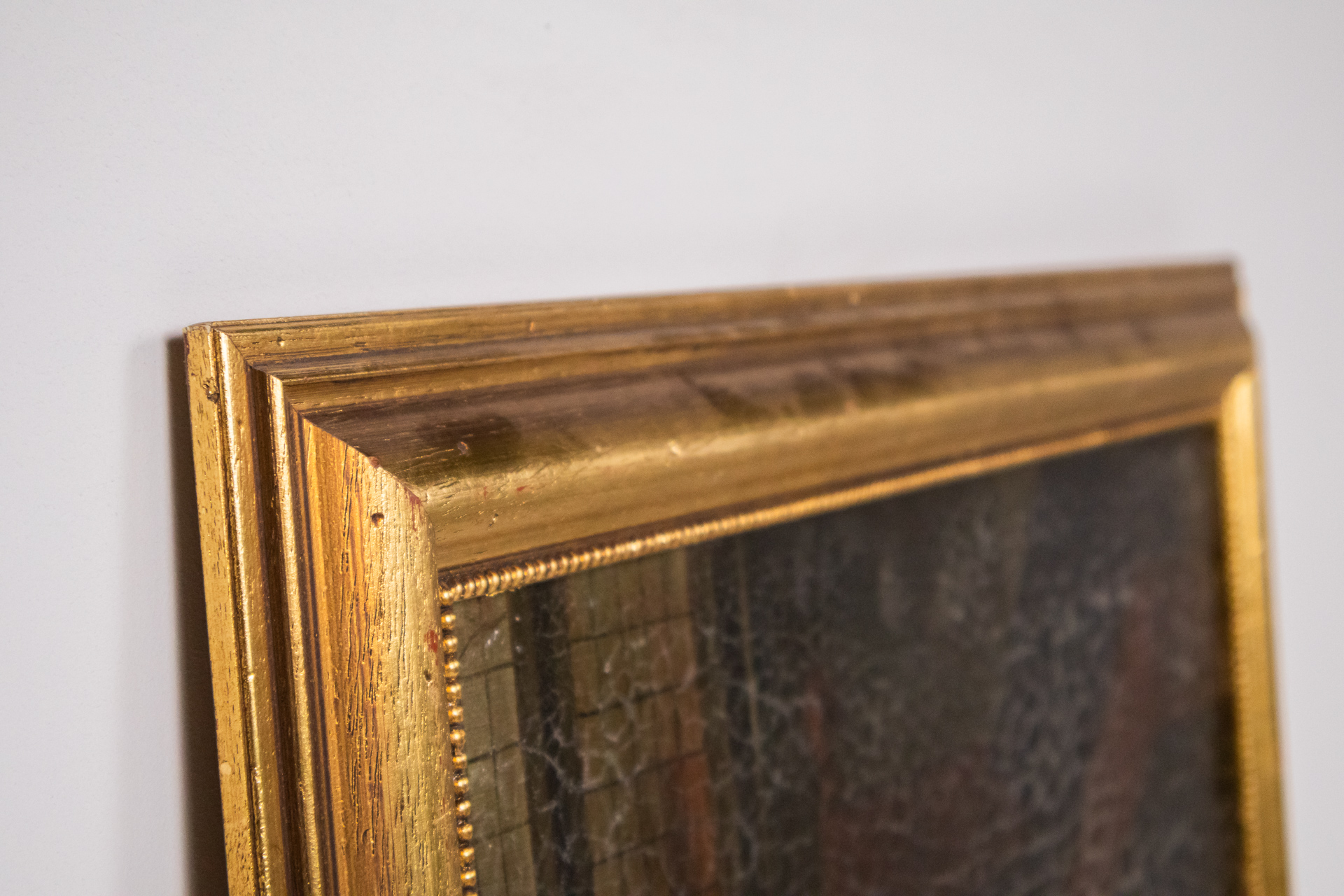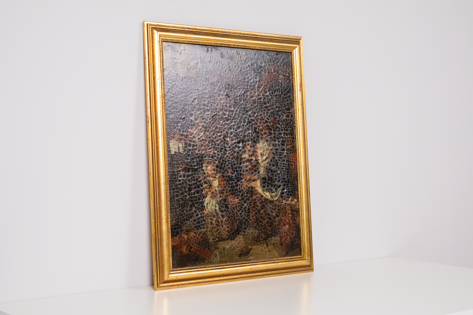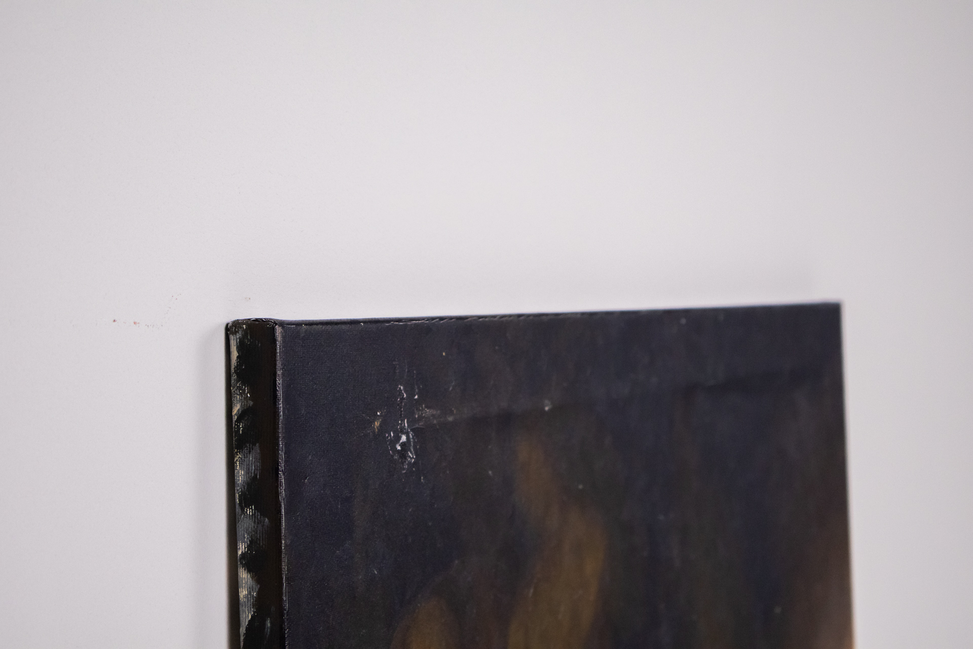 A kép egy férfi portréját ábrázolja, akinek arca részben homályos, a háttér sötét tónusú. A festmény olajjal készült, a felület repedezett, ami az idő múlásának nyomait mutatja. A keret fekete színű, aranyozott...