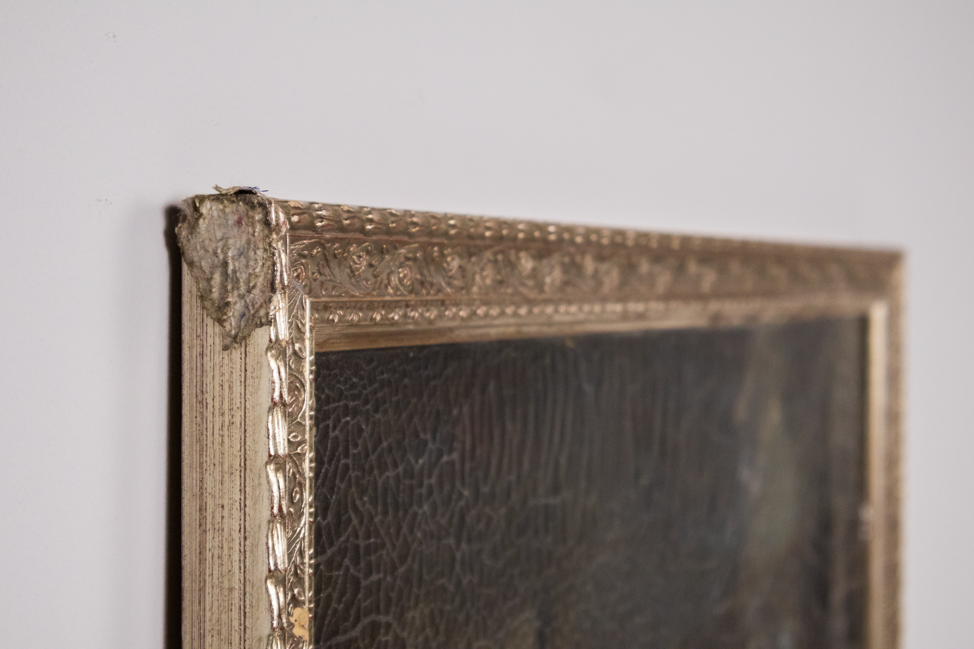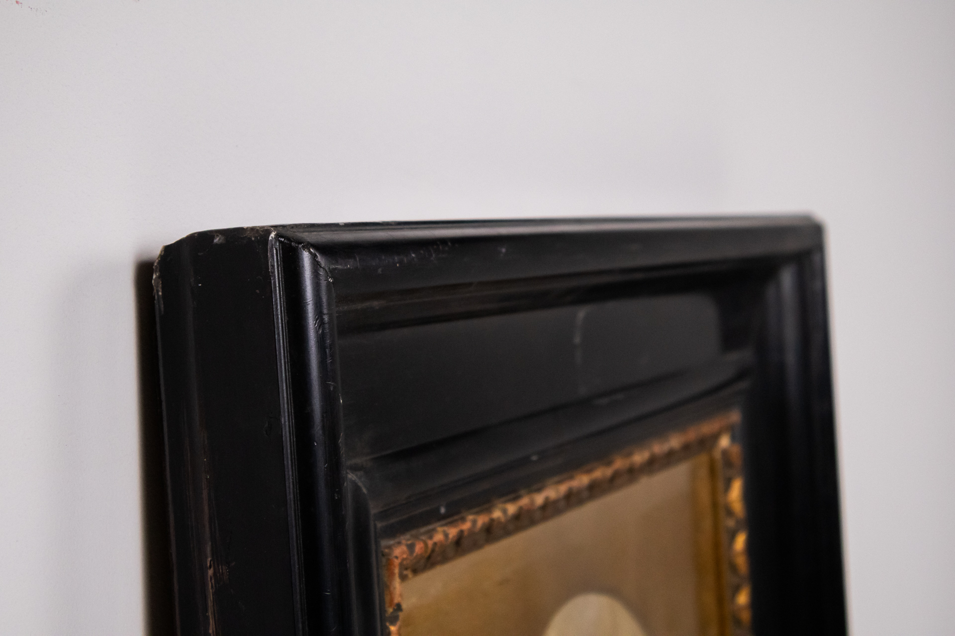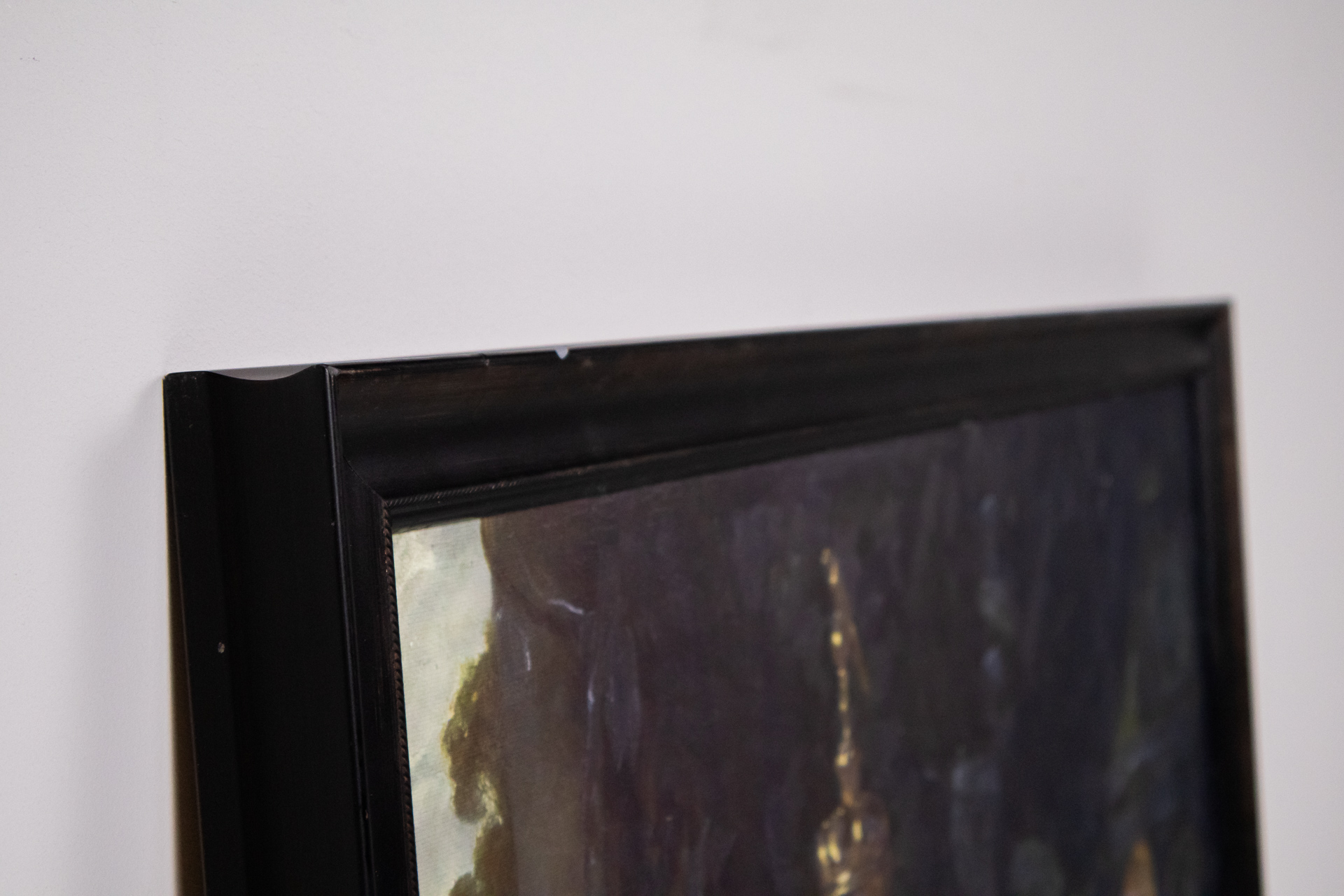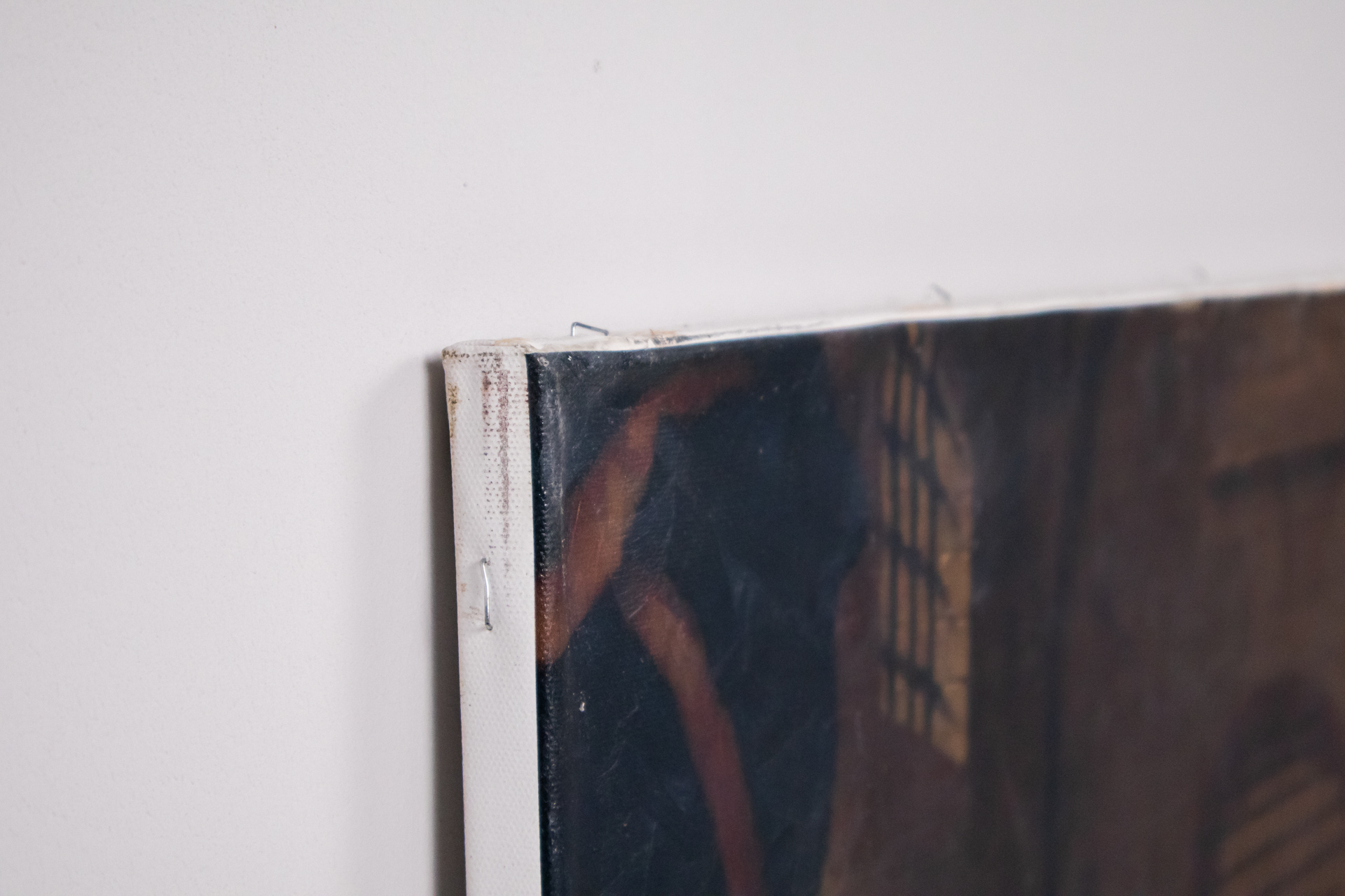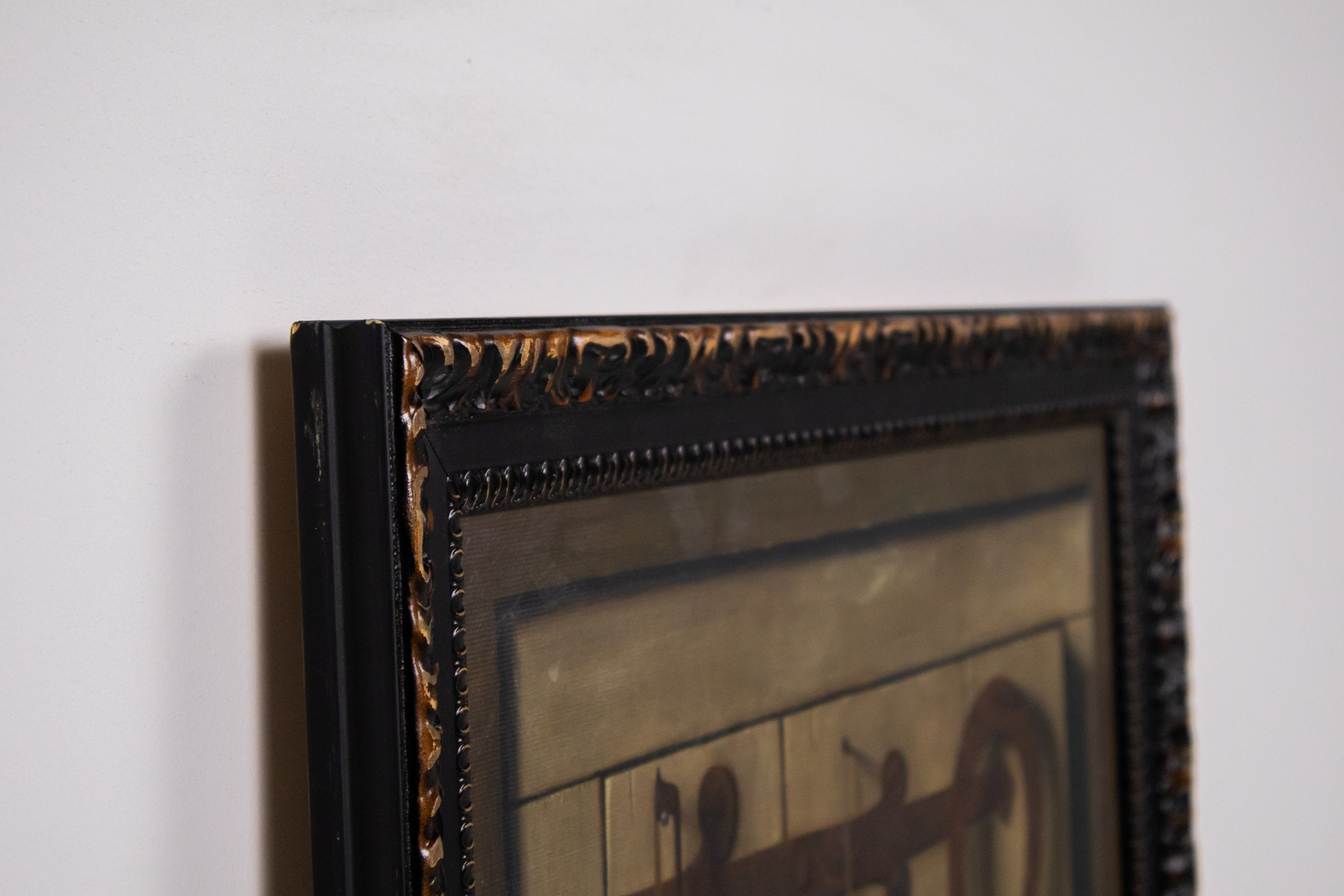 A kép egy férfi portréját ábrázolja, akinek arca részben homályos, a háttér sötét tónusú. A festmény olajjal készült, a felület repedezett, ami az idő múlásának nyomait mutatja. A keret fekete színű, aranyozott...