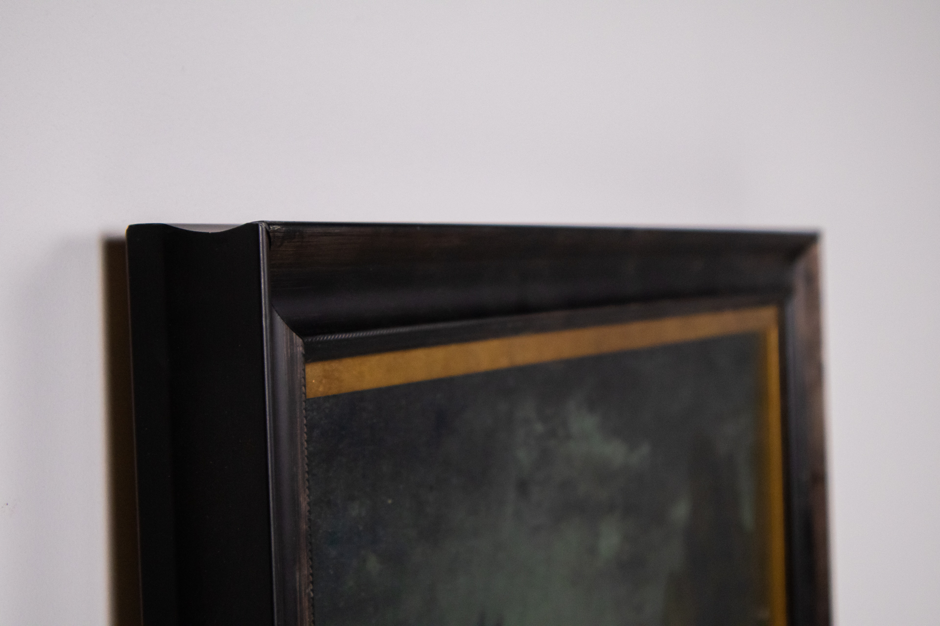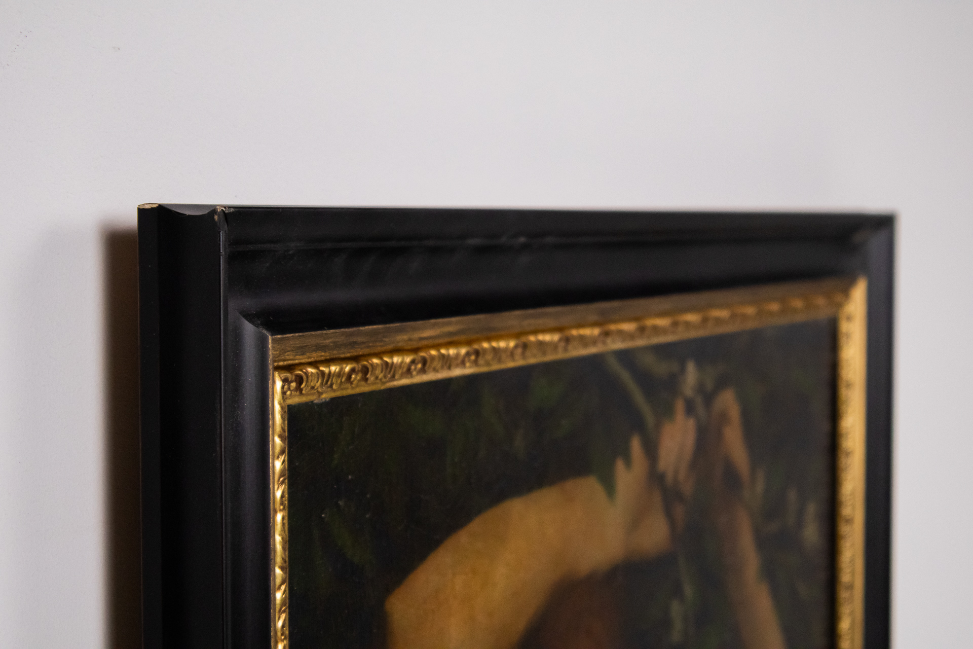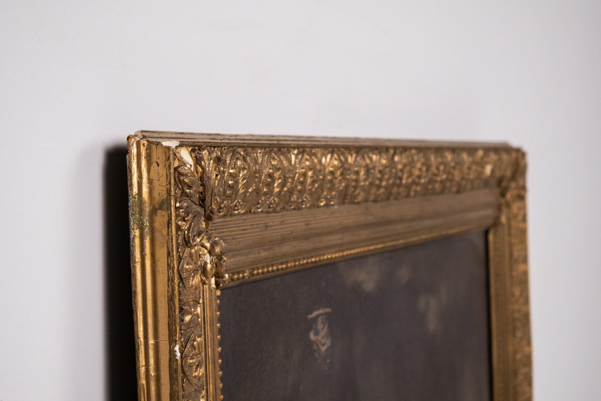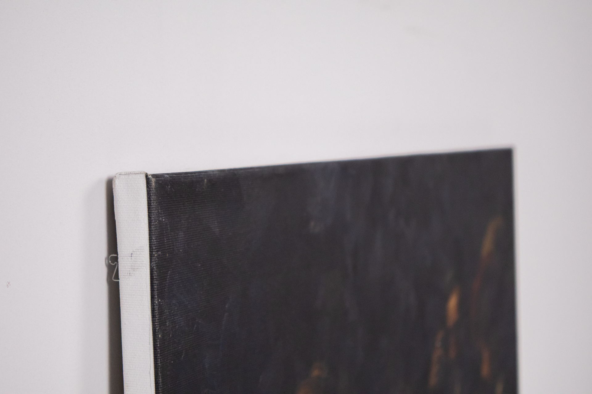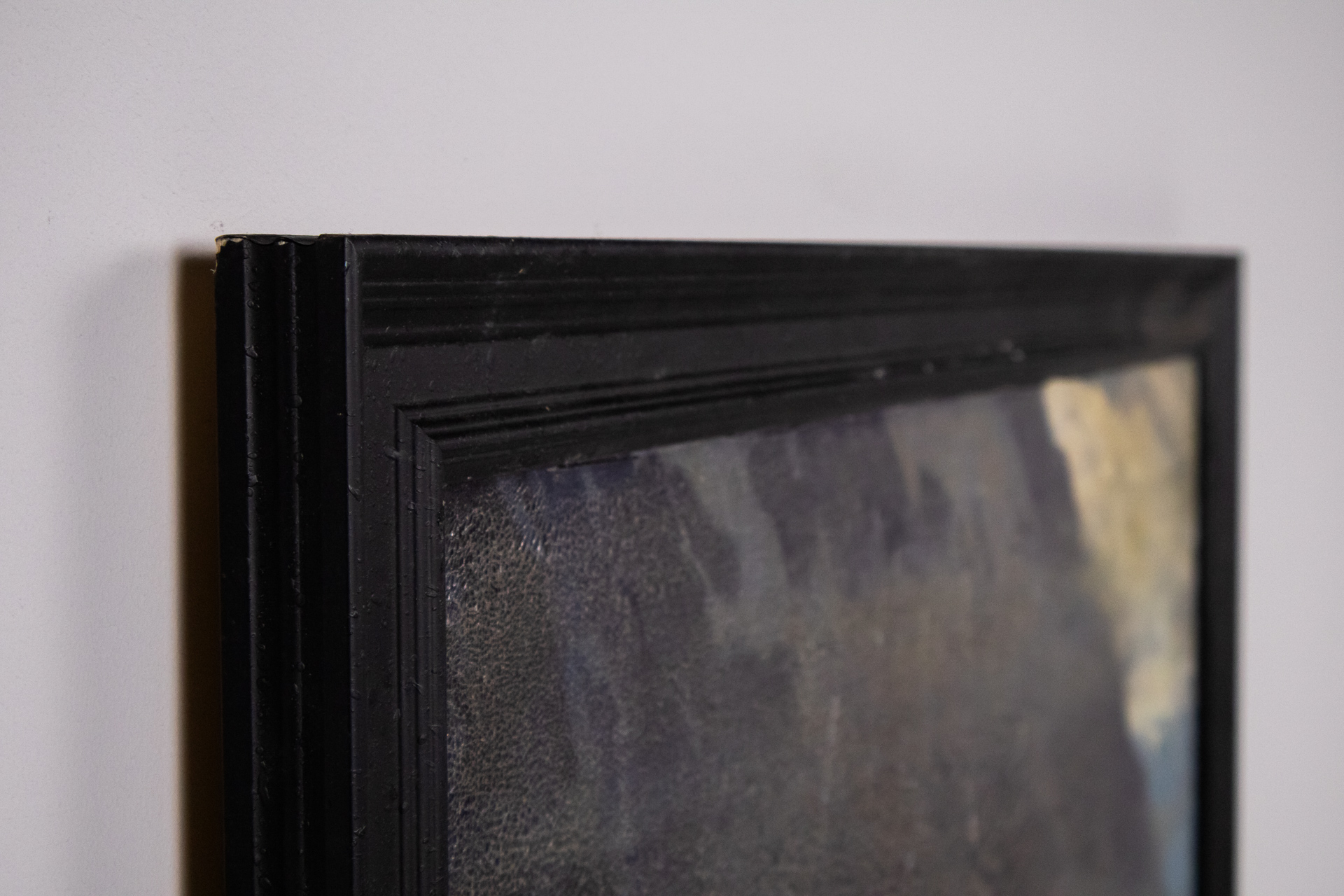A kép egy férfi portréját ábrázolja, akinek arca részben homályos, a háttér sötét tónusú. A festmény olajjal készült, a felület repedezett, ami az idő múlásának nyomait mutatja. A keret fekete színű, aranyozott...