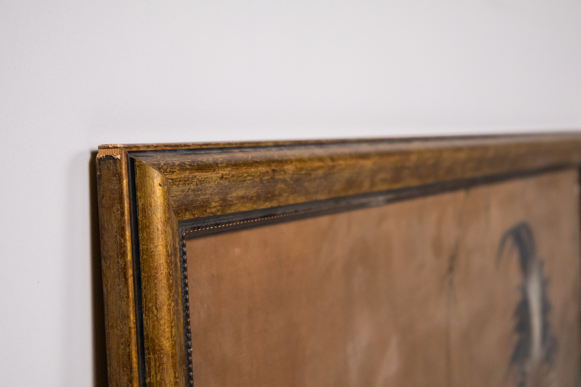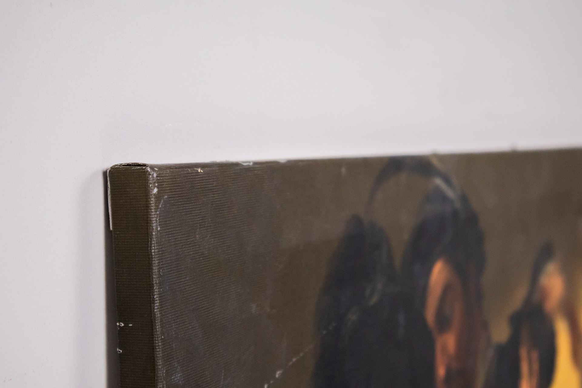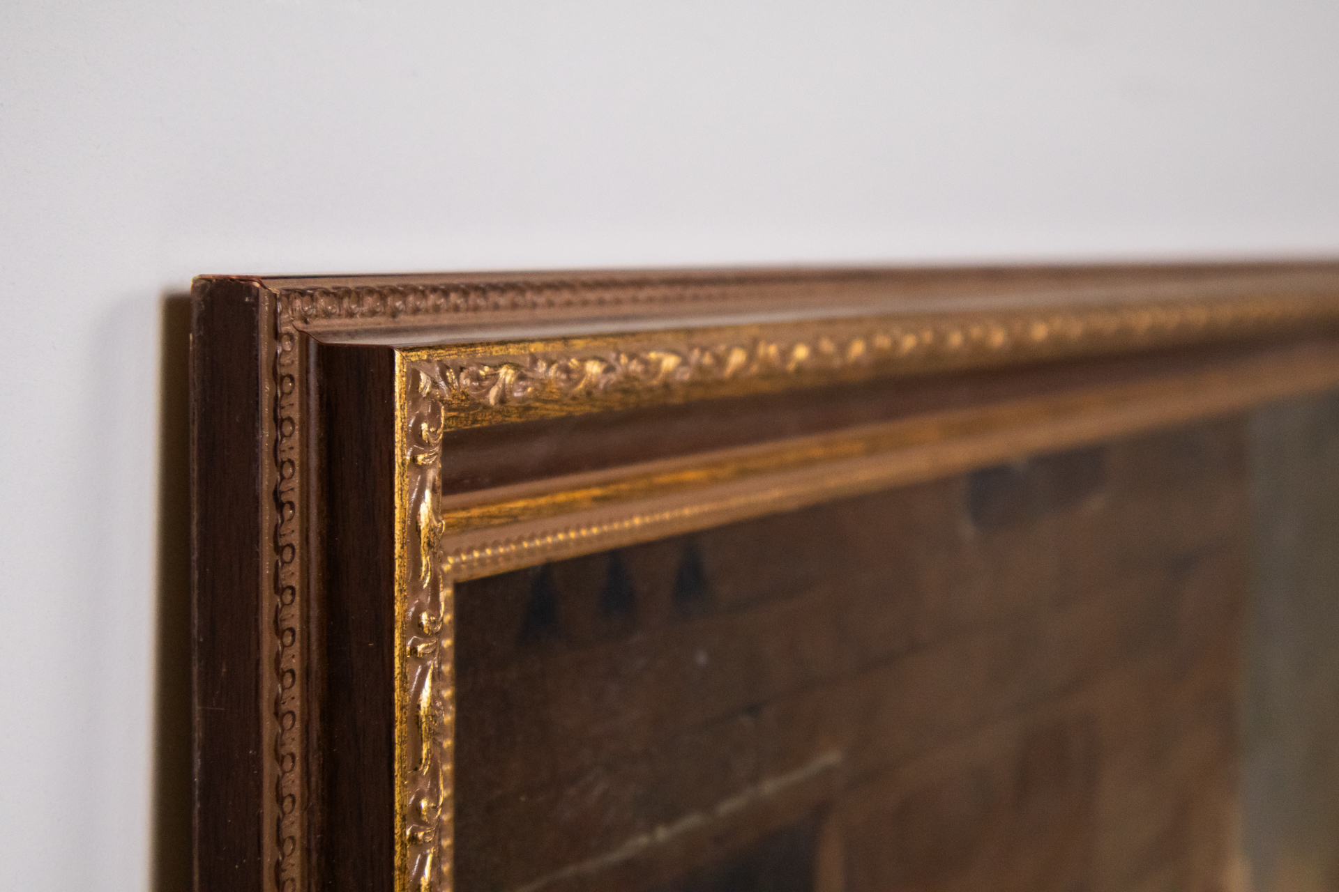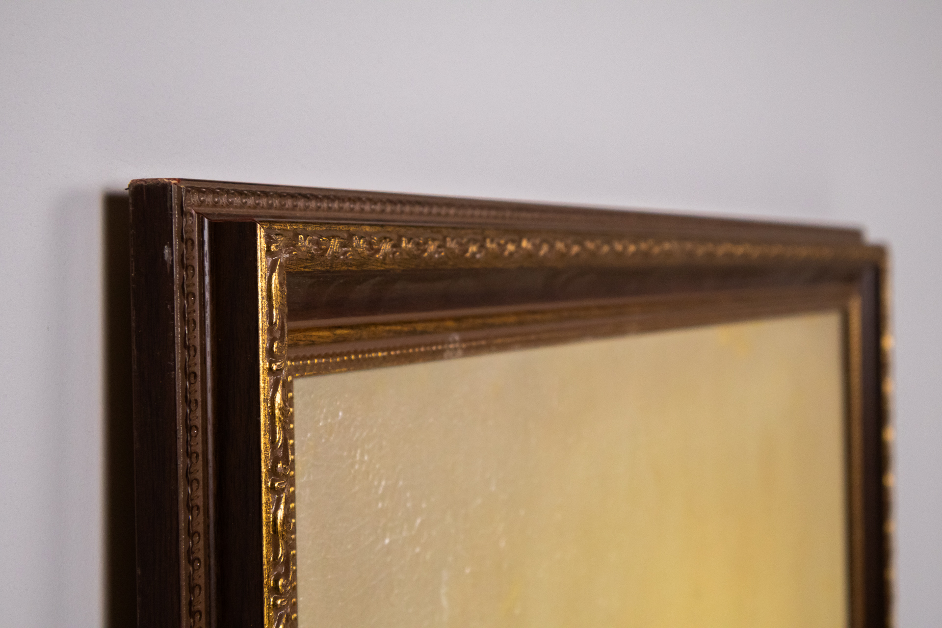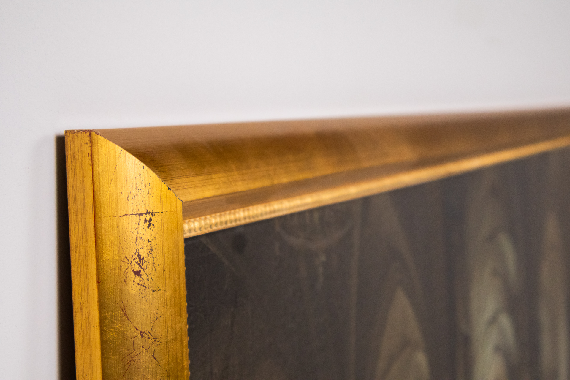 A kép egy férfi portréját ábrázolja, akinek arca részben homályos, a háttér sötét tónusú. A festmény olajjal készült, a felület repedezett, ami az idő múlásának nyomait mutatja. A keret fekete színű, aranyozott...