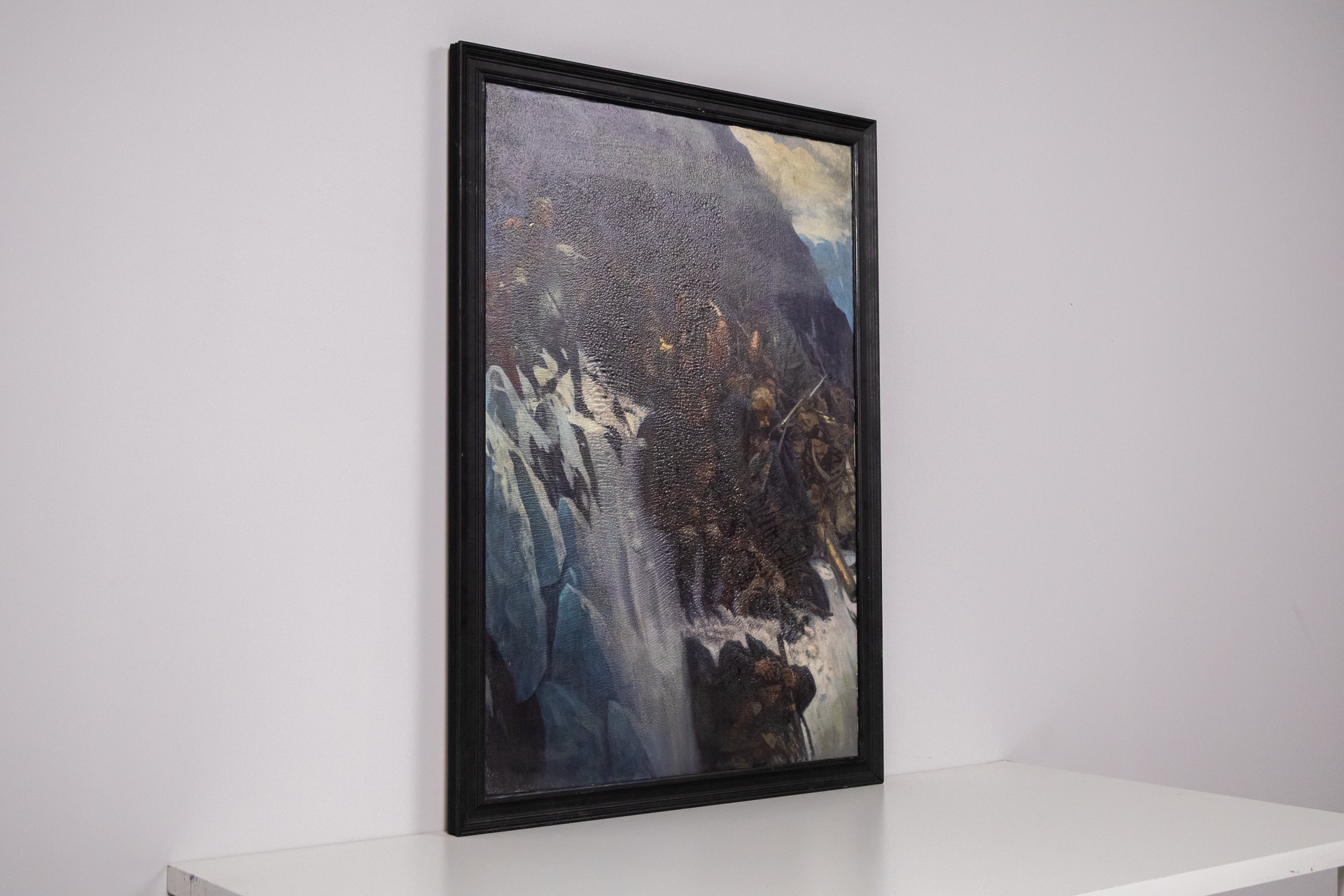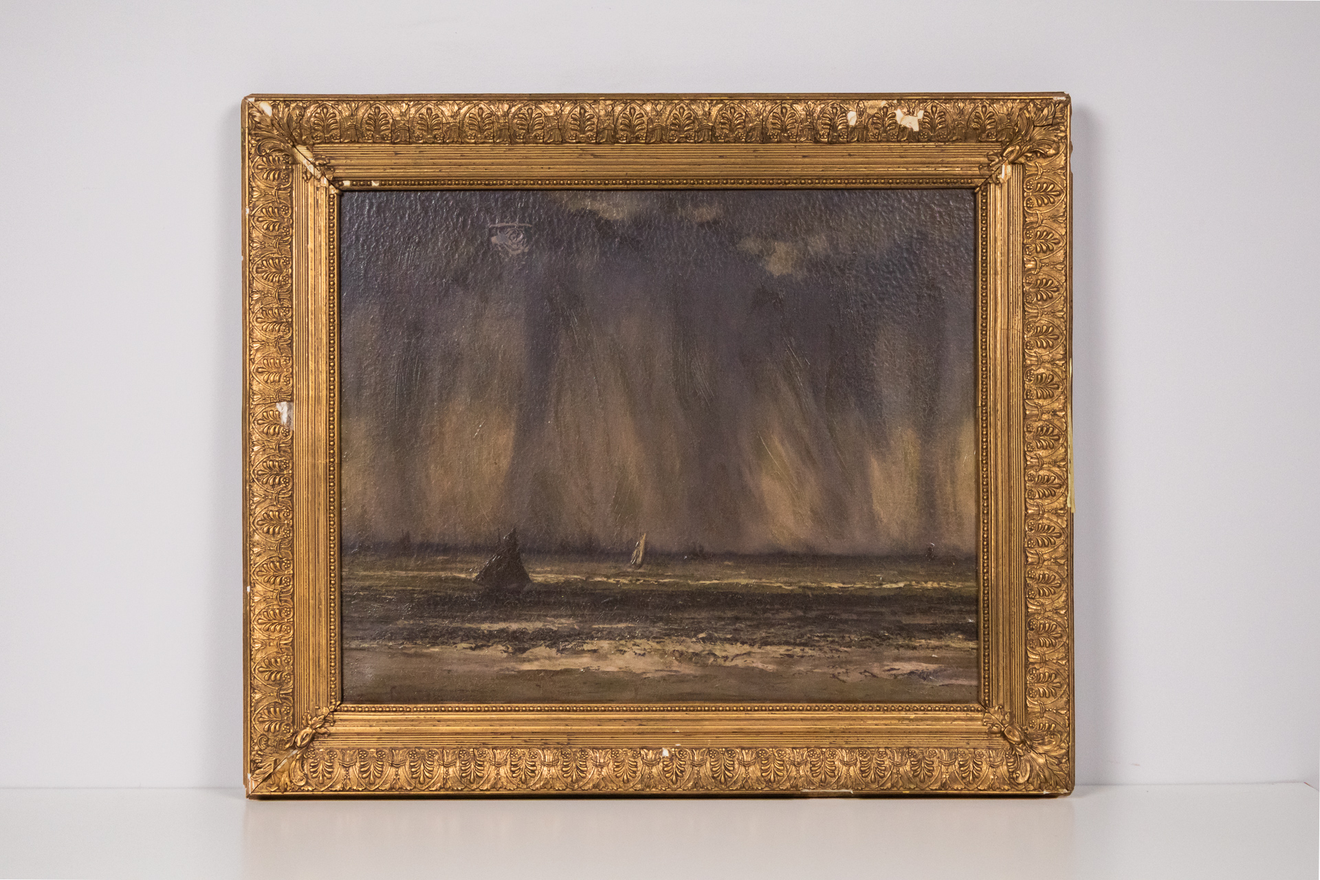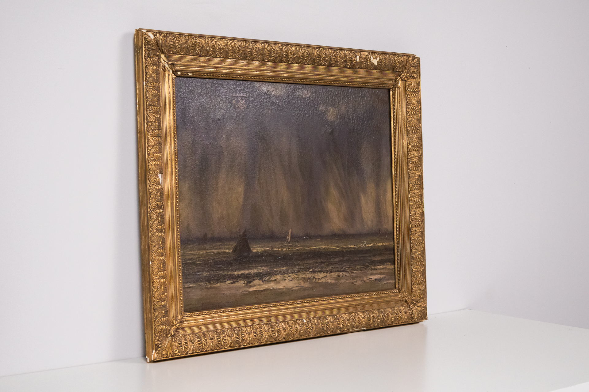 Romantikus stílusú tájkép, amely egy viharos tengert ábrázol. A sötét felhők és a hullámzó víz dinamikus mozgást sugall, a képen hajók láthatók, amelyek küzdenek a viharban. Az olajfestmény sötétkék, szürke és zöld...