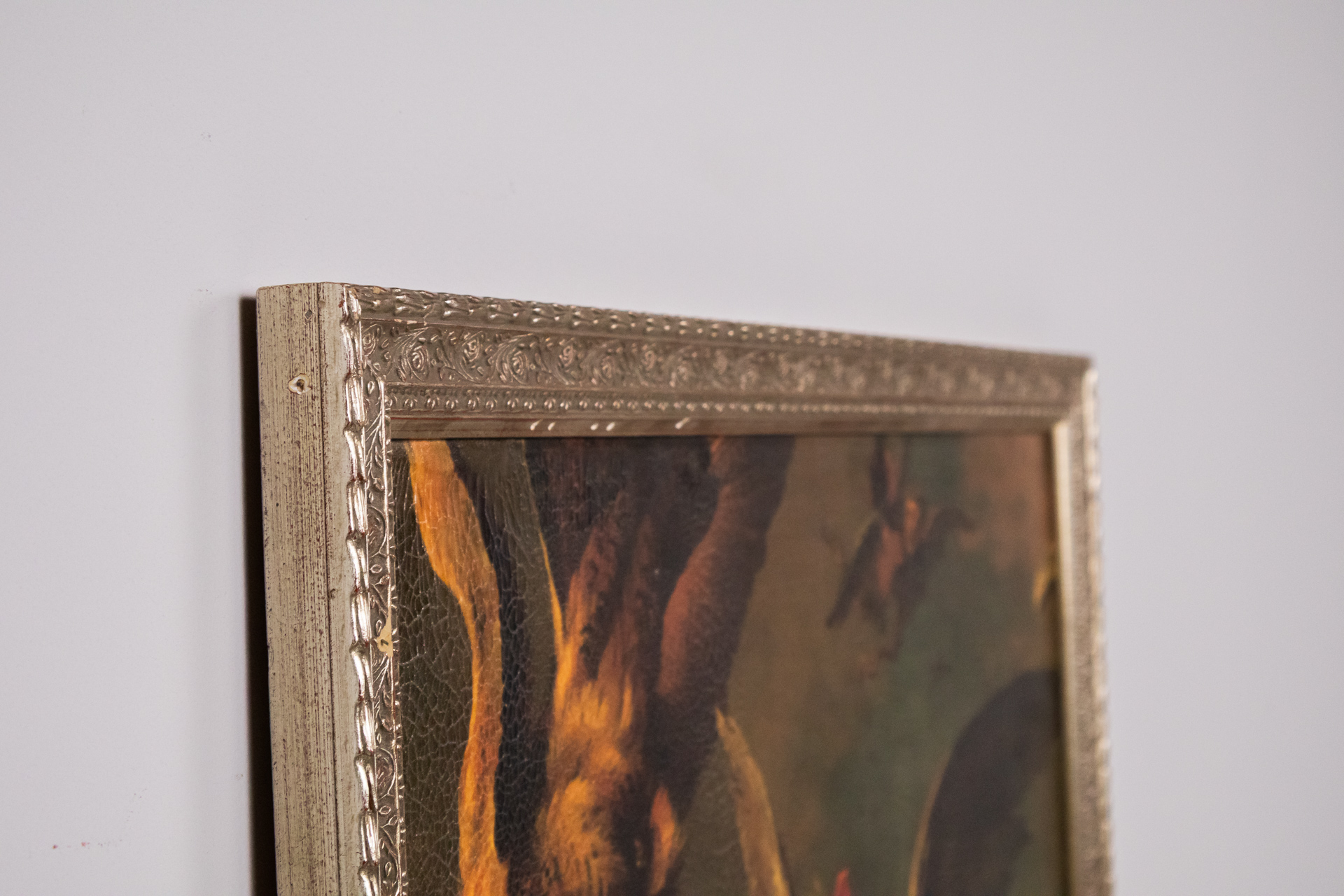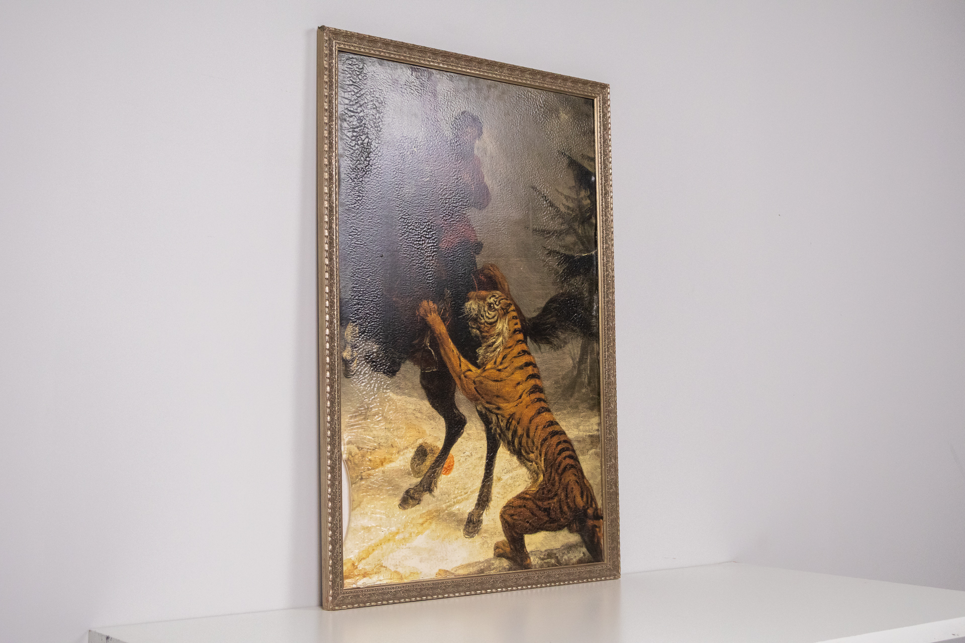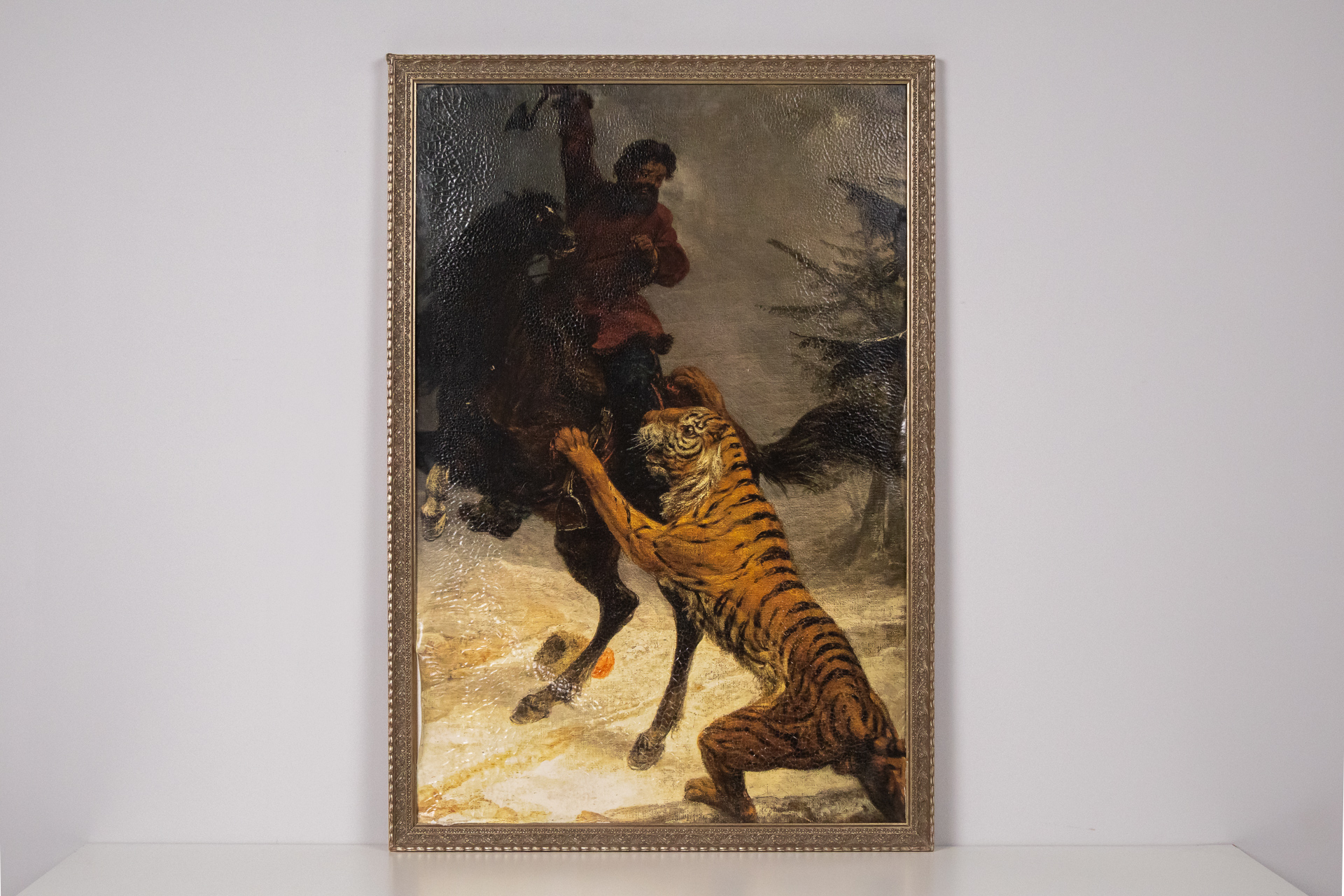 A festmény egy lovas és egy tigris küzdelmét ábrázolja, dinamikus mozdulatokkal és drámai fénnyel. A háttérben sötét erdő látható, amely fokozza a feszültséget. A festmény olajjal készült, vastag ecsetvonásokkal, a...