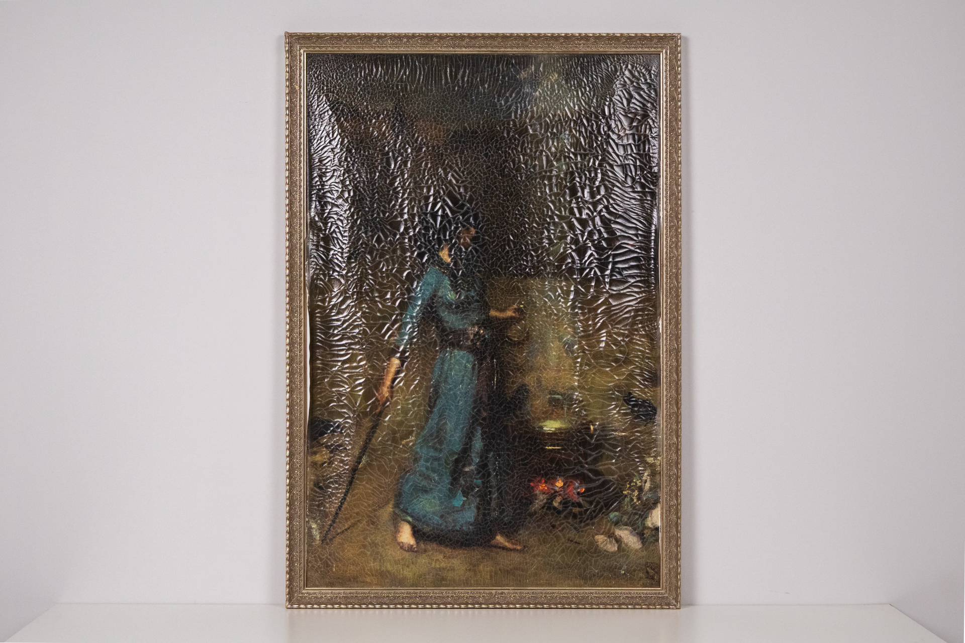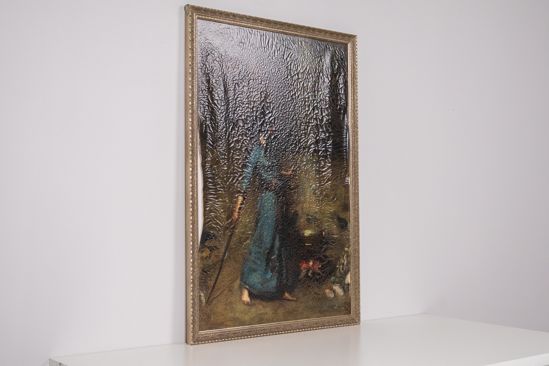 A festmény egy női alakot ábrázol, aki egy botot tart a kezében, valószínűleg egy tűz körül áll. A háttérben sötét tónusok dominálnak, míg a női figura világosabb kék színben van megfestve. Az alkotás részletei...