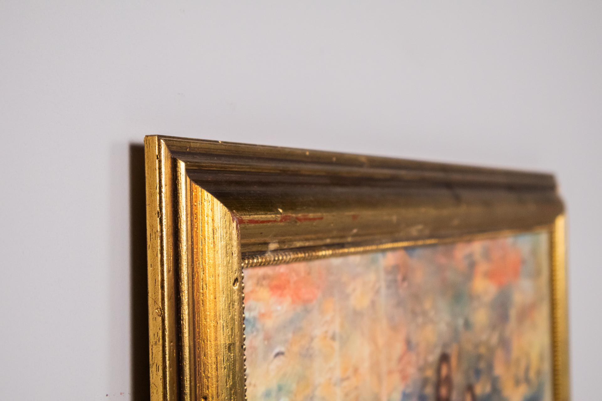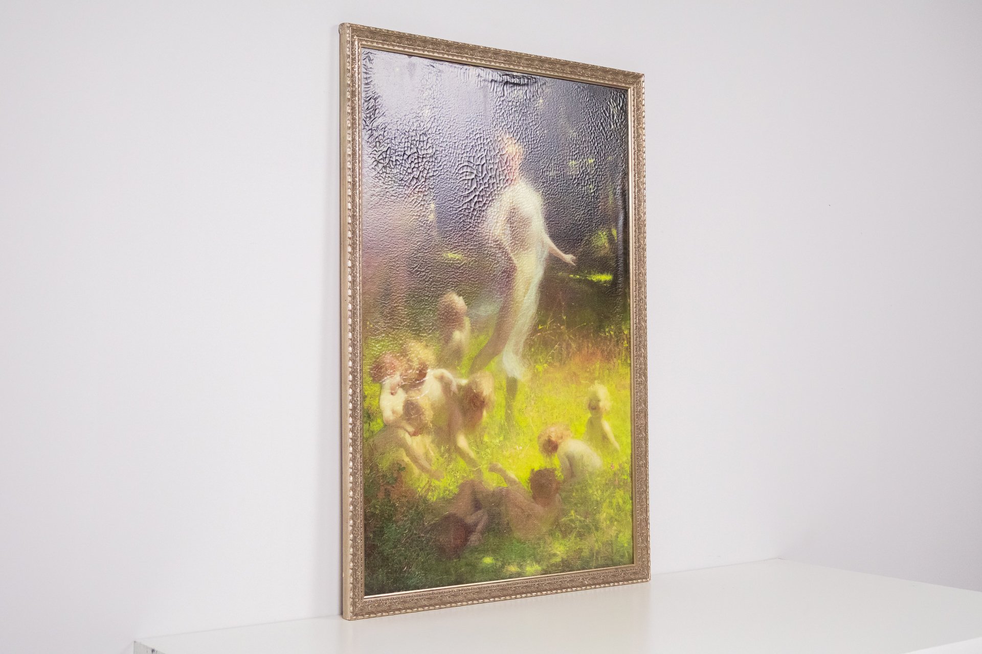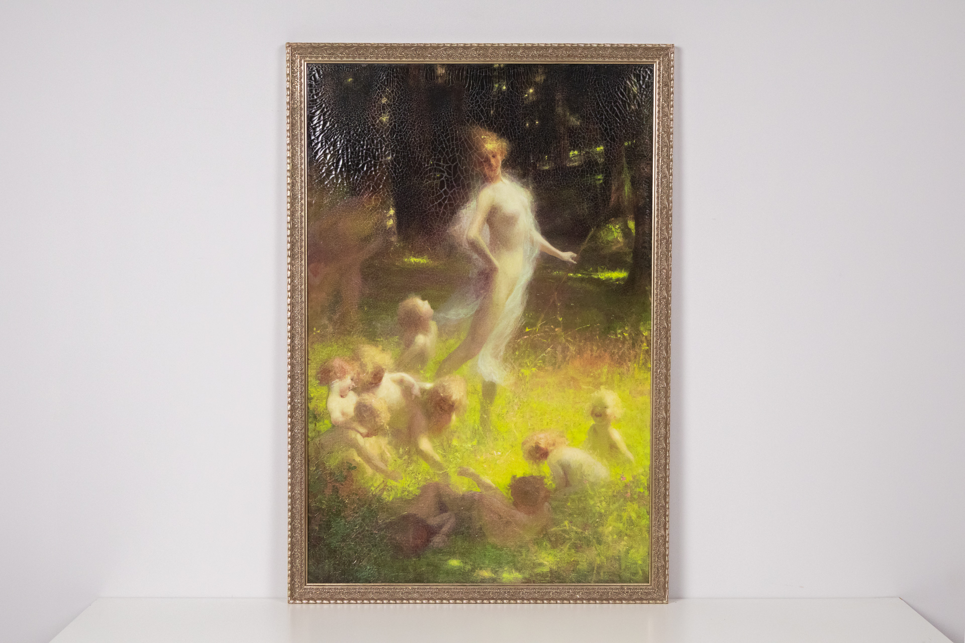 Romantikus stílusú festmény, amely egy női alakot és gyermekeket ábrázol, amint a természetben játszanak. A kép lágy, elmosódott hatású, a színek főként zöldek és sárgák, a fény és árnyék játékával. Az aranyozott...